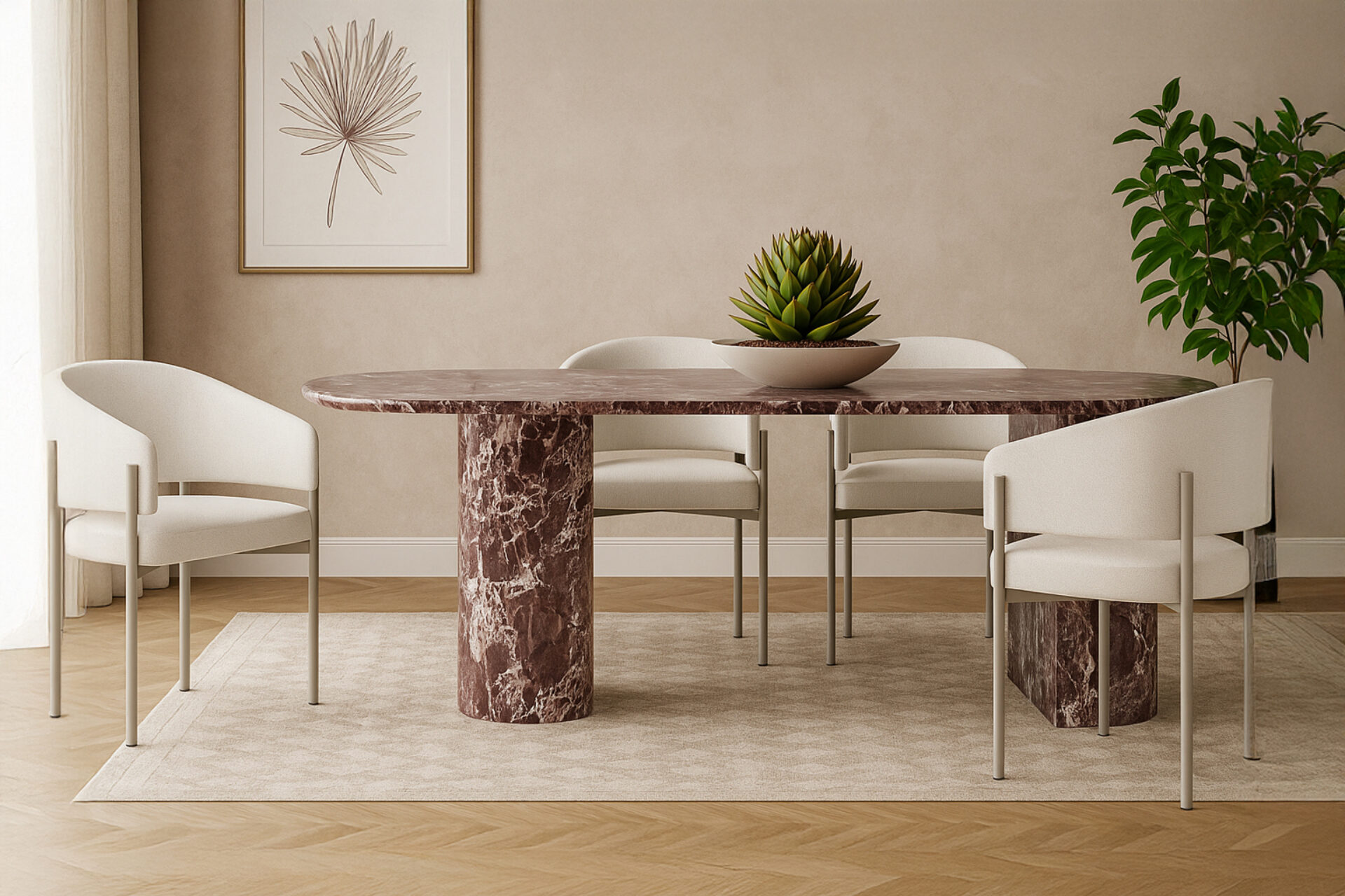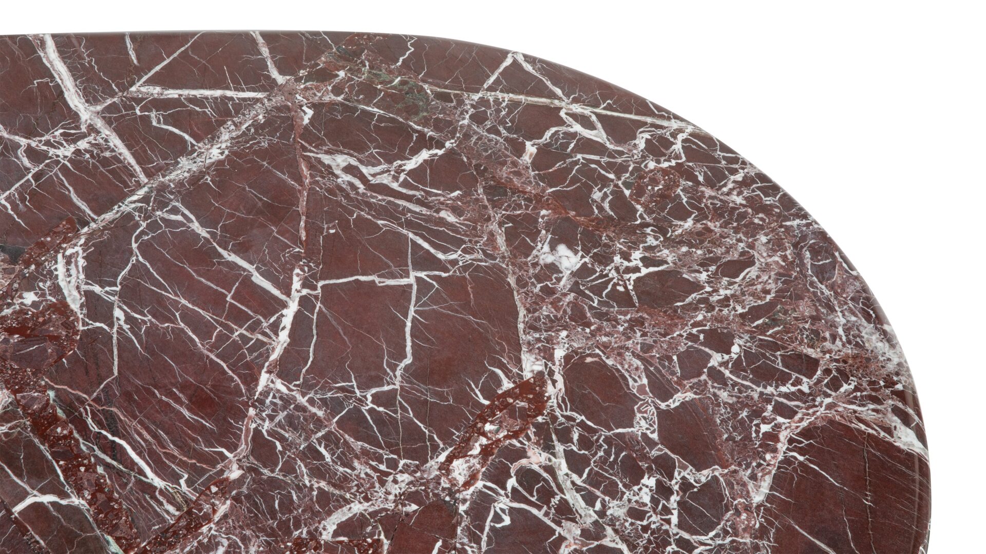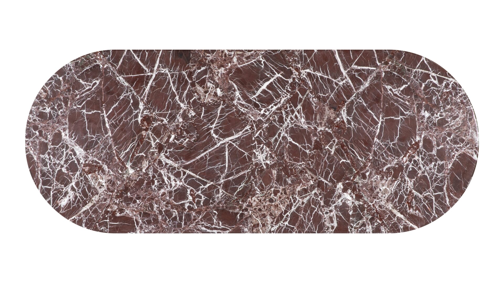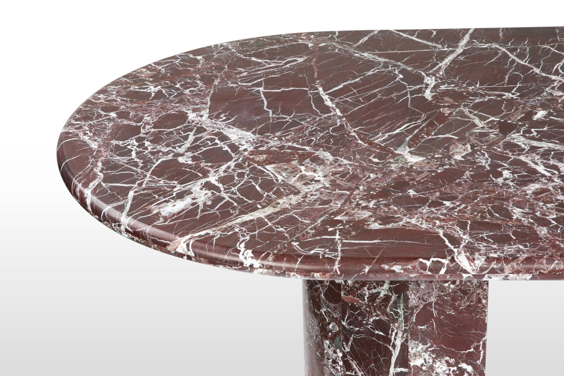 Elevate your dining experience with the luxurious Dante dining table, featuring exquisite Rosso Levanto Marble. Standing as the ultimate statement piece, this modern twist on the traditional double pedestal table adds a contemporary touch to upscale interiors. With unique variations in appearance, including distinct color patterns and natural veining, this opulent piece exudes classic elegance redefined for modern living.