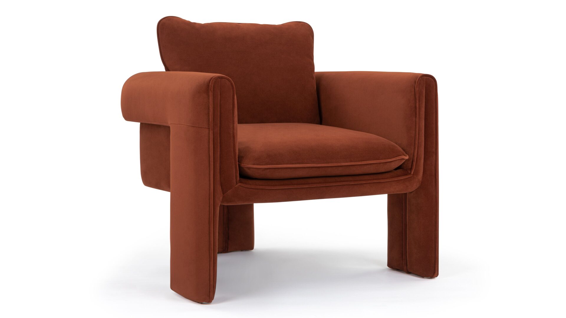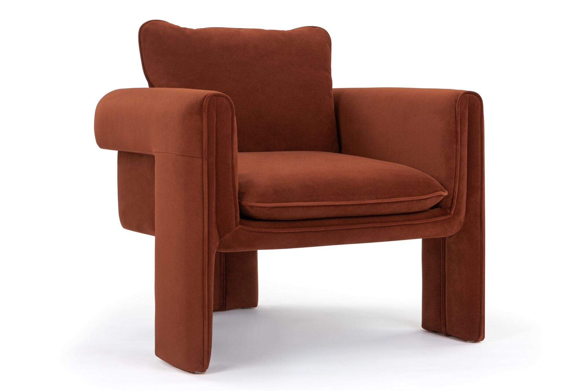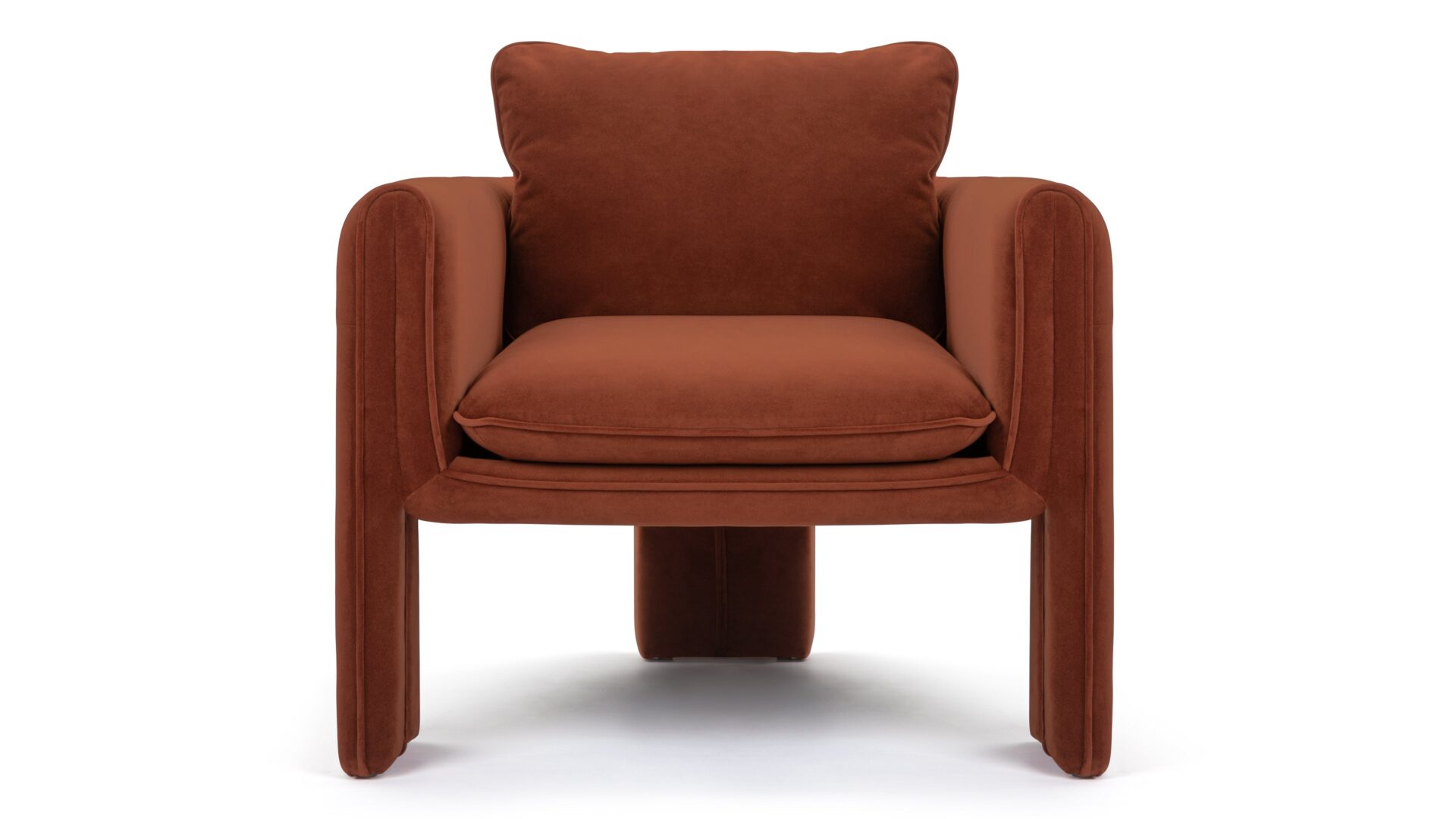 Experience the captivating charm of the de Luz Armchair, featuring a modern Italian flair. It blends luxurious rust-colored velvet with a sleek, 3-legged design for a stylish statement piece. This chair's minimalist elegance ensures it shines in any earth-toned, cozy setting.