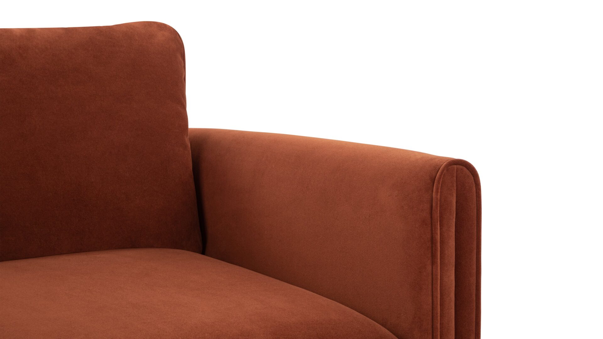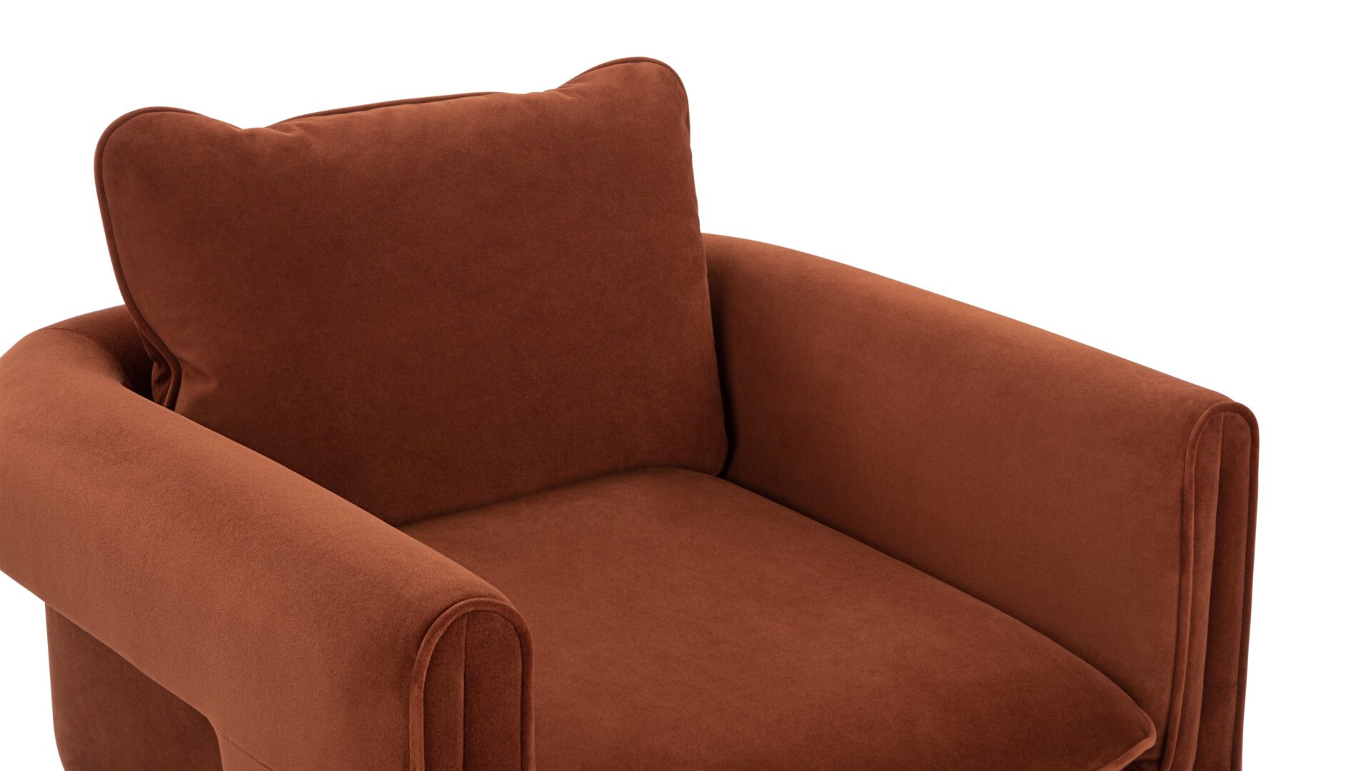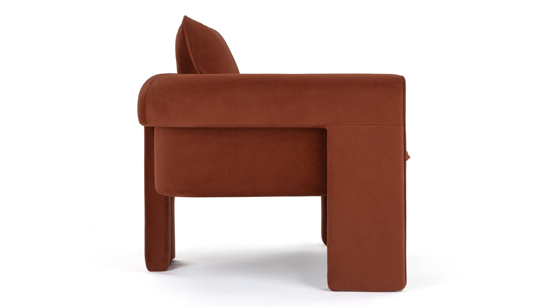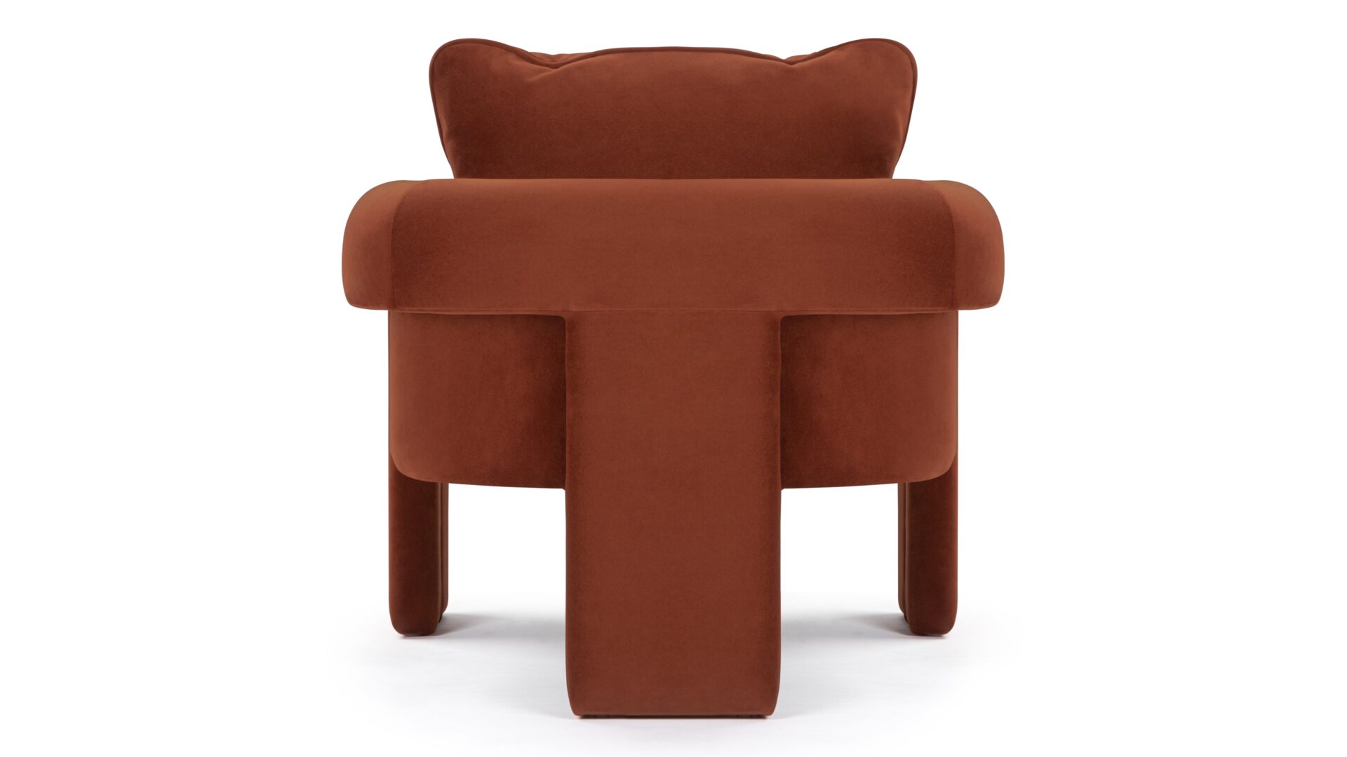 Experience the captivating charm of the de Luz Armchair, featuring a modern Italian flair. It blends luxurious rust-colored velvet with a sleek, 3-legged design for a stylish statement piece. This chair's minimalist elegance ensures it shines in any earth-toned, cozy setting.
