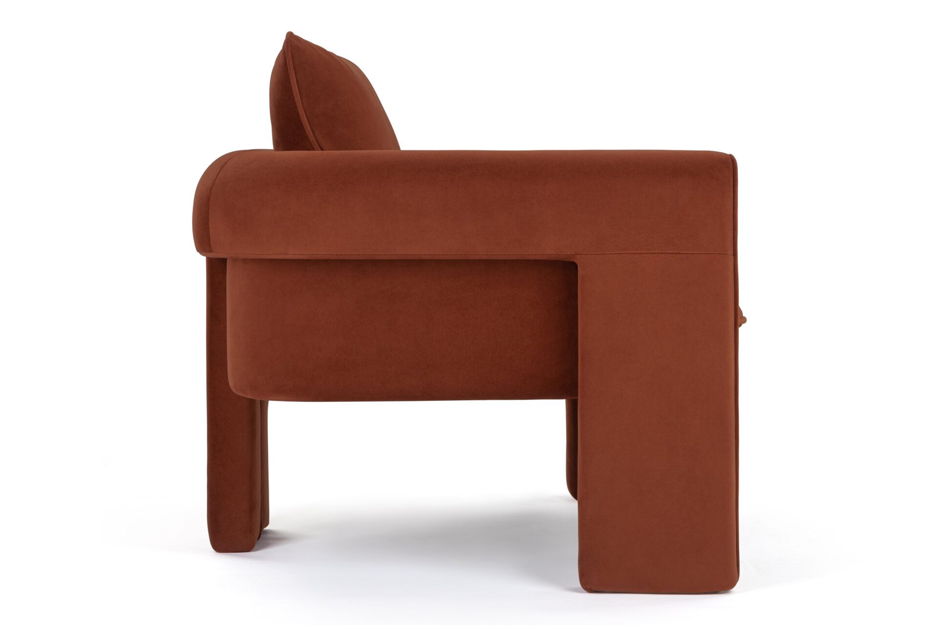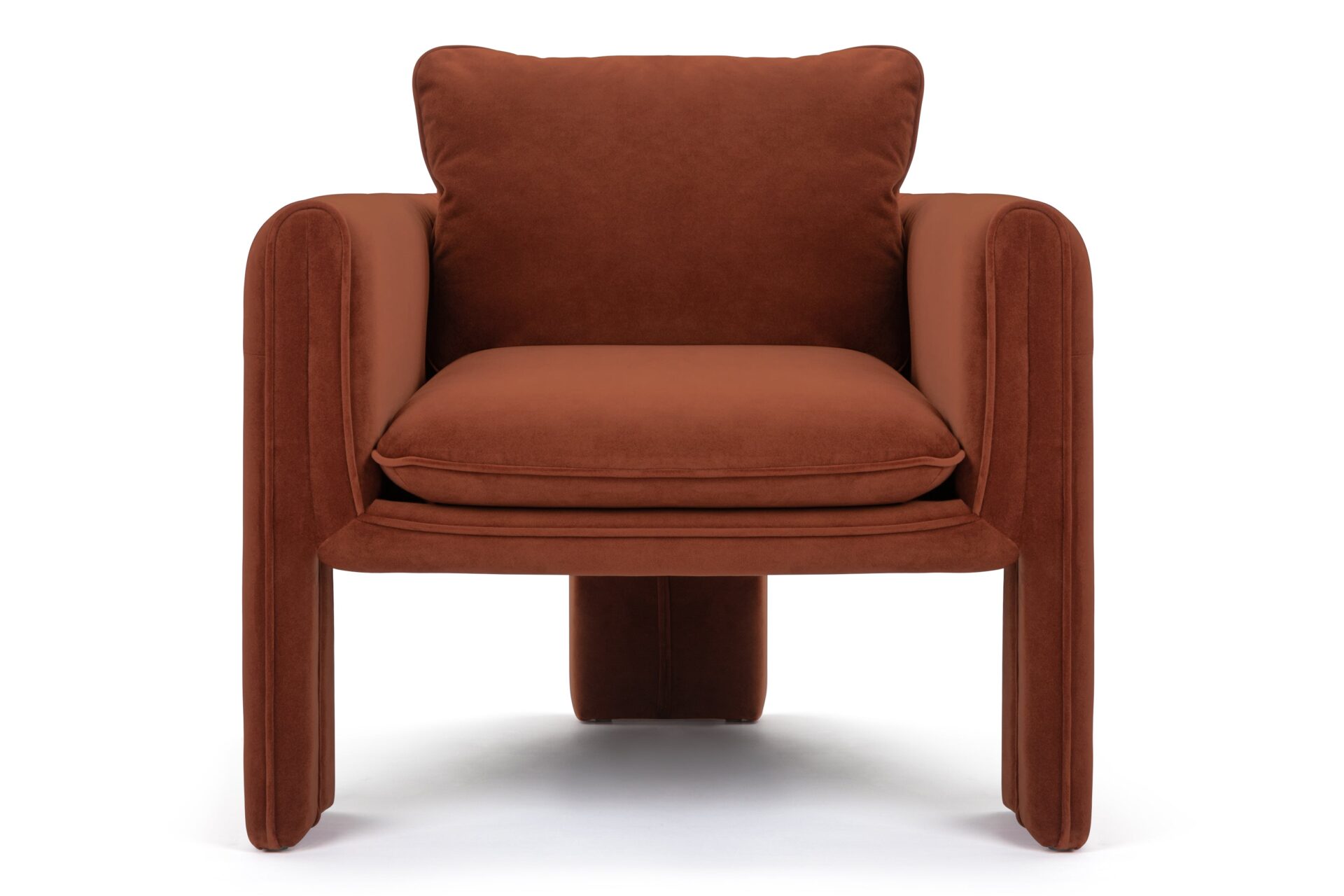 Introducing the De Luz Armchair, a fusion of contemporary Italian design with a unique 3-legged structure that exudes a sleek and minimalistic look, perfect for both standalone placement and group configurations. Upholstered in a luxurious rust-colored velvet fabric and generously padded for comfort, this chair features a cushioned backrest that conforms to your body, optimizing relaxation. With its minimalist yet elegant silhouette, the De Luz Armchair seamlessly complements modern interiors, offering both functionality and style.