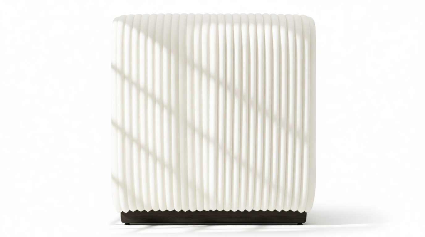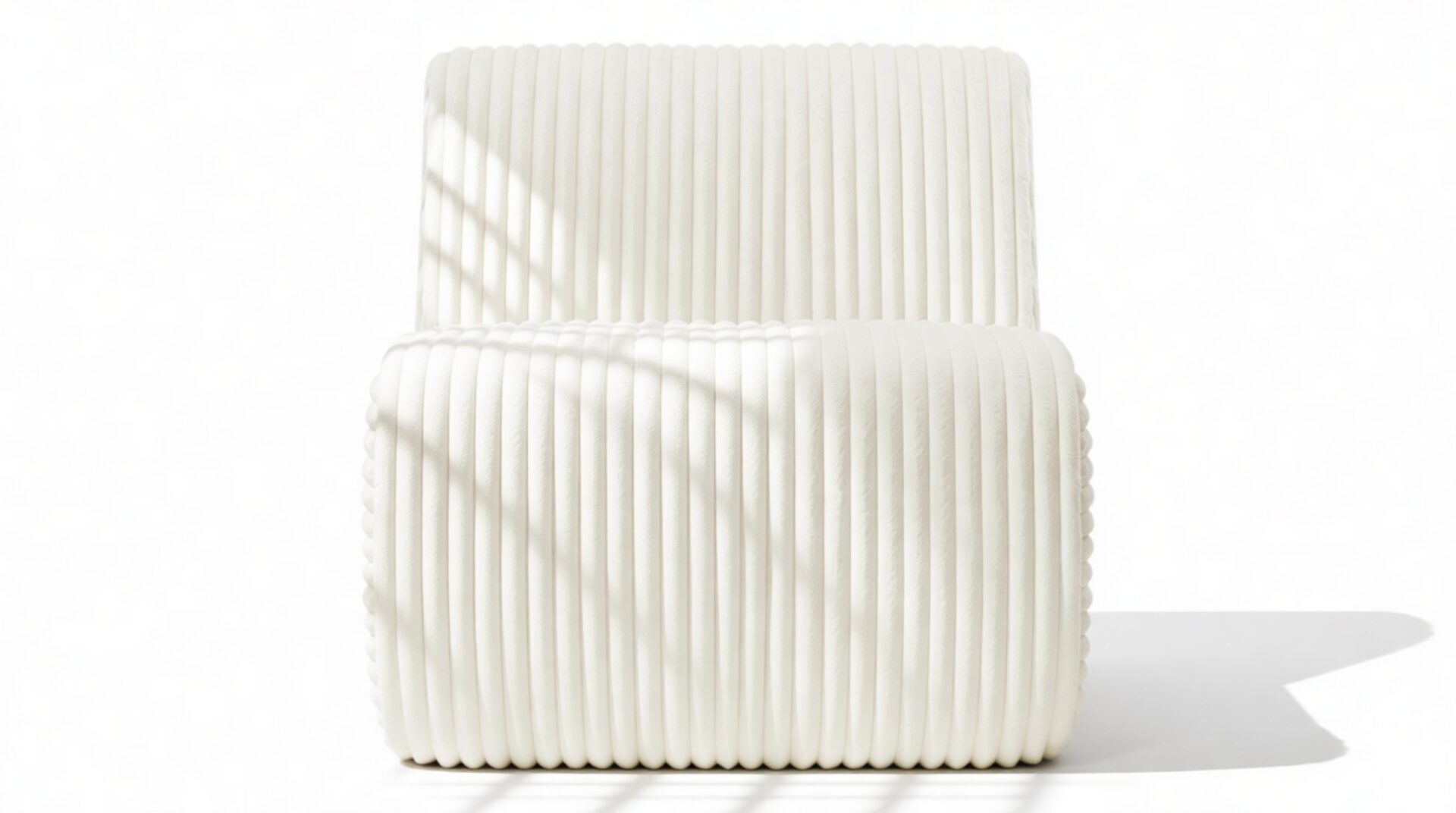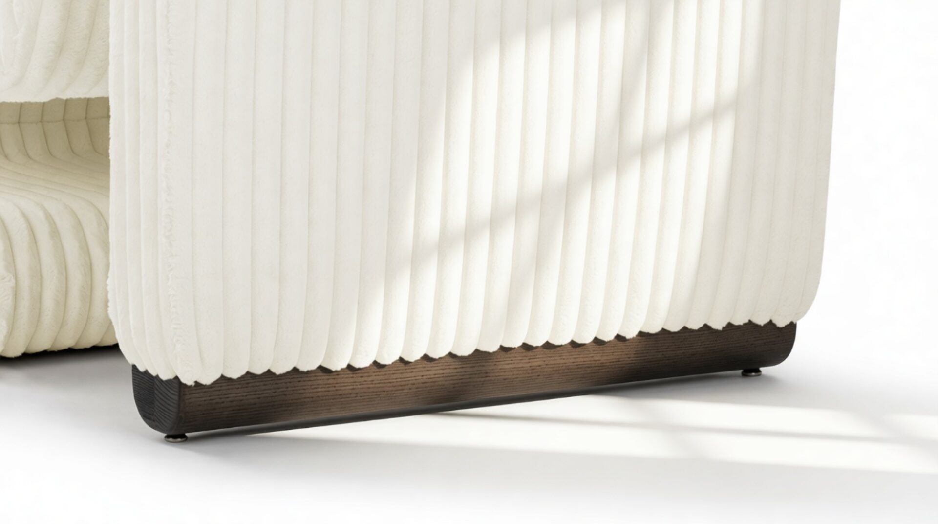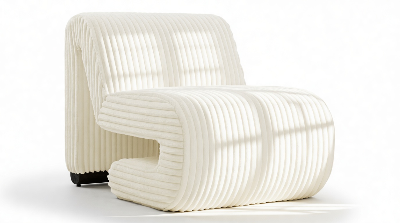Experience the luxurious comfort of the Demeter Lounge Chair featuring a light-colored faux fur upholstery. The pale fabric elegantly contrasts with the rich, dark walnut foot, resulting in a distinctive and sophisticated appearance. The chair's curved edges and elegant repeating vertical seams create a ribbed profile, enhancing both its visual appeal and comfort.