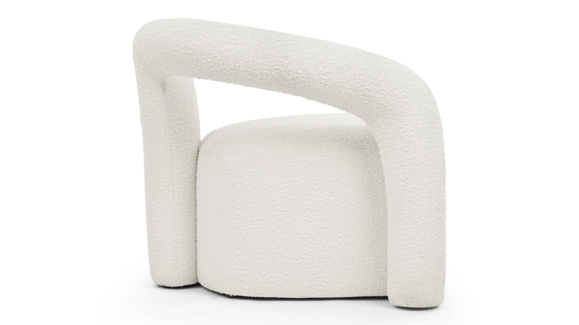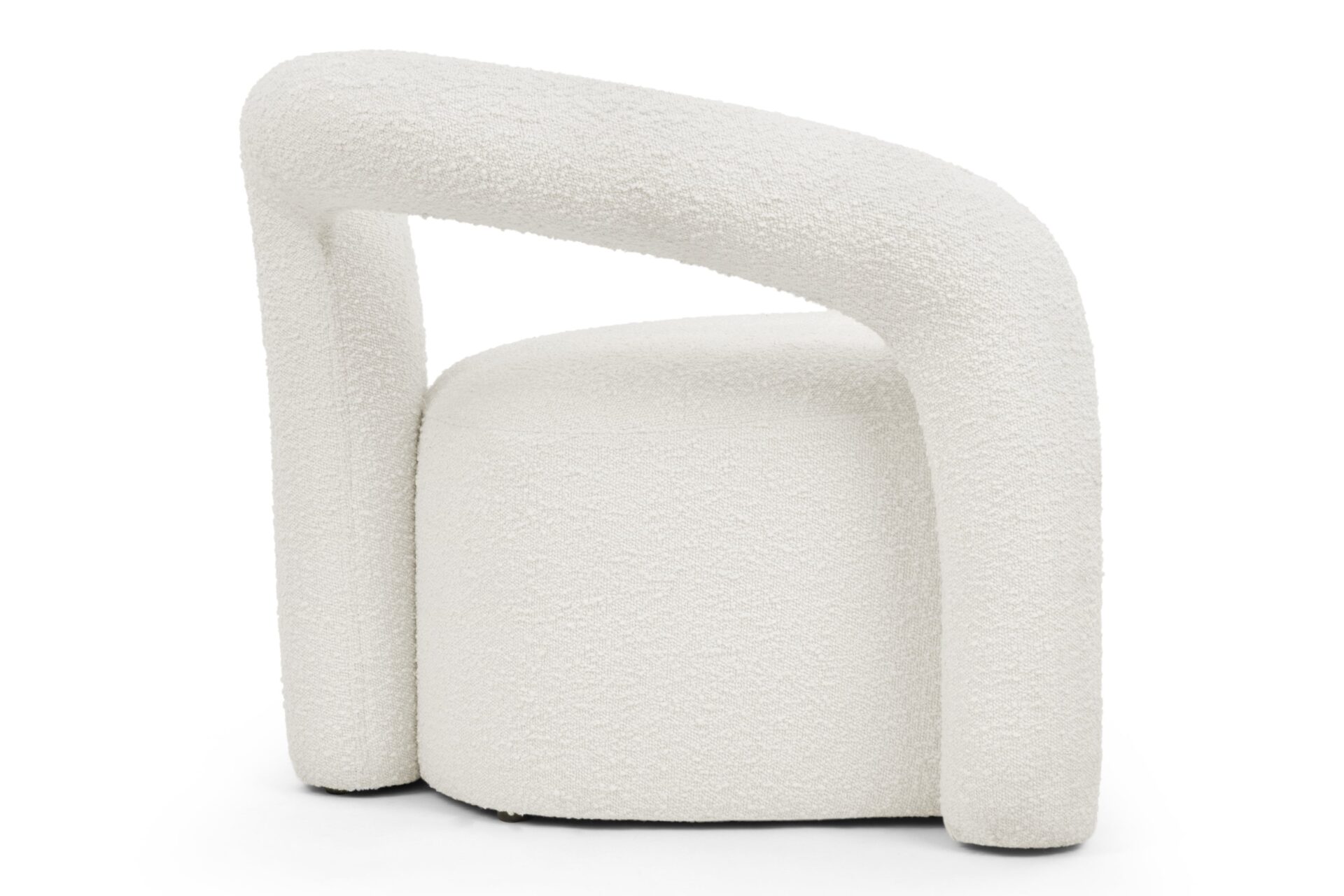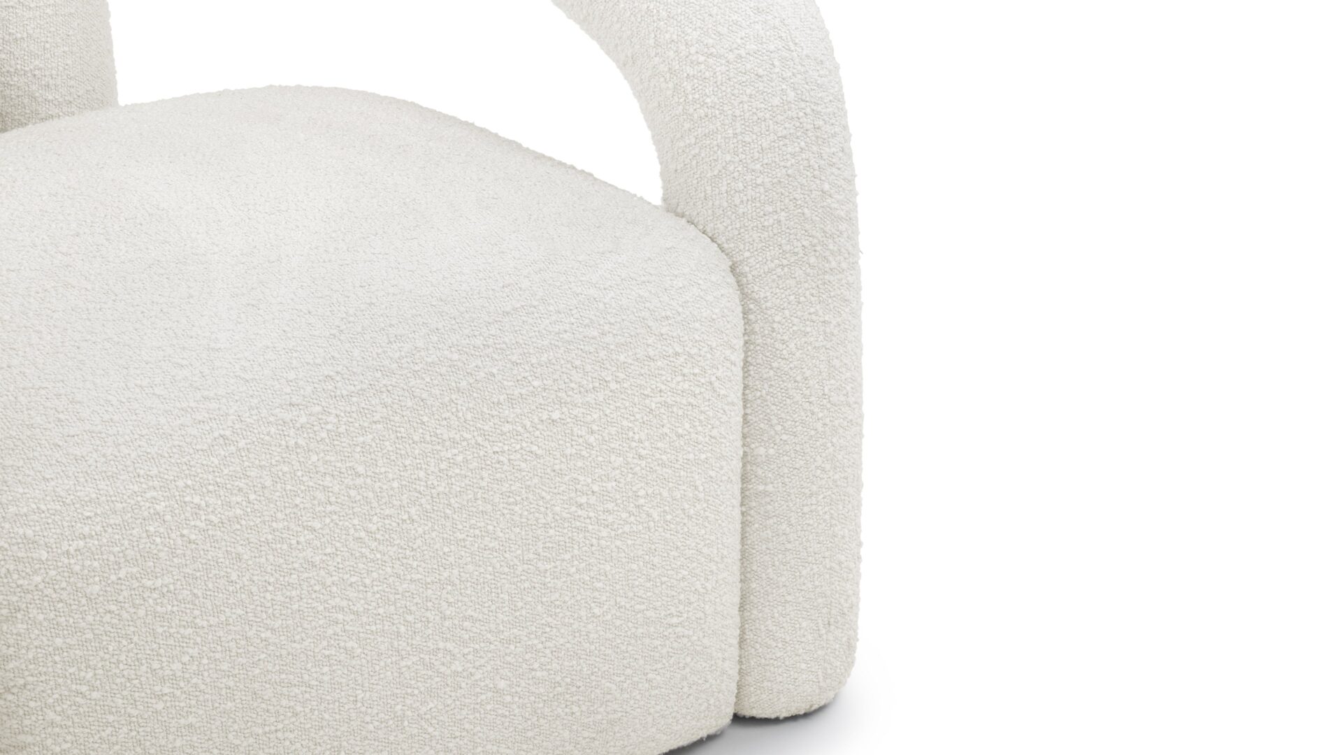 Enhance your space with this chair upholstered in a bouclé fabric, famous for its looped and textured surface that offers comfort and a luxurious look. The inviting warm white hue further elevates its elegant appeal.