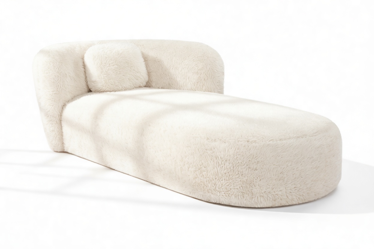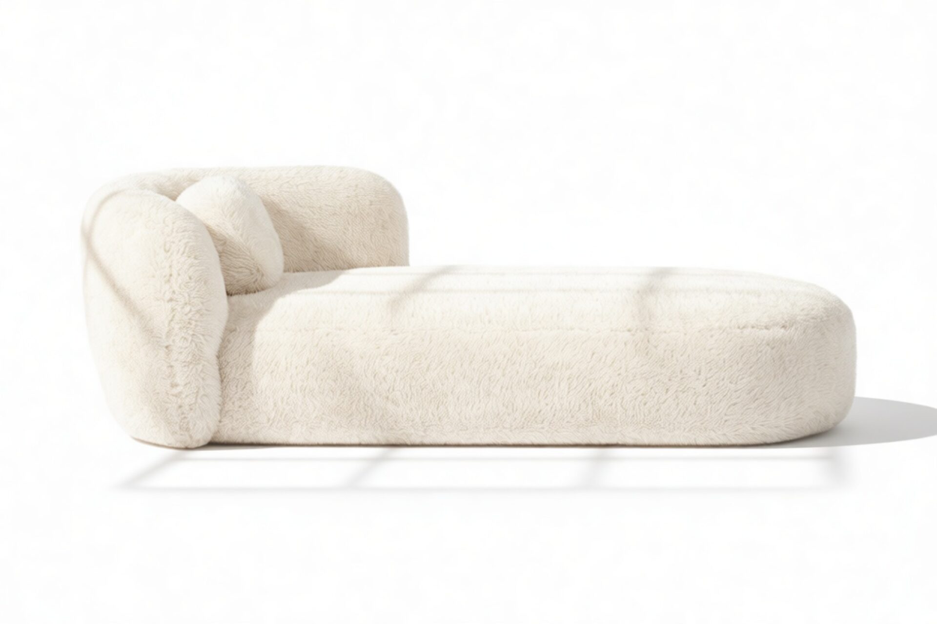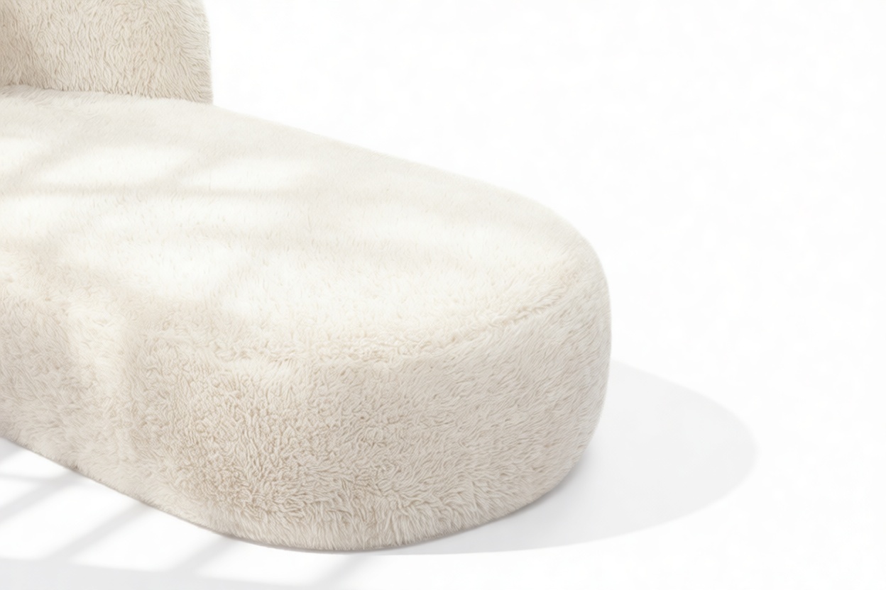 Experience ultimate comfort and modern style with the Diane Daybed. Featuring a plush, long-haired Sherpa upholstery that beckons relaxation, this piece is designed for lounging in style. Crafted with a sturdy solid wood frame for durability and stability, its contemporary rounded design with smooth edges adds to its aesthetic charm. The unique single-armrest seamlessly flowing into a low backrest gives this daybed an elegant silhouette.