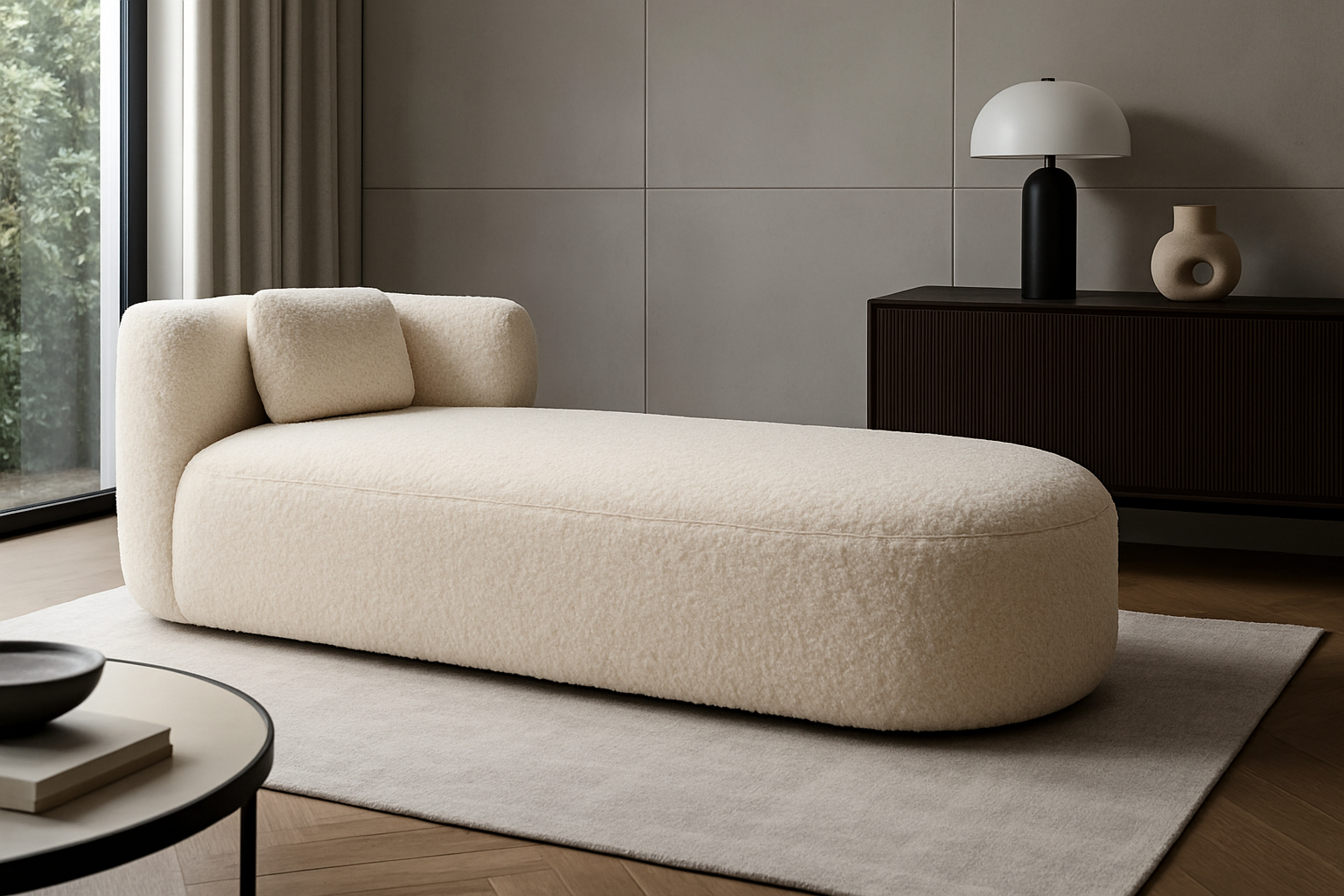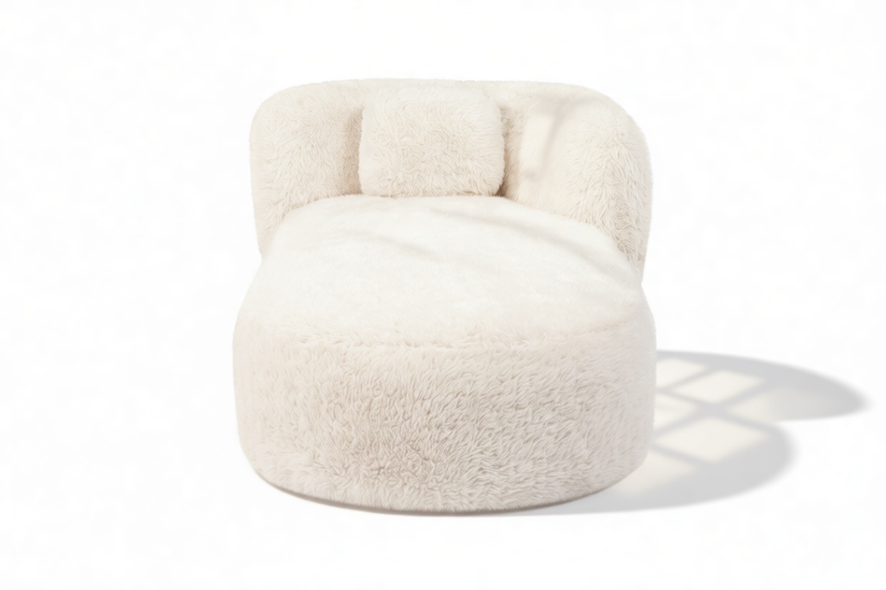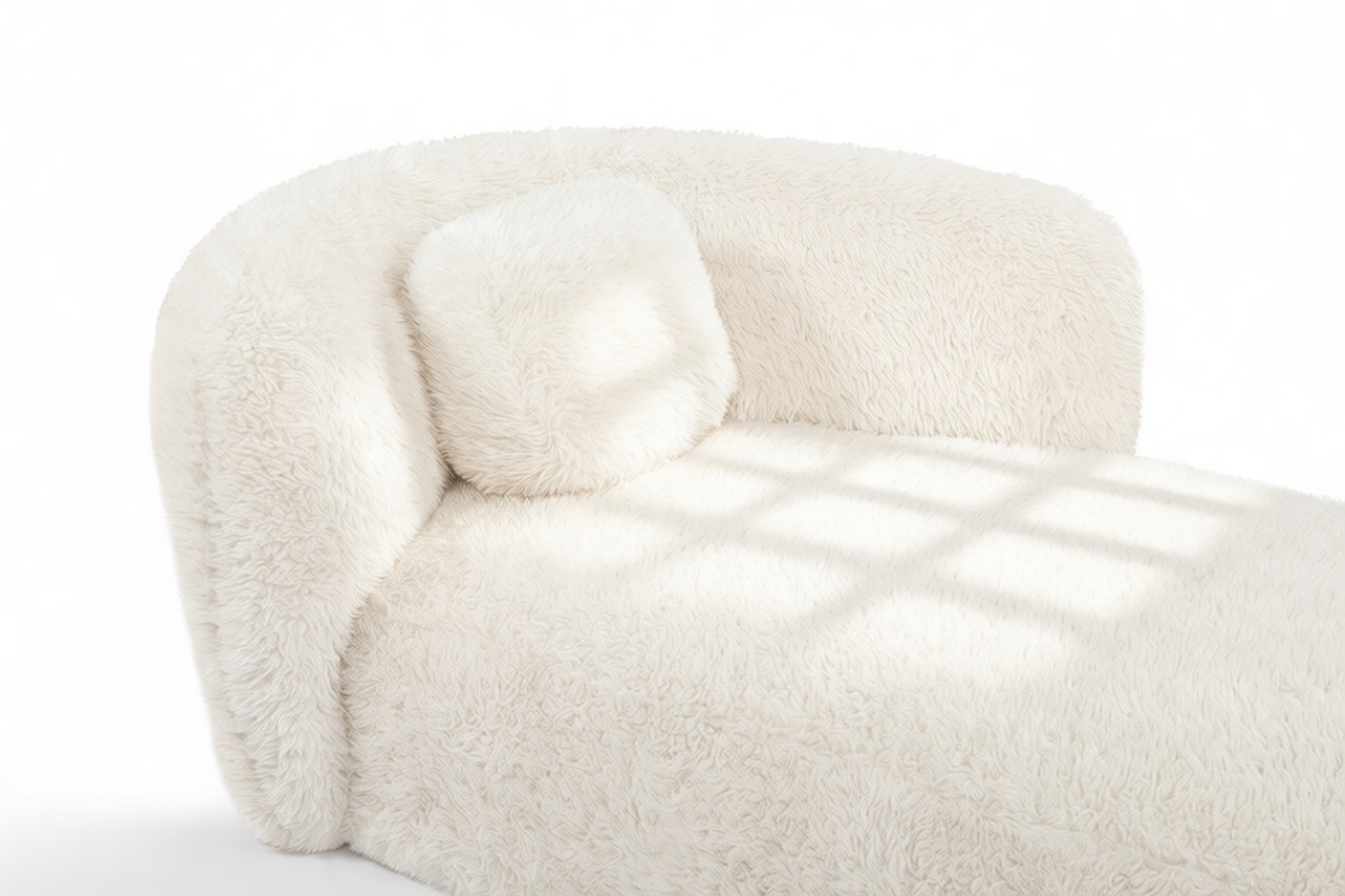 Experience ultimate comfort and modern style with the Diane Daybed. Featuring a plush, long-haired Sherpa upholstery that beckons relaxation, this piece is designed for lounging in style. Crafted with a sturdy solid wood frame for durability and stability, its contemporary rounded design with smooth edges adds to its aesthetic charm. The unique single-armrest seamlessly flowing into a low backrest gives this daybed an elegant silhouette.