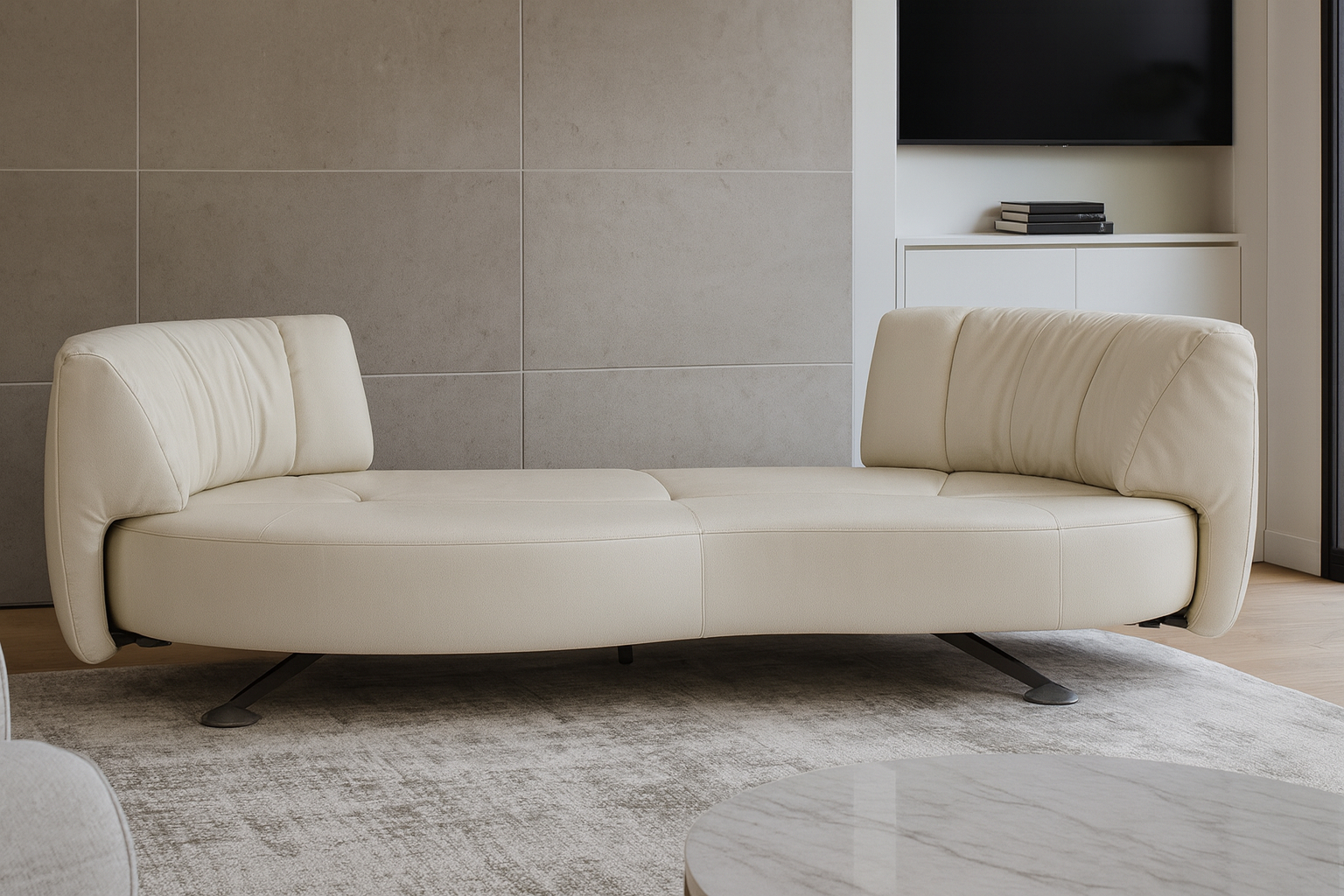 Experience ultimate comfort and versatility with the DS 164 Sofa, a contemporary seating solution featuring an adjustable backrest for personalized relaxation. Boasting a sleek design with a curved, modern aesthetic, this sofa seamlessly combines style and functionality to become a standout piece in any living area. Crafted with a durable solid wood frame, a powder-coated base, and elevated metal legs, it exudes a floating appearance. Upholstered in premium off-white vegan leather, this sofa showcases plush and structured cushions for optimal comfort and support. Its generous dimensions make it perfect for lounging, entertaining, or as a stylish daybed alternative. Whether adorning a minimalist loft or a luxurious living room, the DS 164 epitomizes elegance and adaptability.