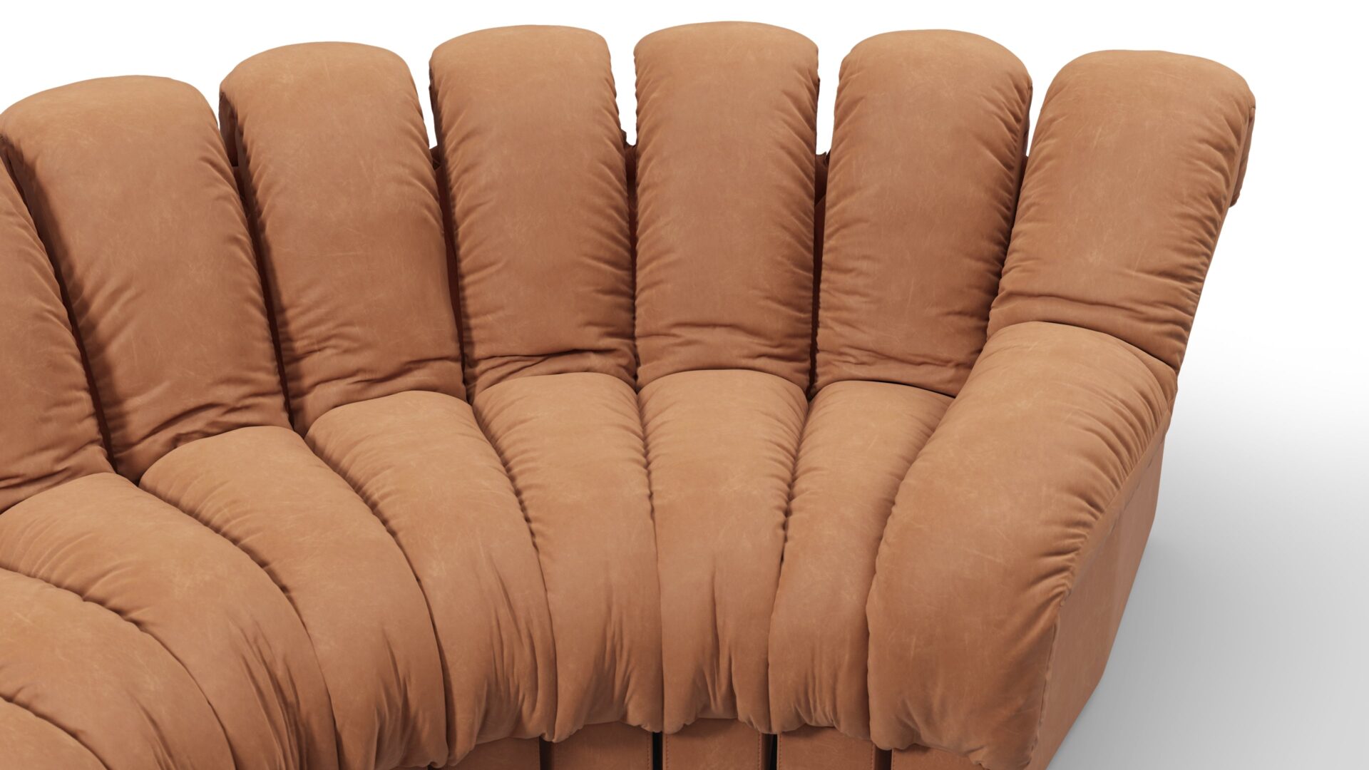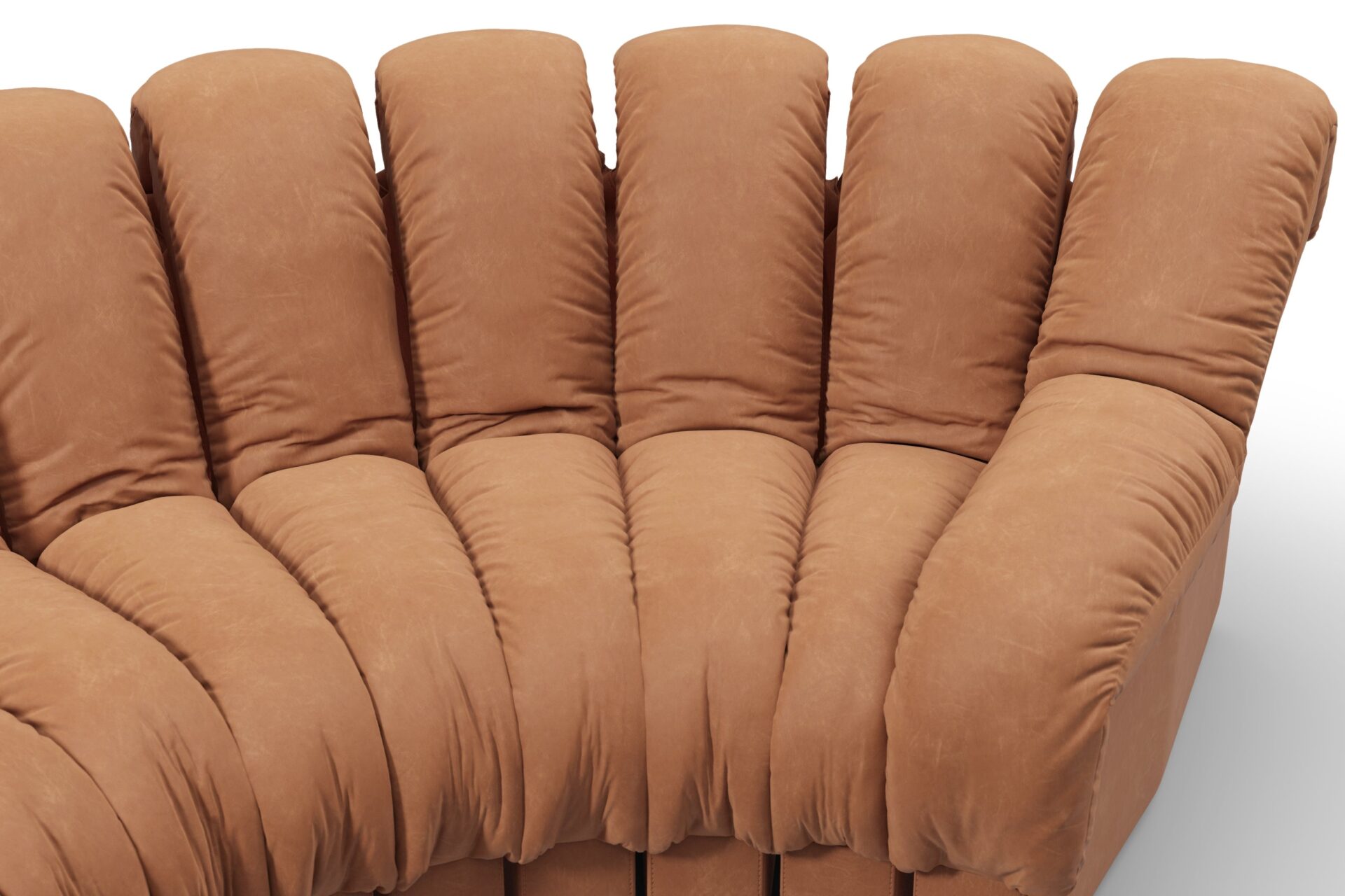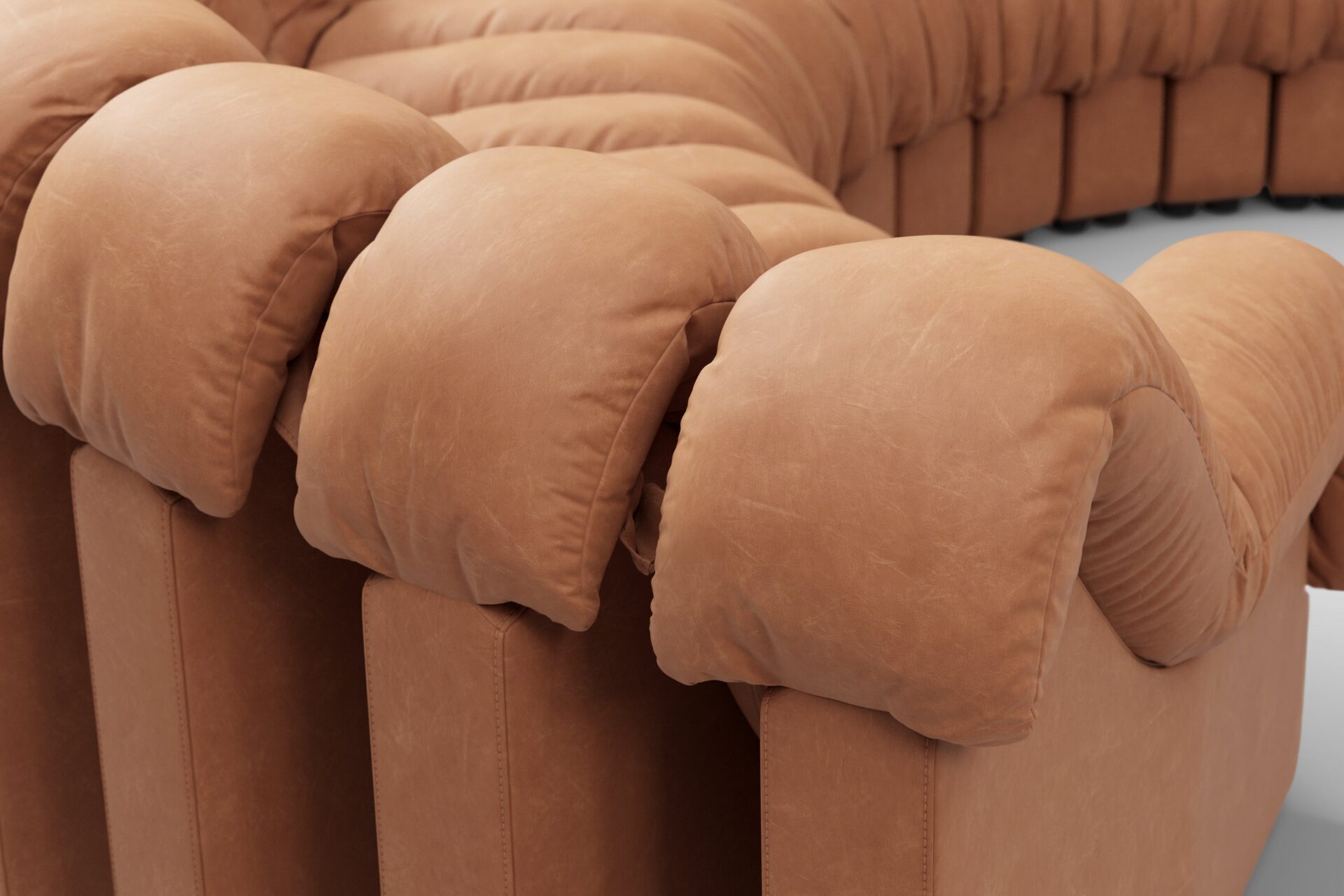 Immerse your space in sophistication with the DS 600 Sofa, a bold masterpiece of innovative design. Drawing inspiration from the 1970s, this sectional sofa redefines modular seating with its sleek lines and commanding presence. Crafted in tan vegan leather, this elegant piece radiates timeless style and luxurious comfort, offering endless versatility and exquisite craftsmanship to elevate any interior.