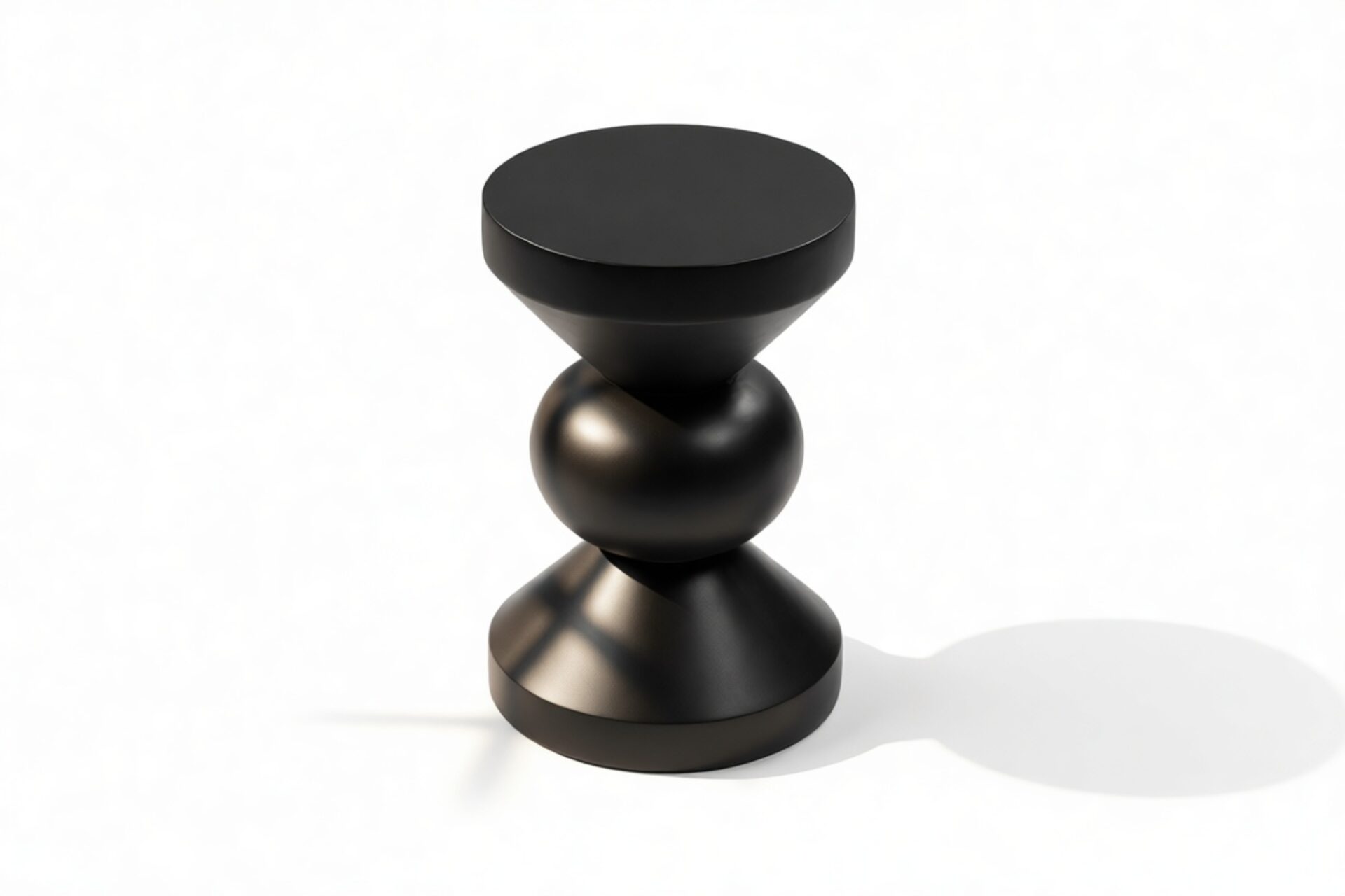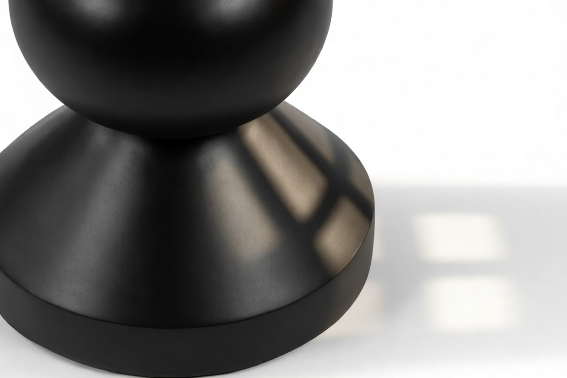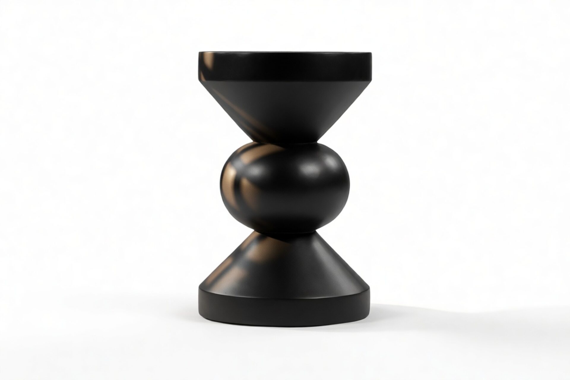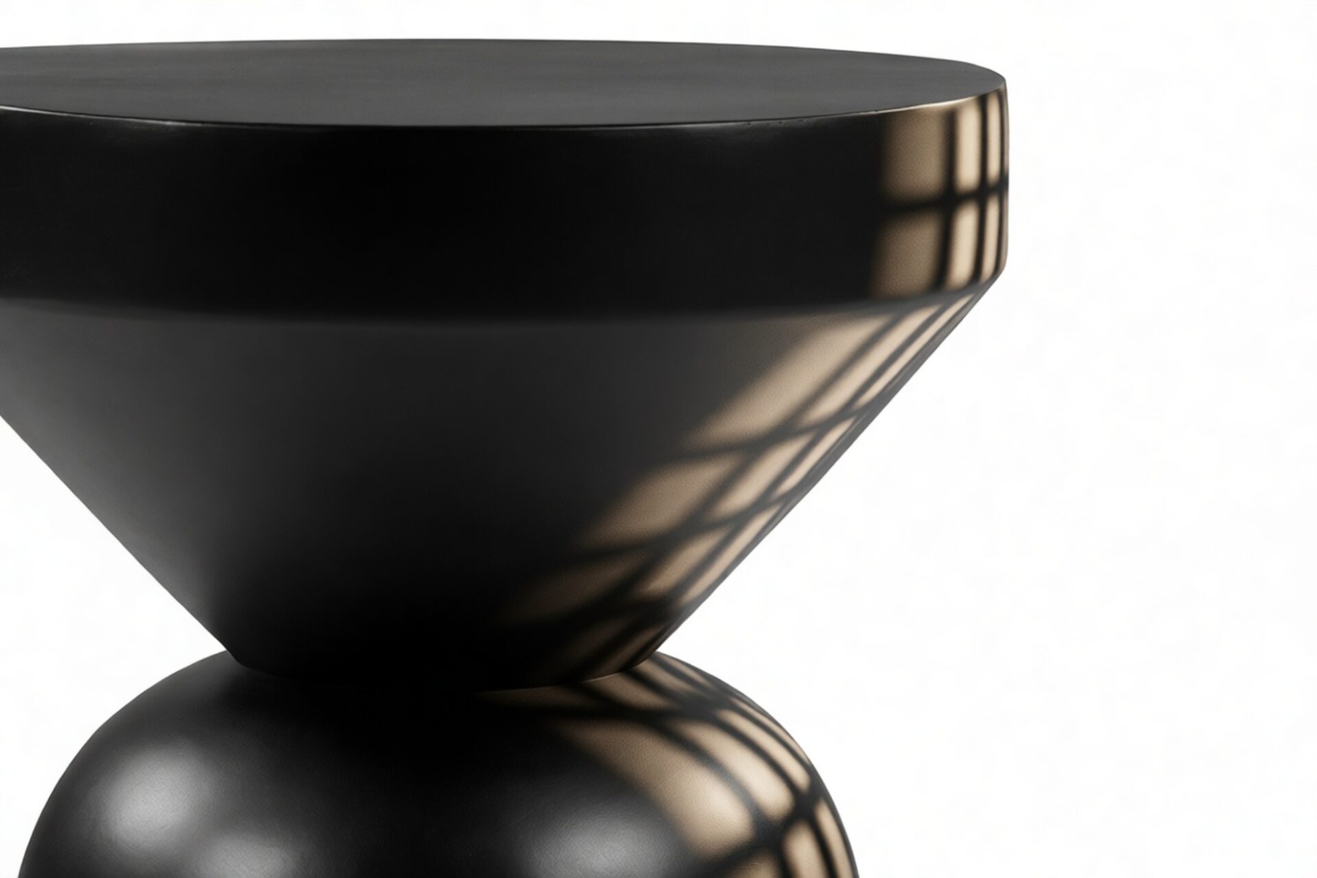Discover the Échecs Side Table, a contemporary, geometric furniture item made from black concrete. It showcases a striking design with a conical base, spherical center, and inverted conical top. The smooth matte finish enhances its minimalist appeal, making it a versatile option for both indoor and outdoor settings.