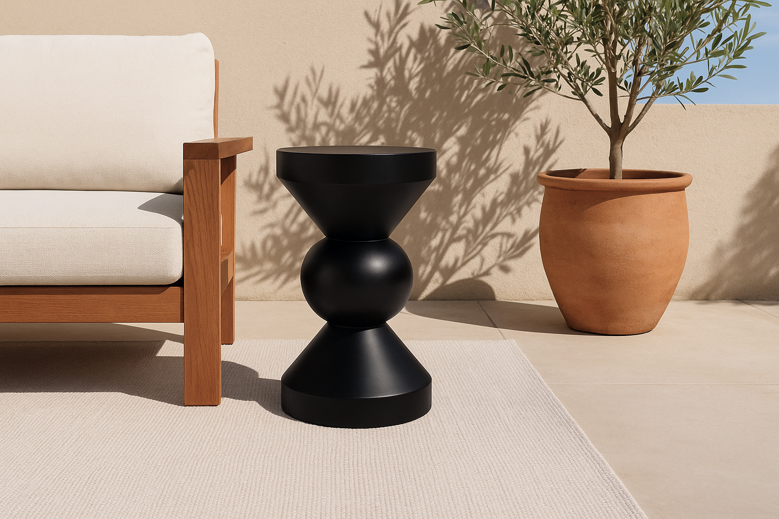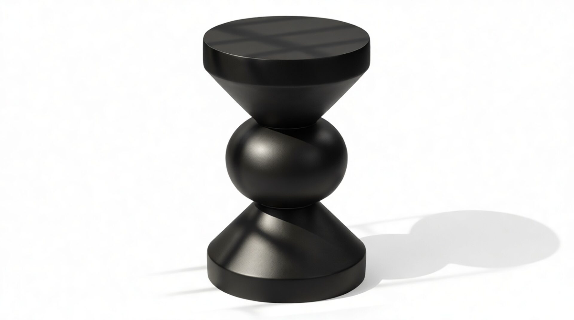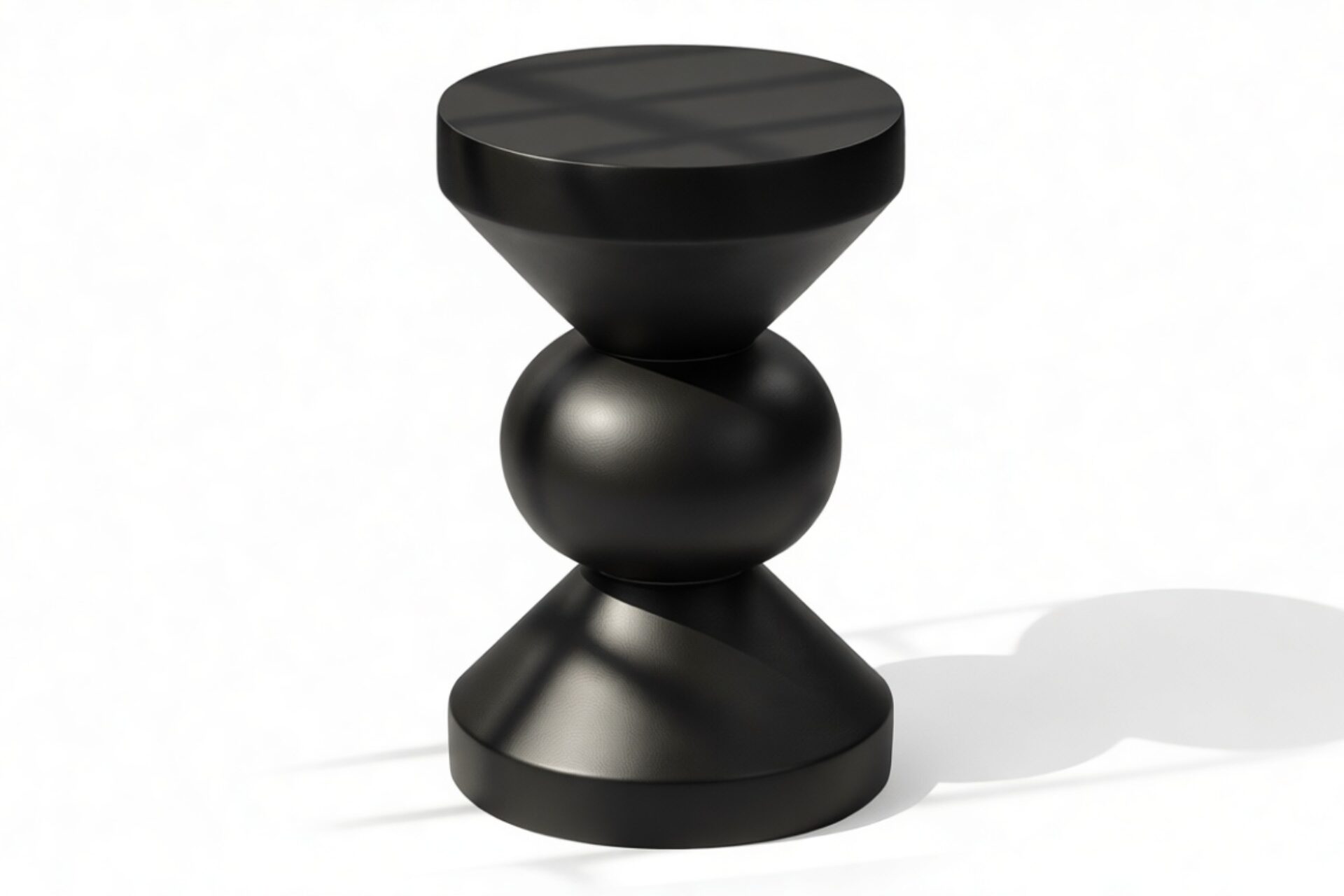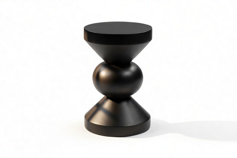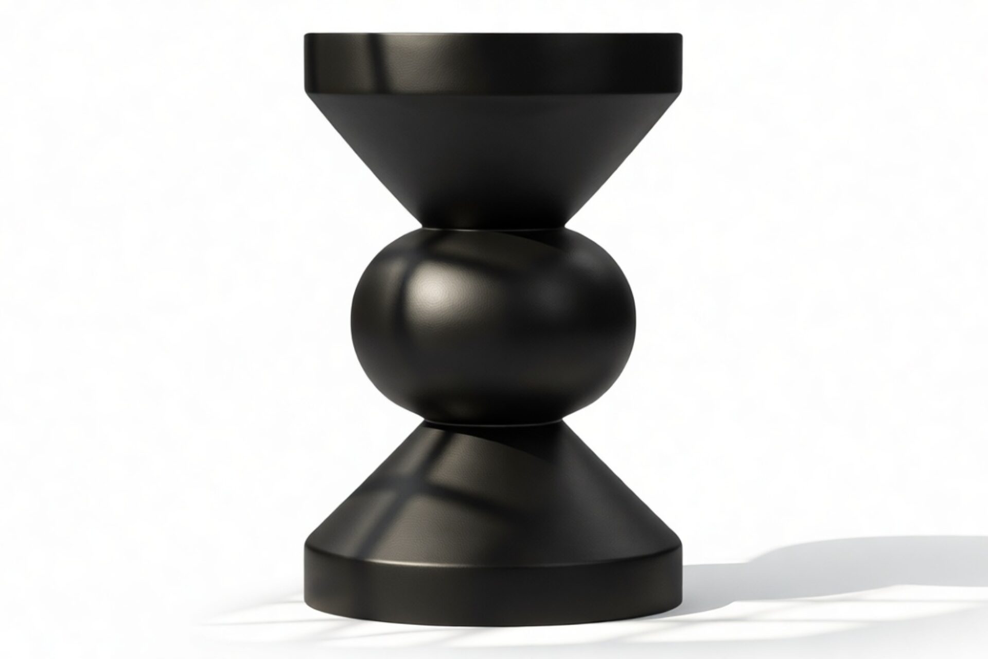 Discover the Échecs Side Table, a contemporary, geometric furniture item made from black concrete. It showcases a striking design with a conical base, spherical center, and inverted conical top. The smooth matte finish enhances its minimalist appeal, making it a versatile option for both indoor and outdoor settings.