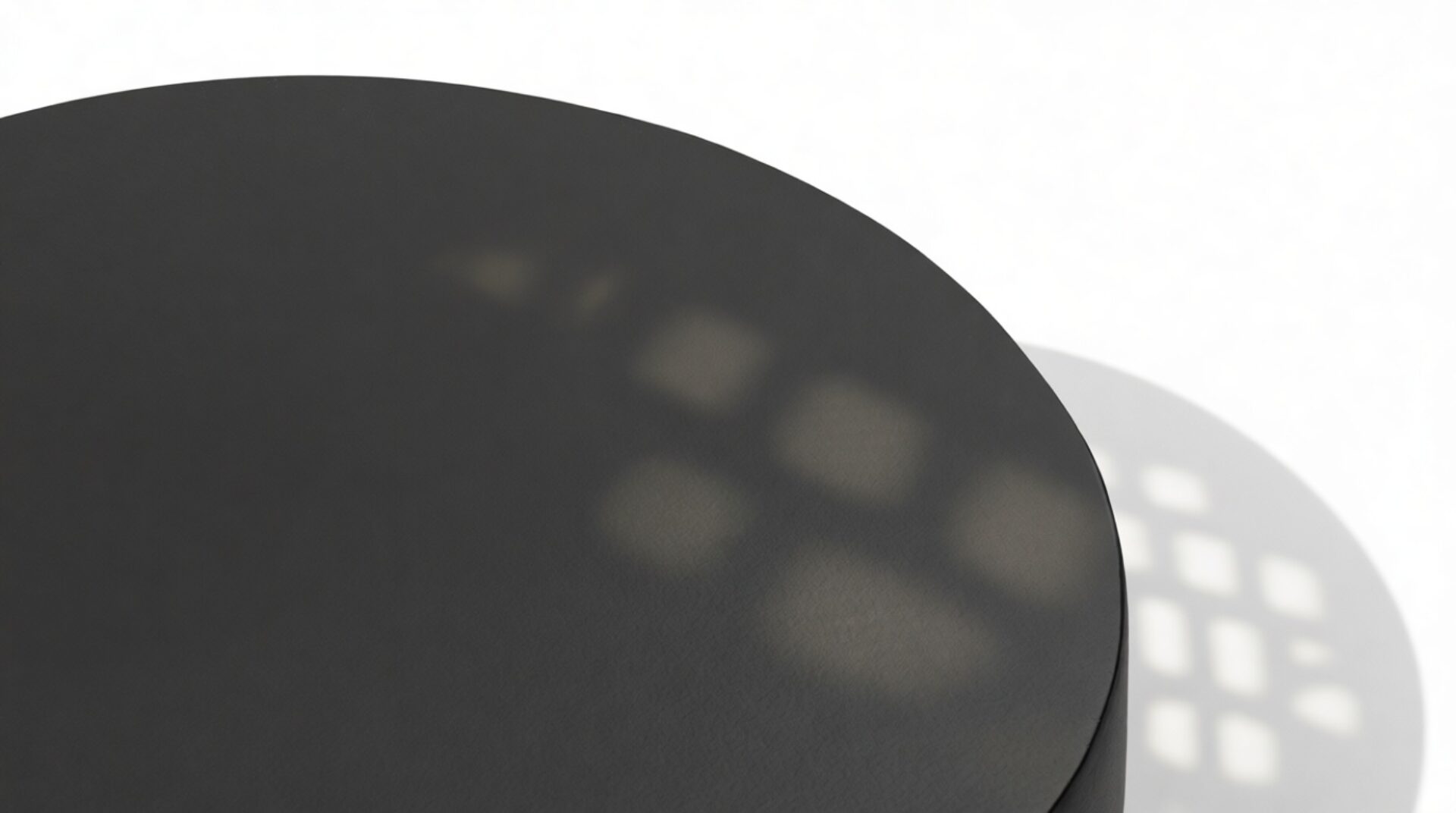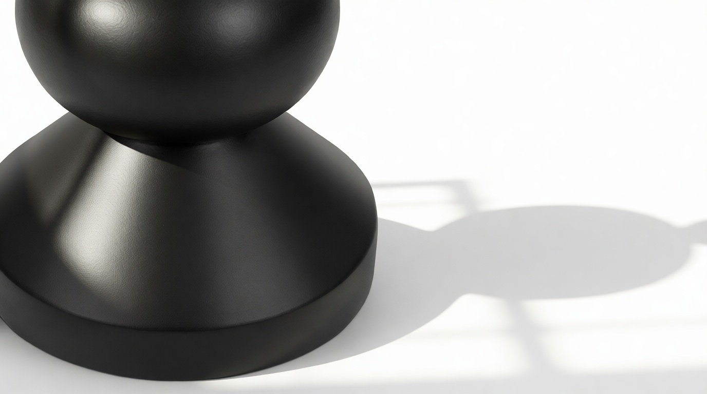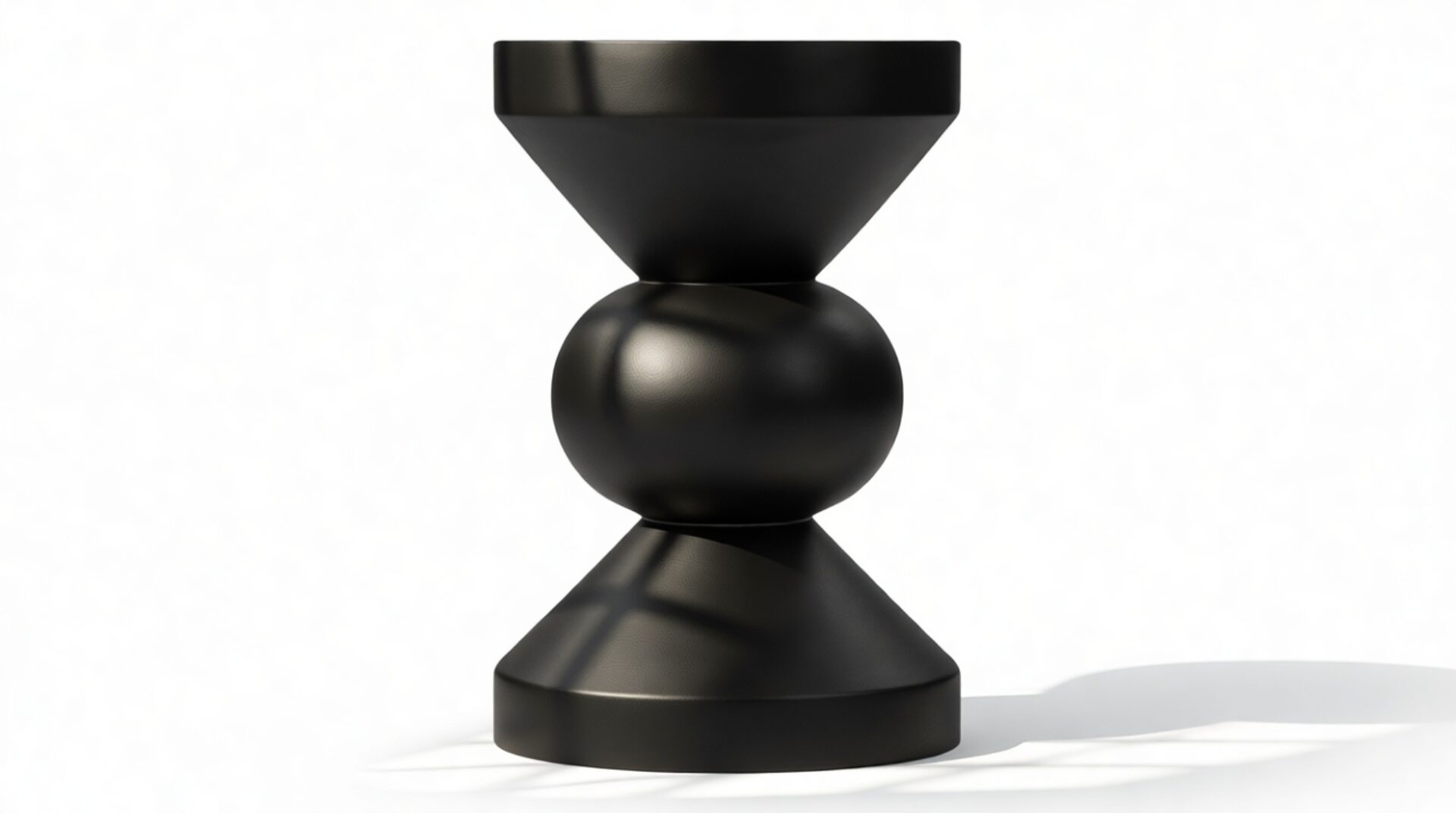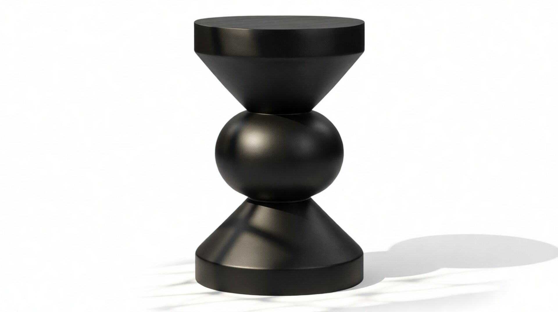 Discover the Échecs Side Table, a contemporary, geometric furniture item made from black concrete. It showcases a striking design with a conical base, spherical center, and inverted conical top. The smooth matte finish enhances its minimalist appeal, making it a versatile option for both indoor and outdoor settings.