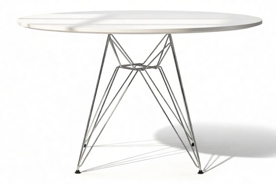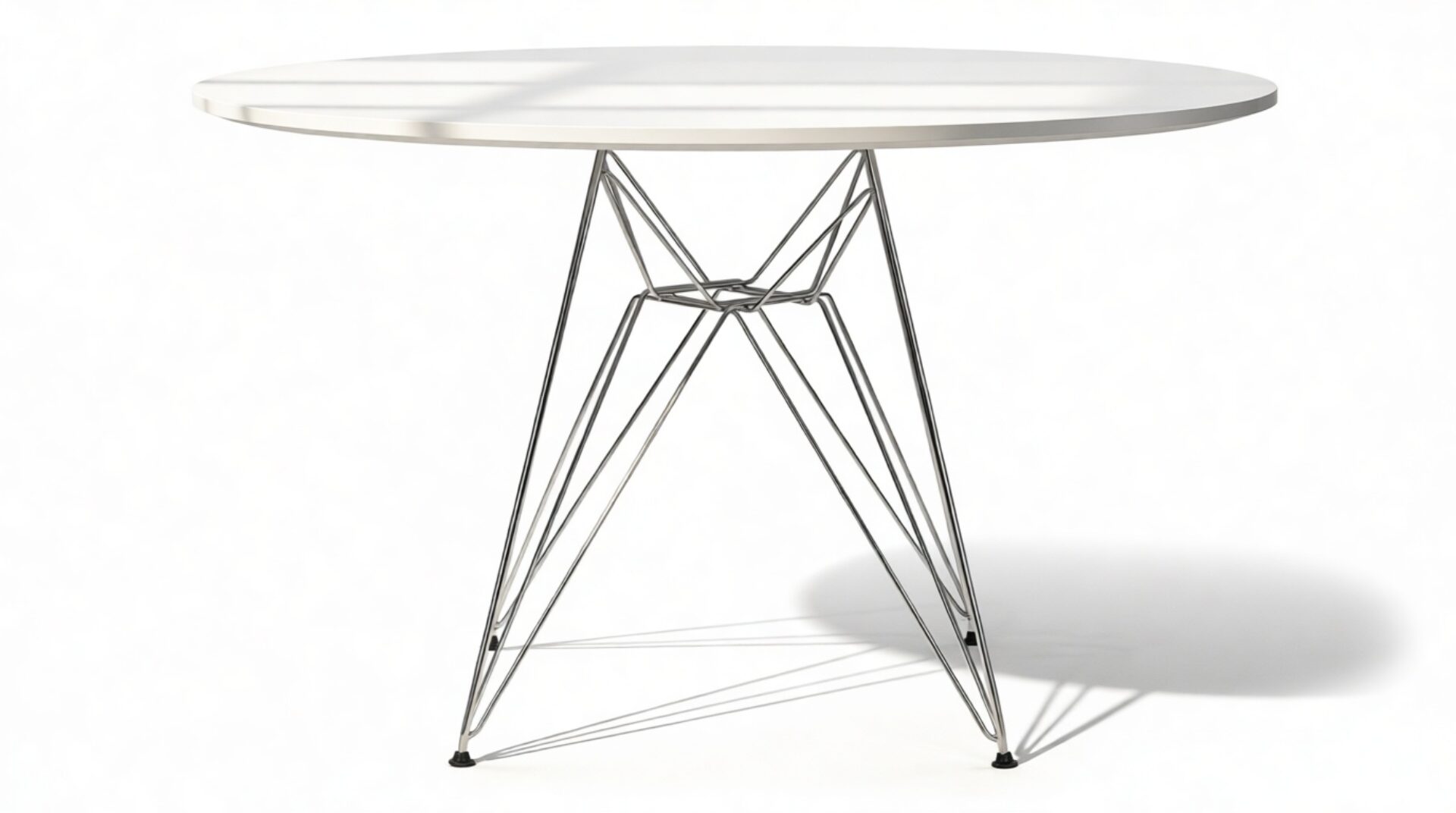 Drawing inspiration from the renowned chair, the Eiffel Table stands out as a captivating blend of materials. This modern classic showcases a sophisticated round top that exudes both style and warmth, supported by a sleek minimalist-industrial base that captivates attention. It complements the Eiffel chair seamlessly.