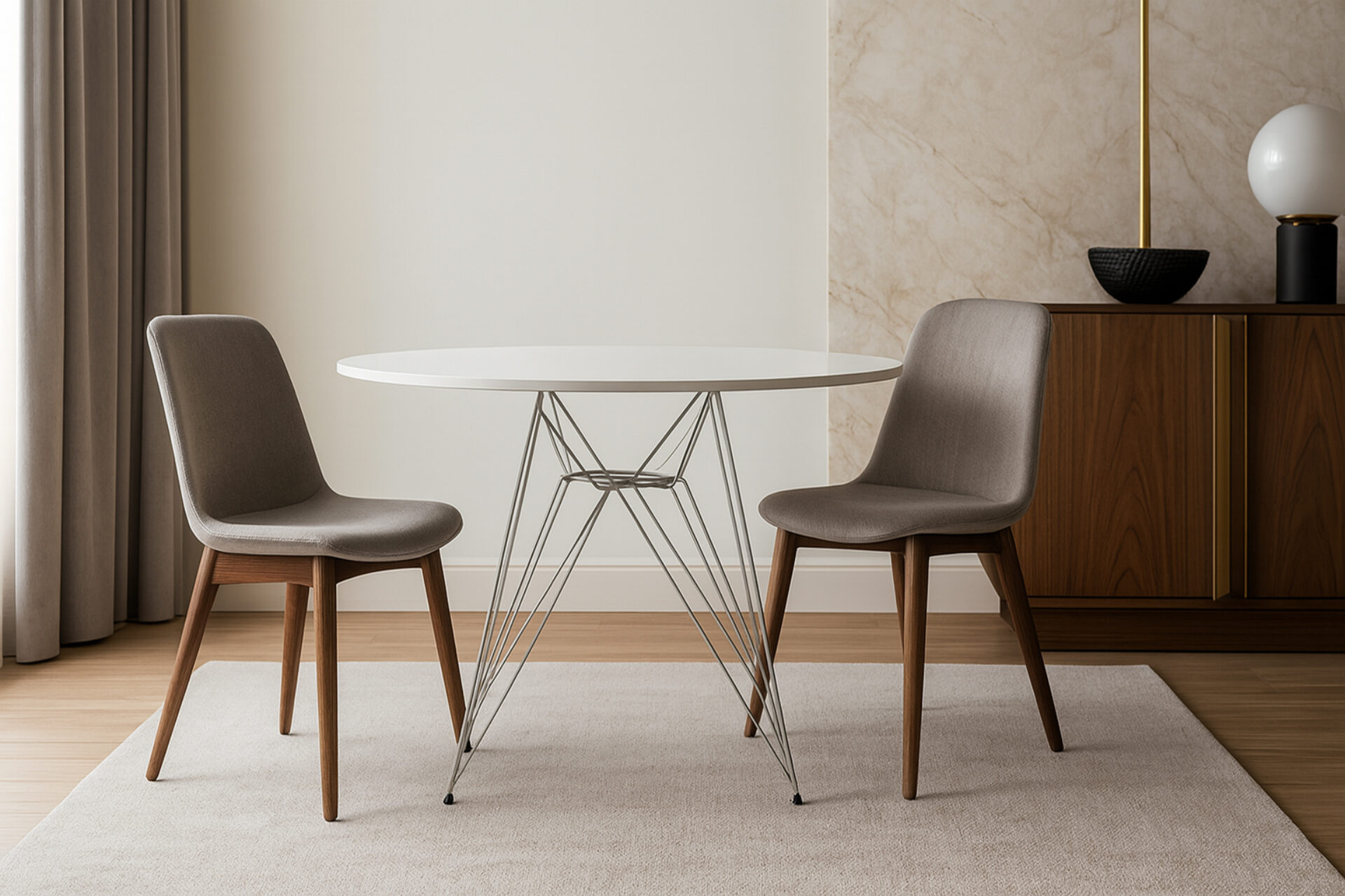 Drawing inspiration from the renowned chair, the Eiffel Table stands out as a captivating blend of materials. This modern classic showcases a sophisticated round top that exudes both style and warmth, supported by a sleek minimalist-industrial base that captivates attention. It complements the Eiffel chair seamlessly.