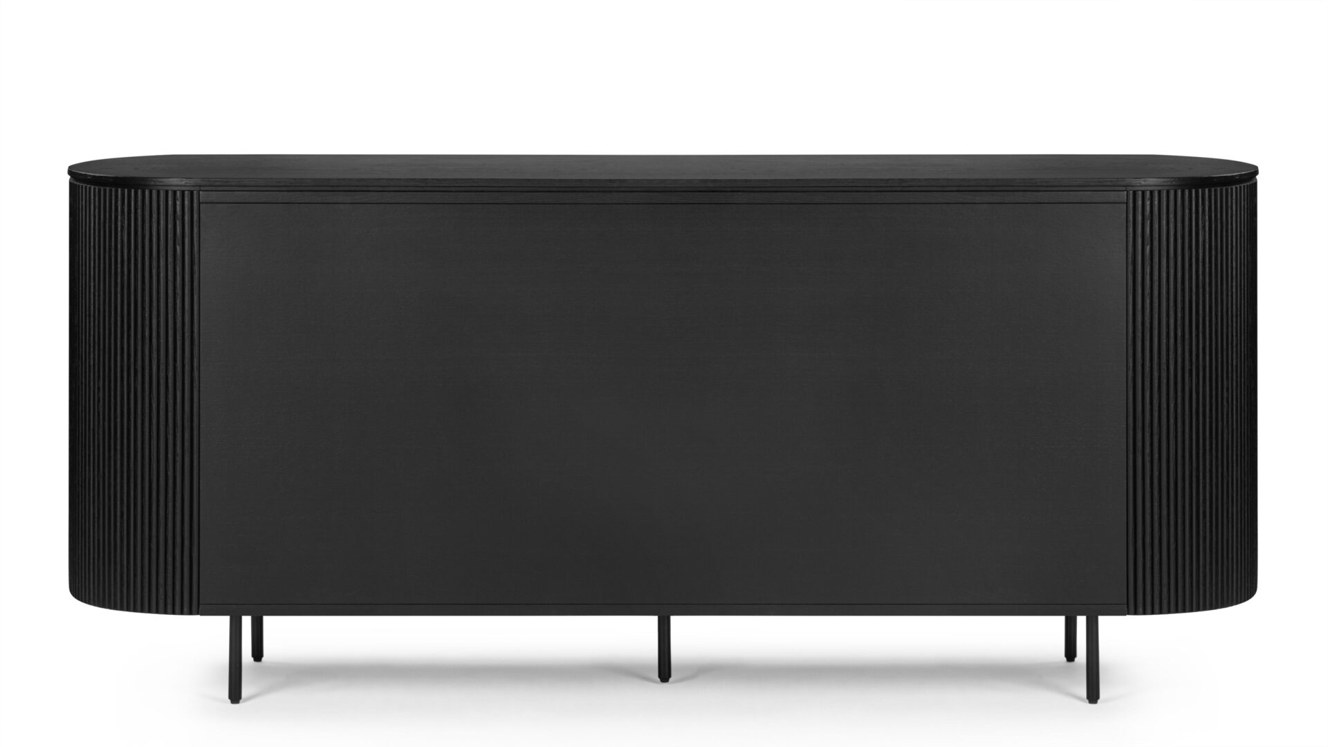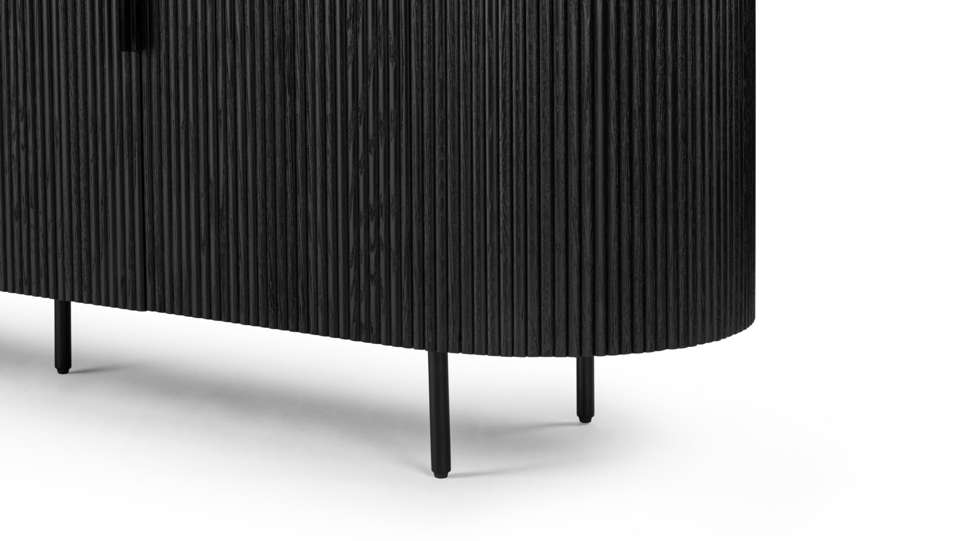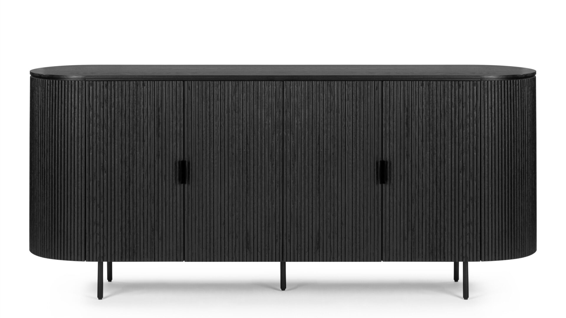 Experience the sophisticated charm of the Emery Fluted Sideboard, featuring a chic, contemporary design with a matte black finish, gracefully curved body, and delicately fluted sides. This piece makes a striking yet refined statement that seamlessly complements modern interiors, embodying a harmonious fusion of style and utility, anchoring any space with ease.