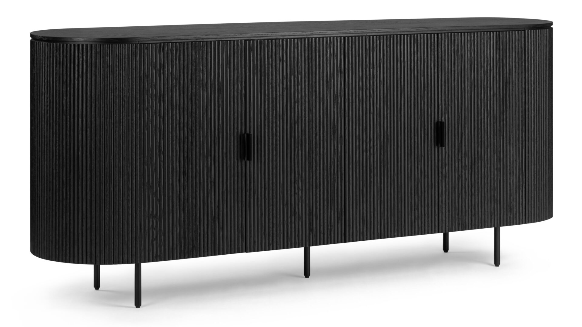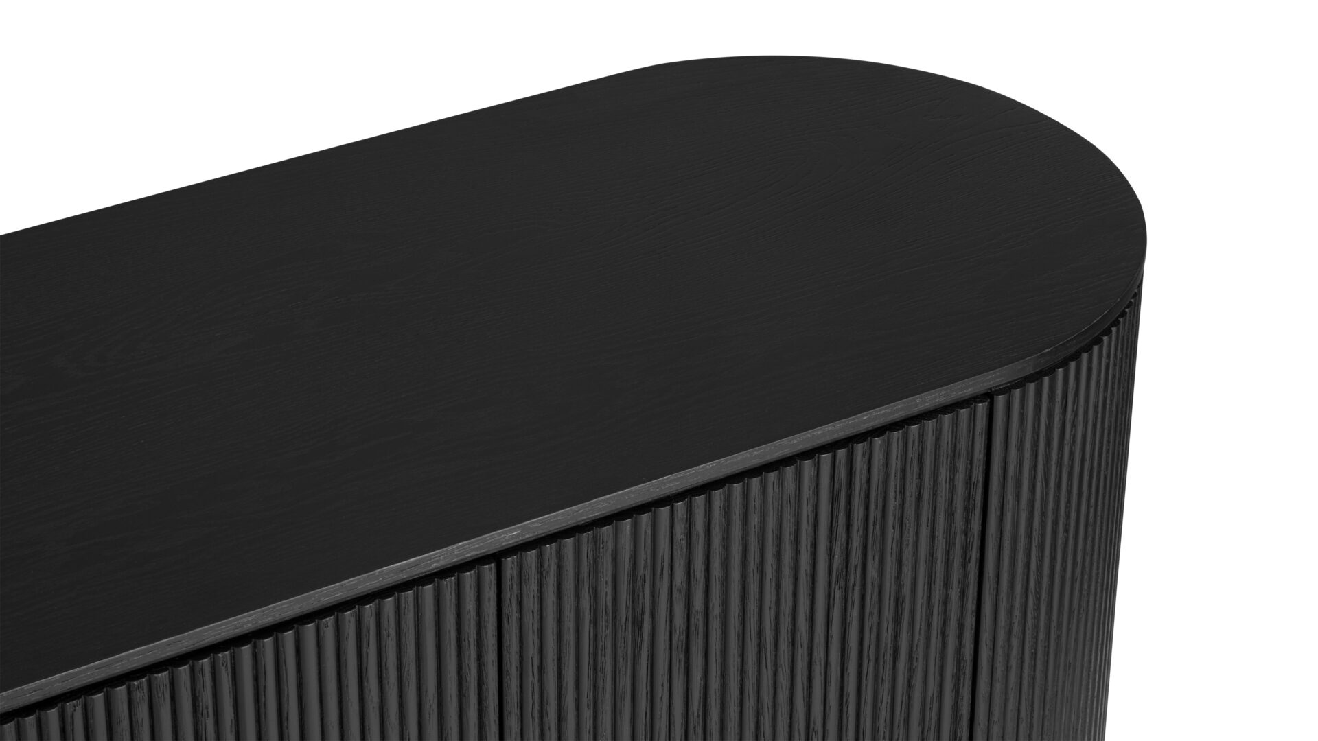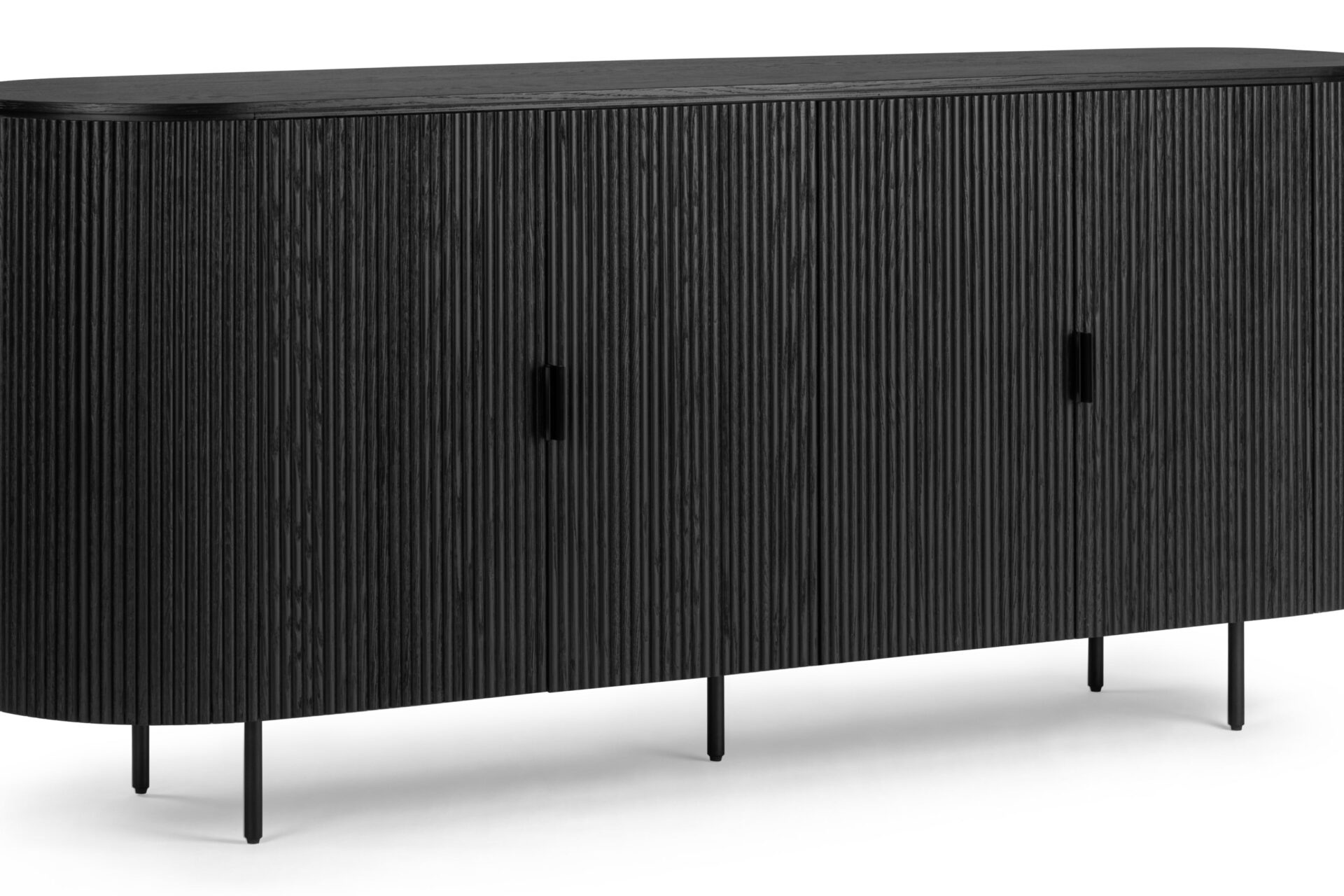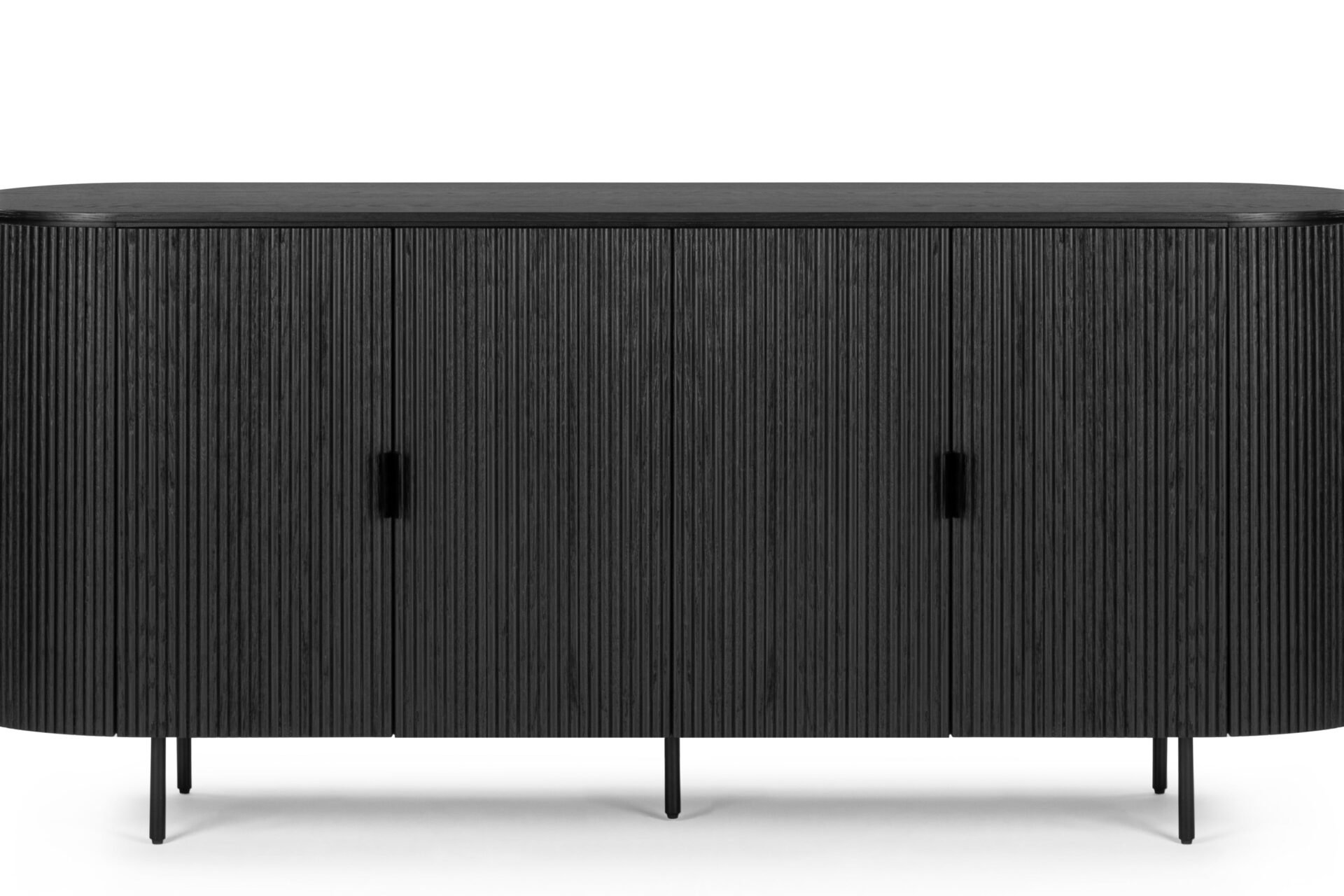 Experience the sophisticated charm of the Emery Fluted Sideboard, featuring a chic, contemporary design with a matte black finish, gracefully curved body, and delicately fluted sides. This piece makes a striking yet refined statement that seamlessly complements modern interiors, embodying a harmonious fusion of style and utility, anchoring any space with ease.