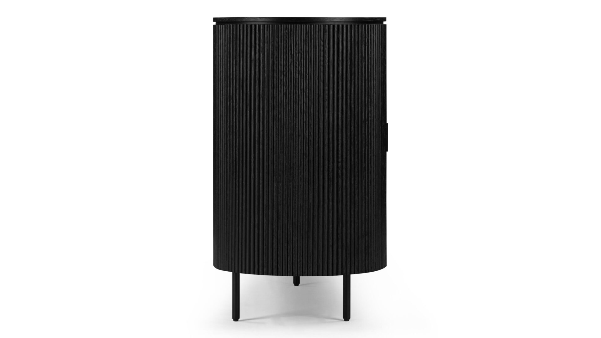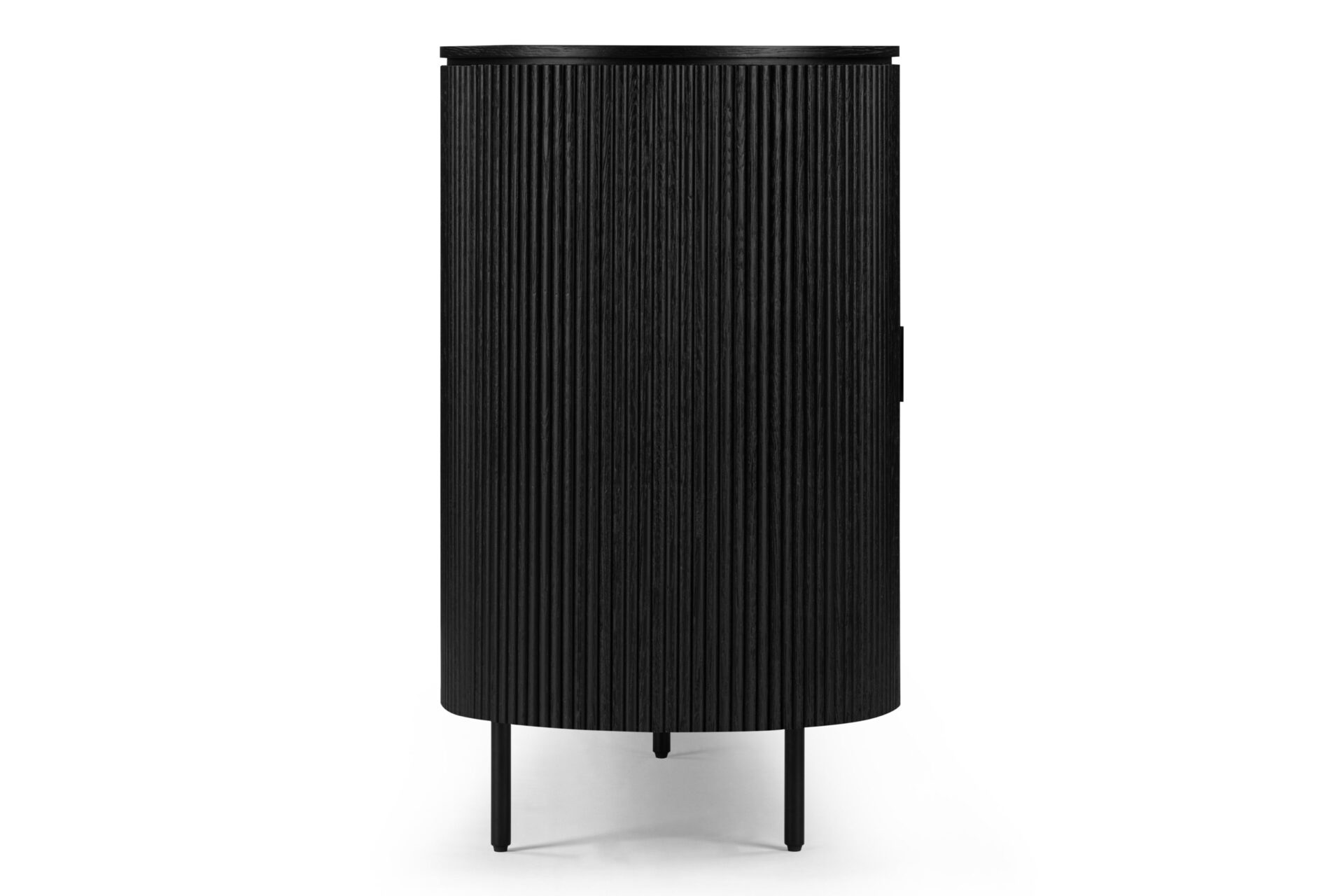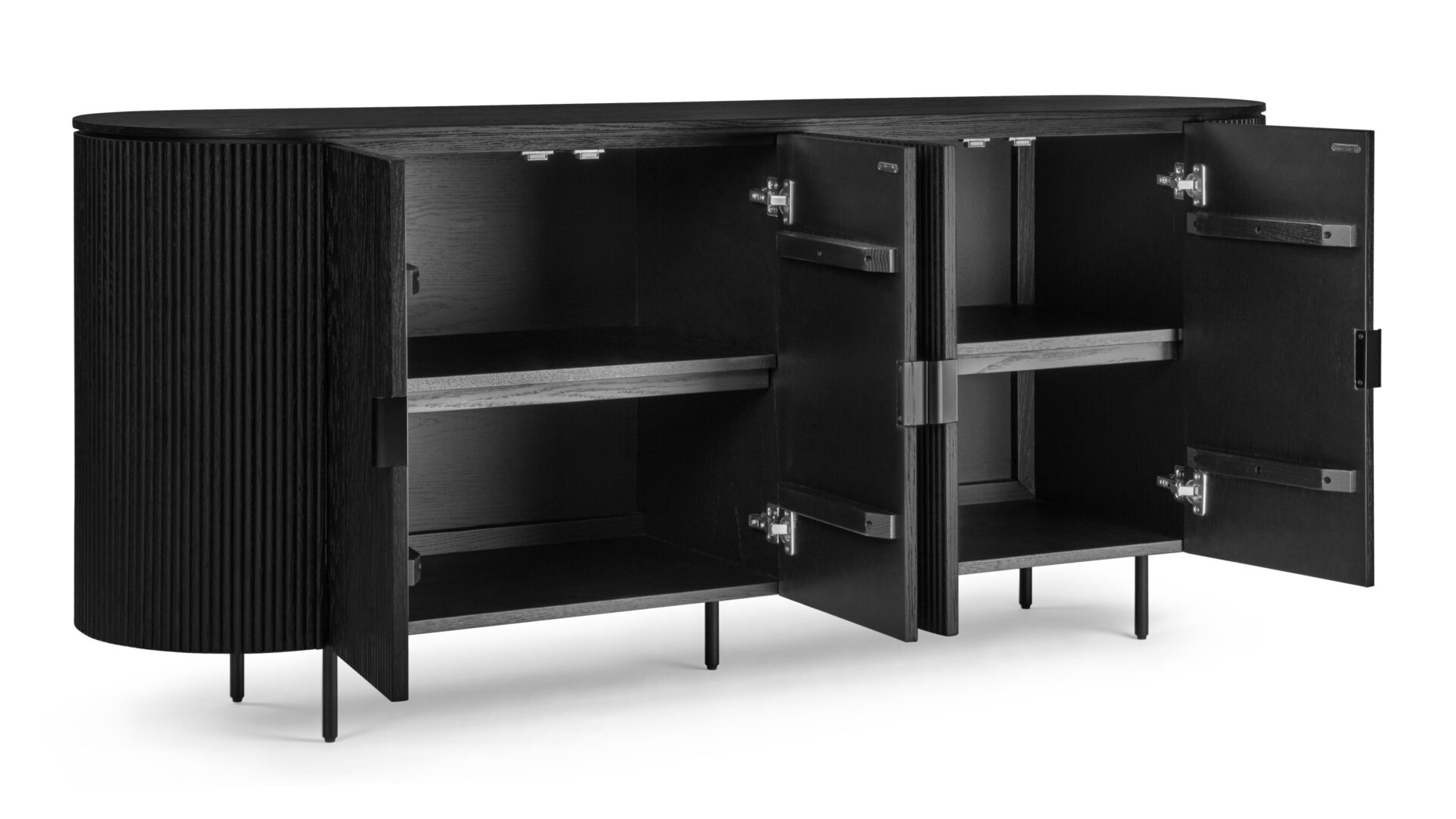 Introducing the Emery Fluted Sideboard, a striking furniture piece that seamlessly merges minimalism with captivating design. Constructed from wood in a sophisticated matte black finish, this sideboard features delicately fluted sides and a gracefully curved body, resulting in a refined silhouette. Its clean lines are accentuated by sleek handles that flawlessly complement the overall aesthetic. Elevated on slender metal legs, this sideboard exudes a modern charm and provides two generous storage compartments with shelves for effortless organization and clutter concealment. Beyond its practical functionality, the Emery Fluted Sideboard serves as a statement piece in any space. The bold black hue and textural finish exude a refined and contemporary vibe that can effortlessly enhance the décor of a dining area, living room, or entryway. With its seamless blend of style and utility, this sideboard adds versatility to contemporary interiors.