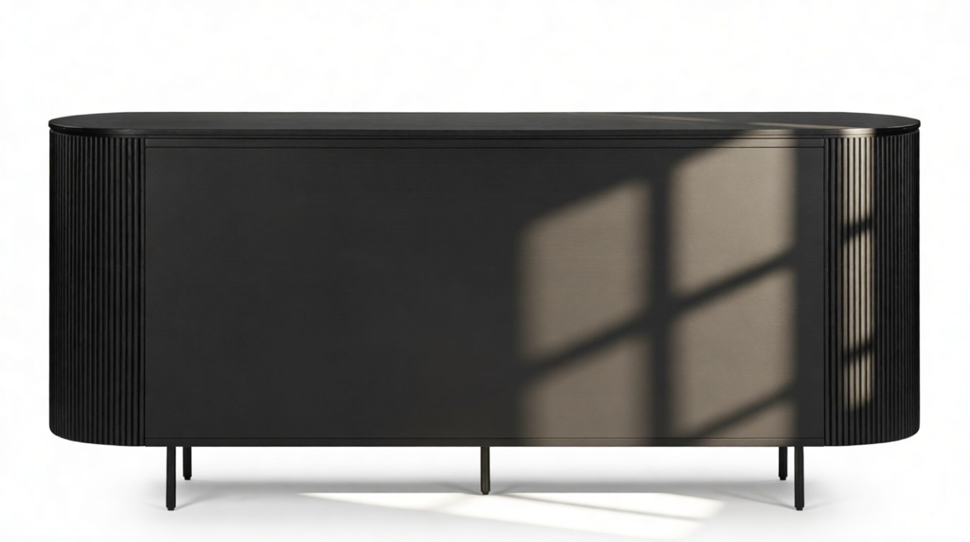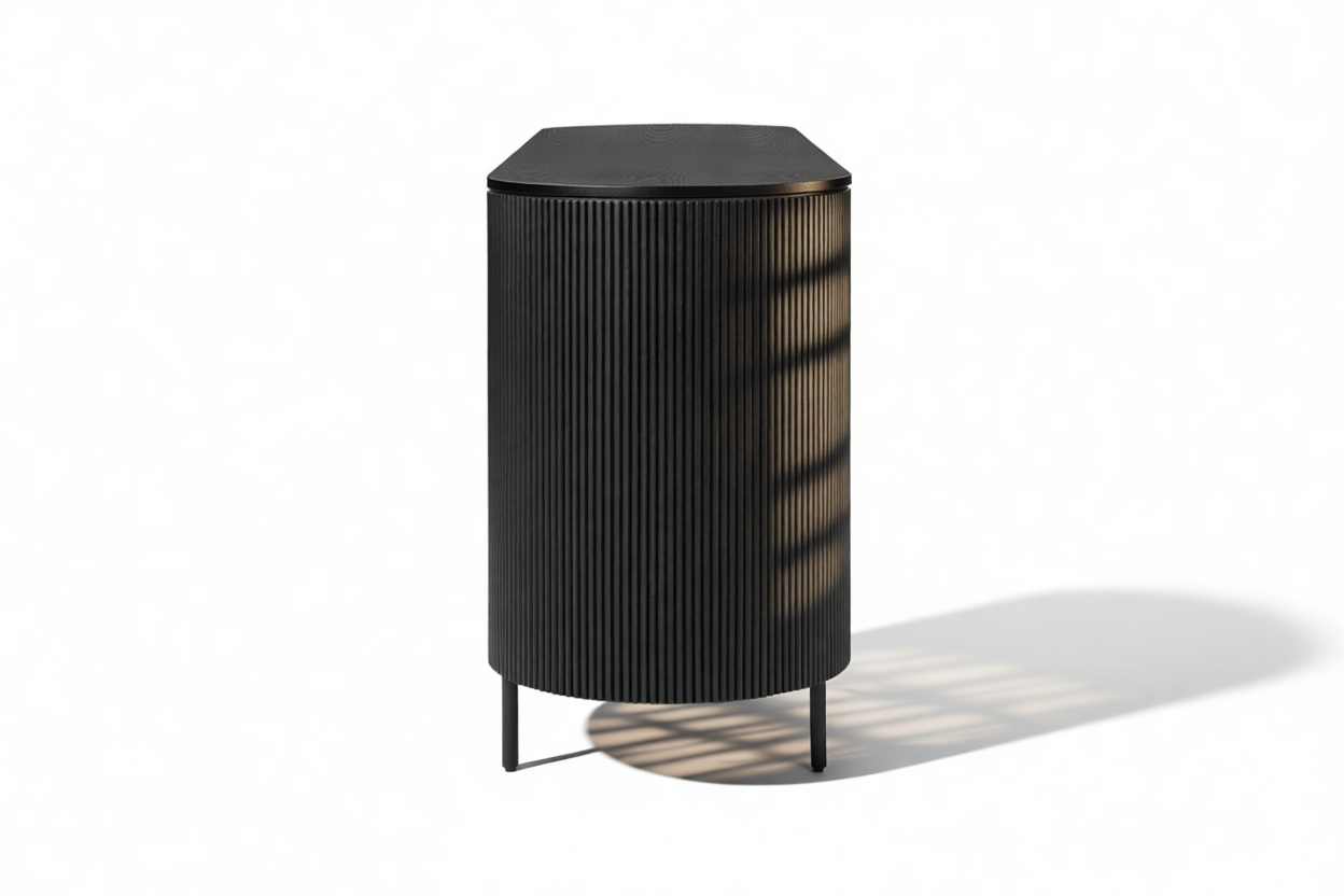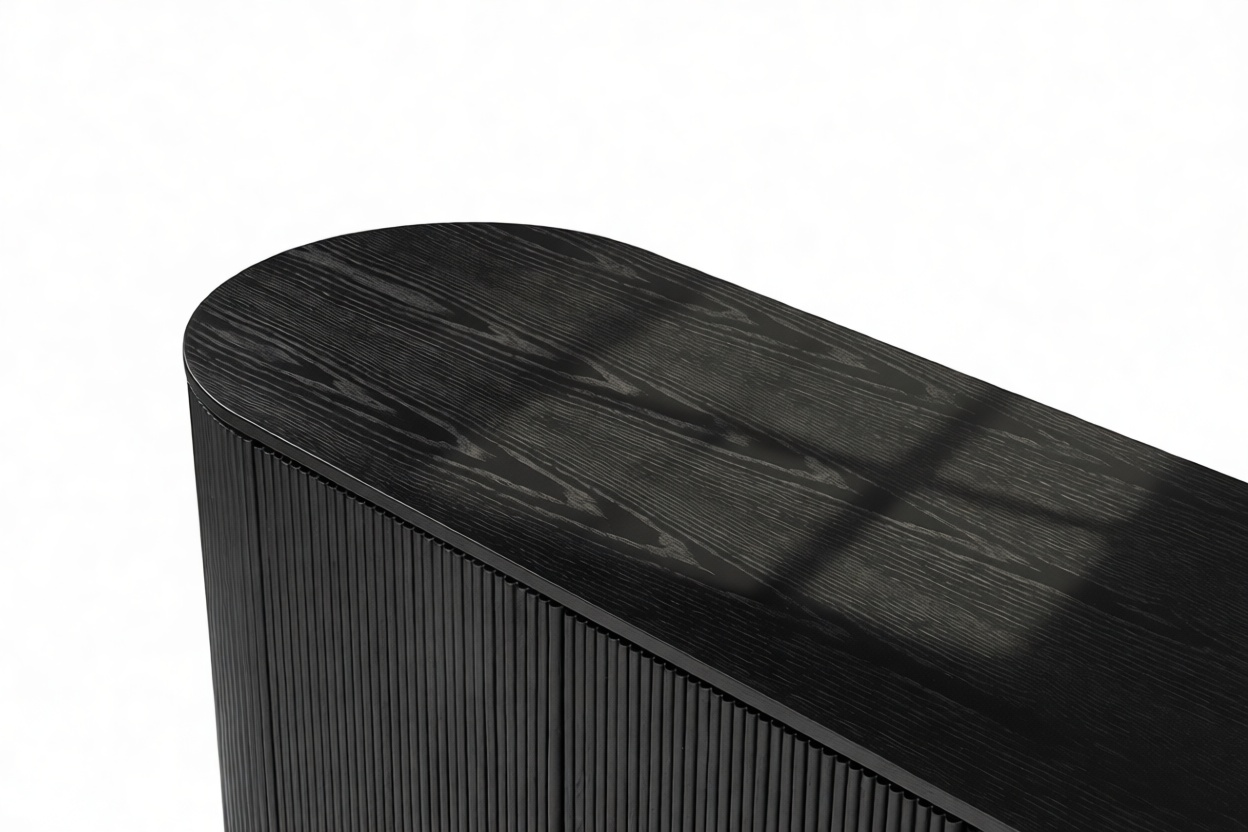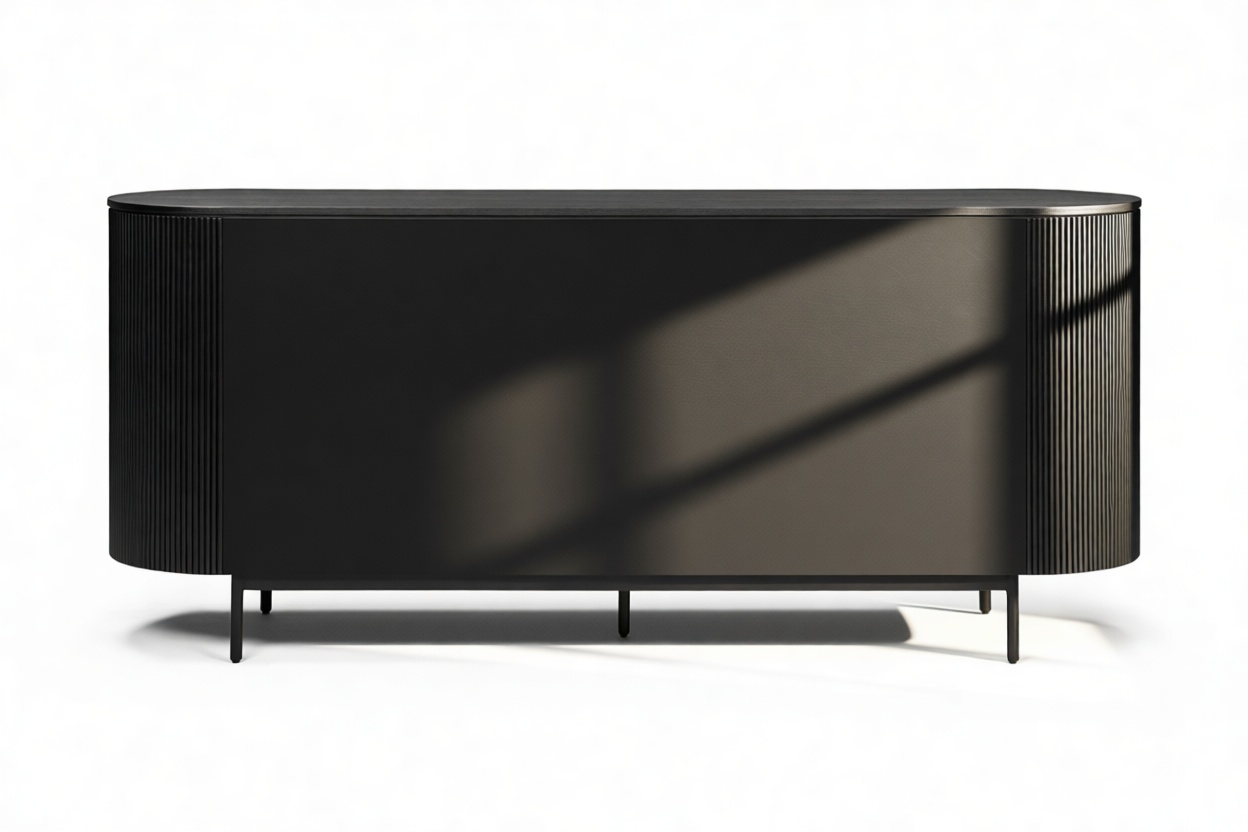 Experience the sophisticated charm of the Emeryn Fluted Sideboard, featuring a chic, contemporary design with a matte black finish, gracefully curved body, and delicately fluted sides. This piece makes a striking yet refined statement that seamlessly complements modern interiors, embodying a harmonious fusion of style and utility, anchoring any space with ease.