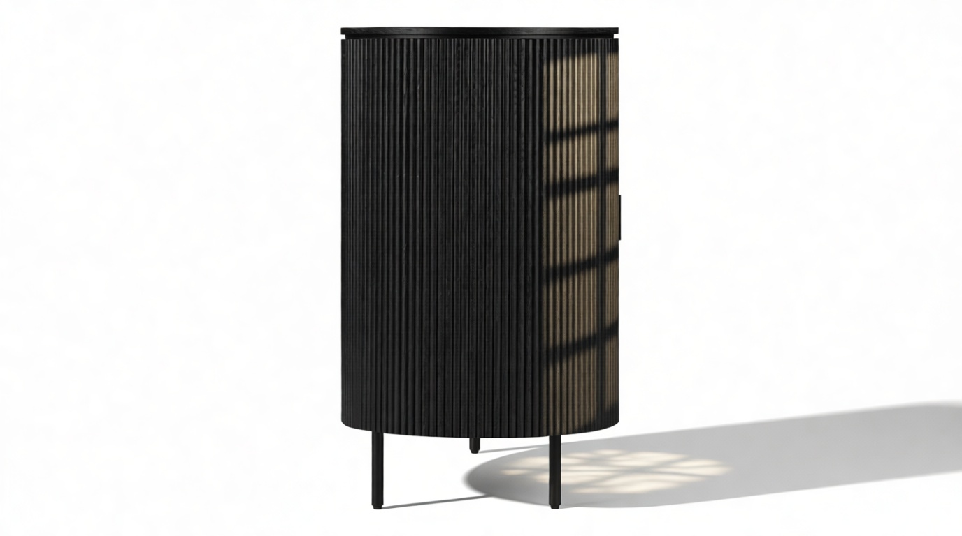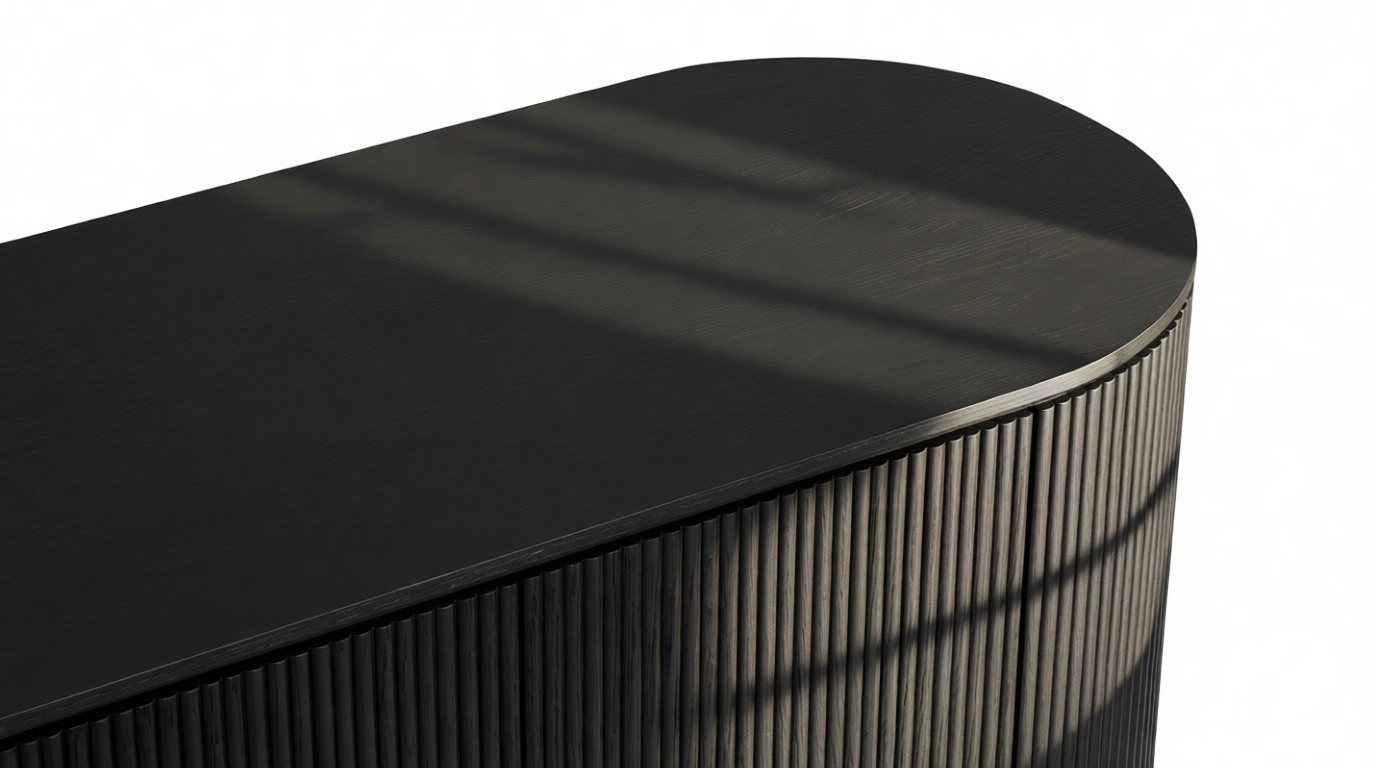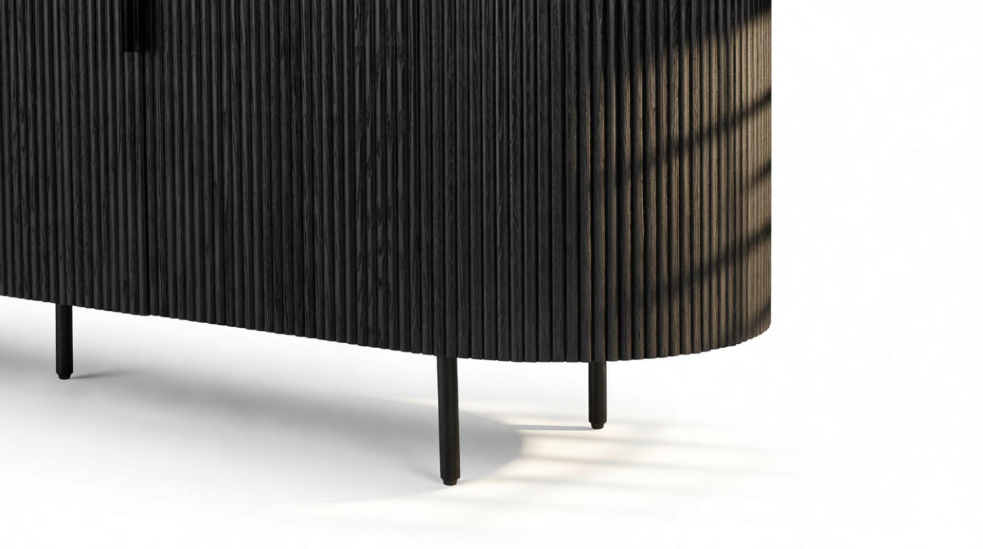Experience the sophisticated charm of the Emeryn Fluted Sideboard, featuring a chic, contemporary design with a matte black finish, gracefully curved body, and delicately fluted sides. This piece makes a striking yet refined statement that seamlessly complements modern interiors, embodying a harmonious fusion of style and utility, anchoring any space with ease.