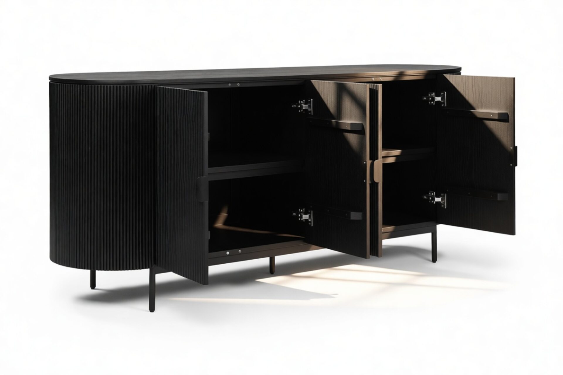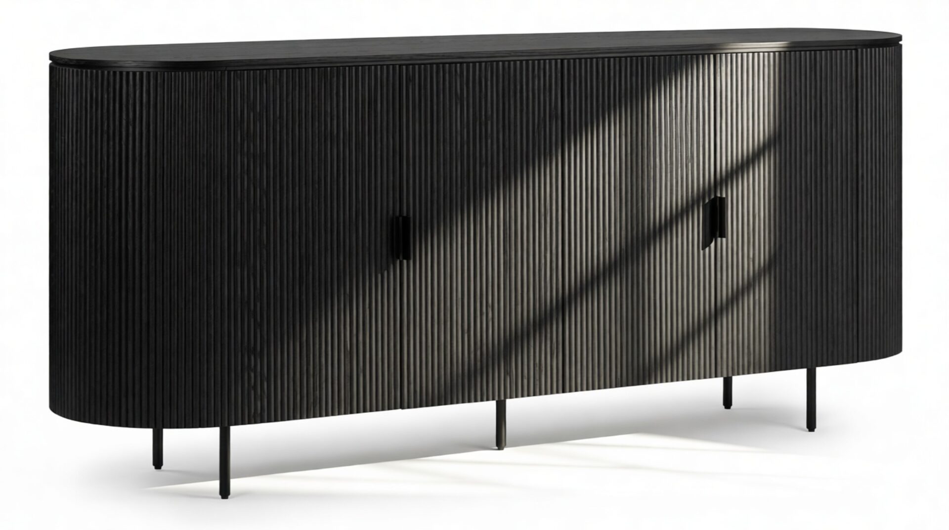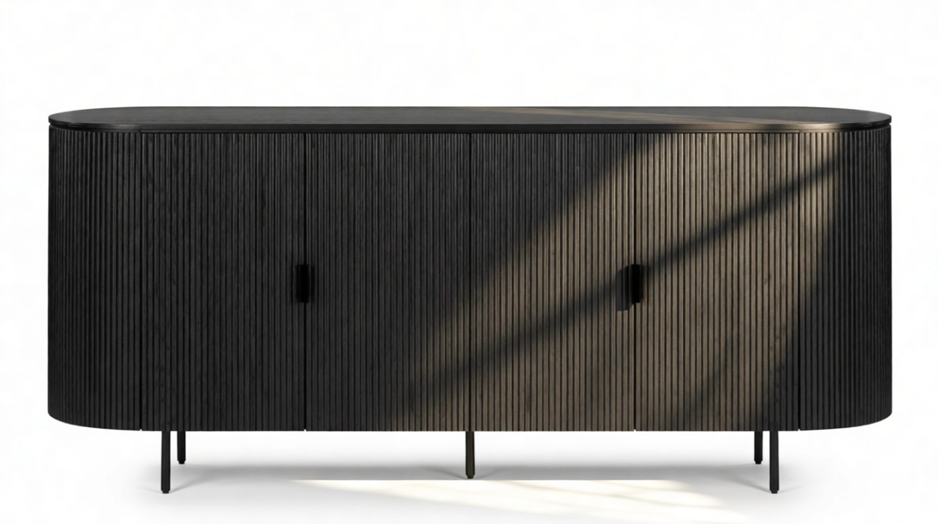 Introducing the Emeryn Fluted Sideboard, a striking furniture piece that seamlessly merges minimalism with captivating design. Constructed from wood in a sophisticated matte black finish, this sideboard features delicately fluted sides and a gracefully curved body, resulting in a refined silhouette. Its clean lines are accentuated by sleek handles that flawlessly complement the overall aesthetic. Elevated on slender metal legs, this sideboard exudes a modern charm and provides two generous storage compartments with shelves for effortless organization and clutter concealment. Beyond its practical functionality, the Emeryn Fluted Sideboard serves as a statement piece in any space. The bold black hue and textural finish exude a refined and contemporary vibe that can effortlessly enhance the décor of a dining area, living room, or entryway. With its seamless blend of style and utility, this sideboard adds versatility to contemporary interiors.