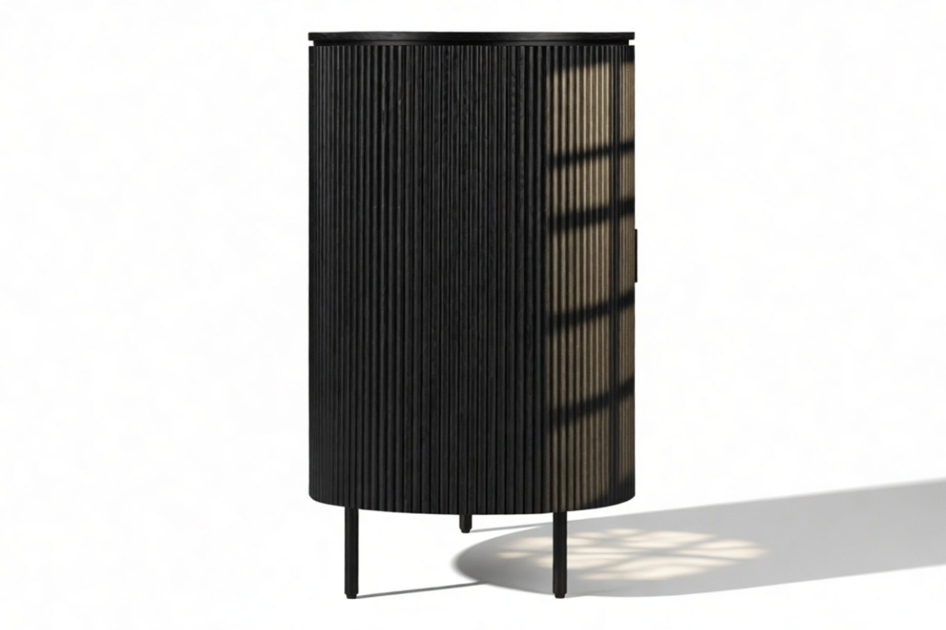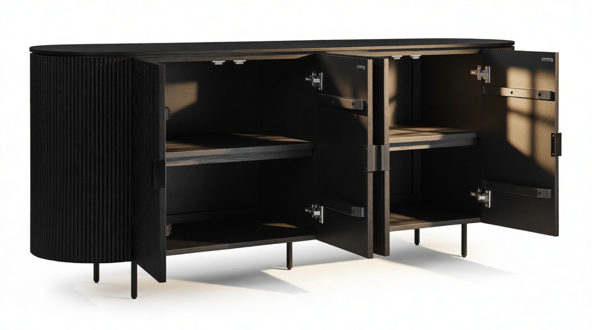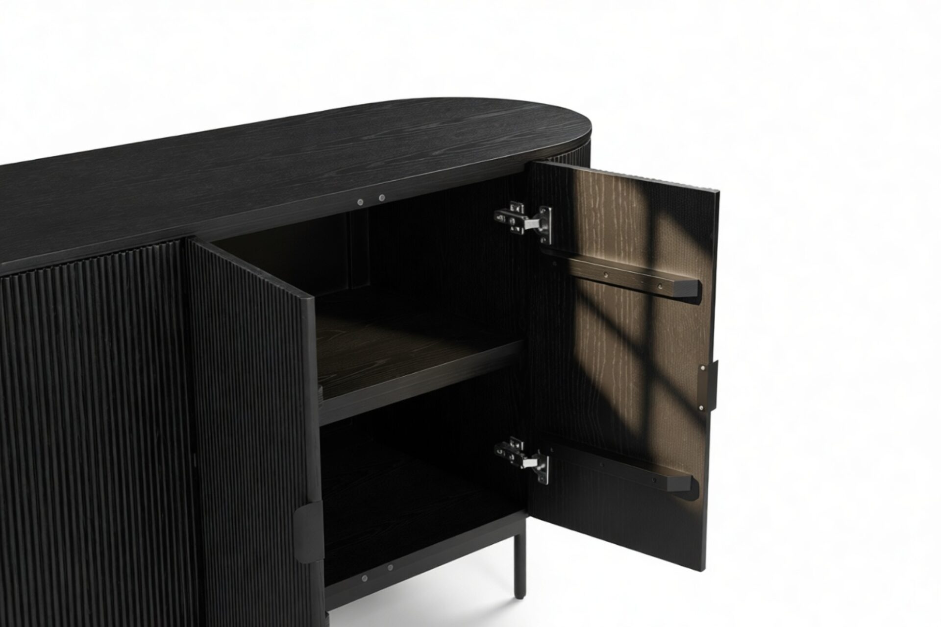 Introducing the Emeryn Fluted Sideboard, a striking furniture piece that seamlessly merges minimalism with captivating design. Constructed from wood in a sophisticated matte black finish, this sideboard features delicately fluted sides and a gracefully curved body, resulting in a refined silhouette. Its clean lines are accentuated by sleek handles that flawlessly complement the overall aesthetic. Elevated on slender metal legs, this sideboard exudes a modern charm and provides two generous storage compartments with shelves for effortless organization and clutter concealment. Beyond its practical functionality, the Emeryn Fluted Sideboard serves as a statement piece in any space. The bold black hue and textural finish exude a refined and contemporary vibe that can effortlessly enhance the décor of a dining area, living room, or entryway. With its seamless blend of style and utility, this sideboard adds versatility to contemporary interiors.