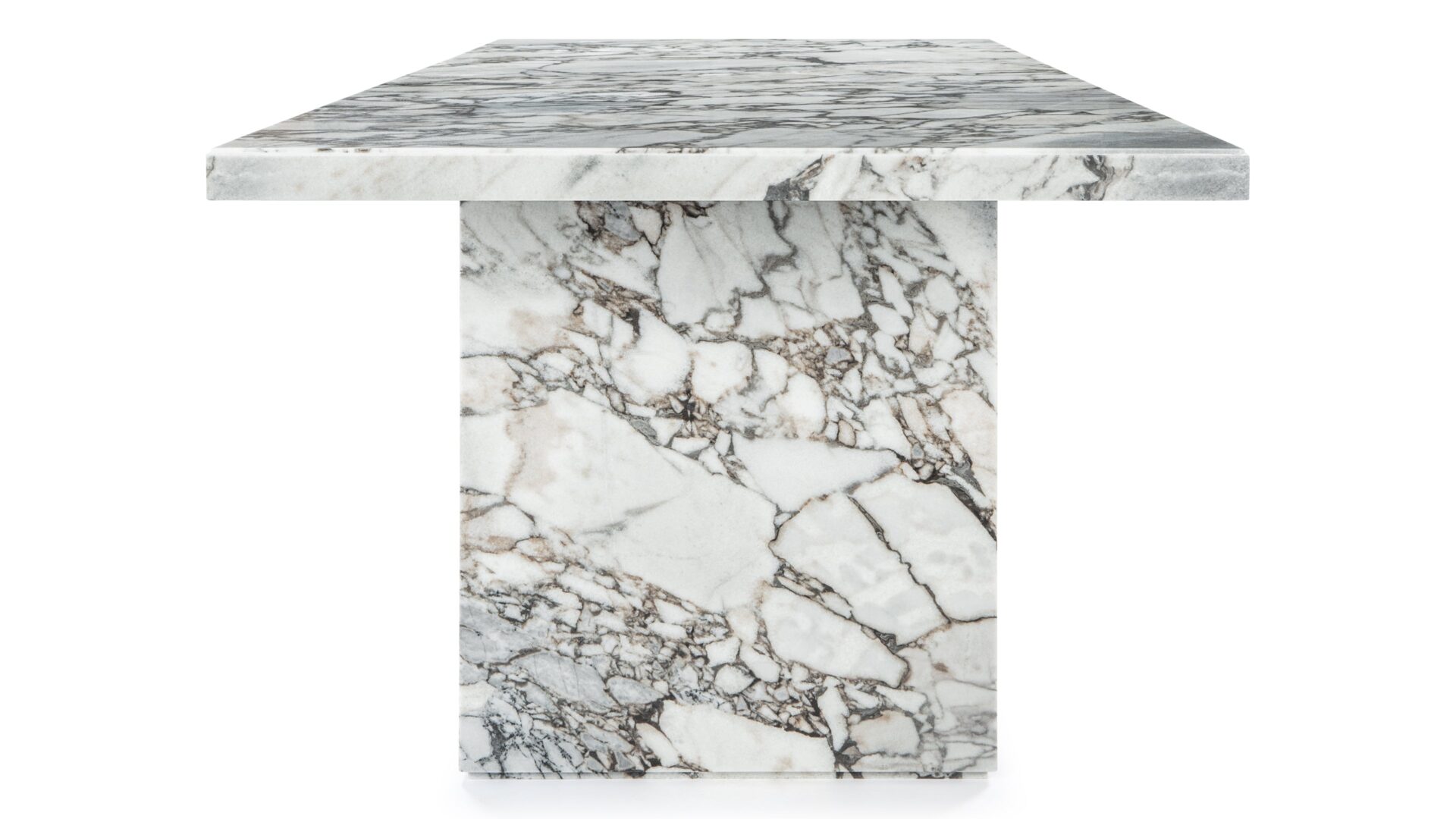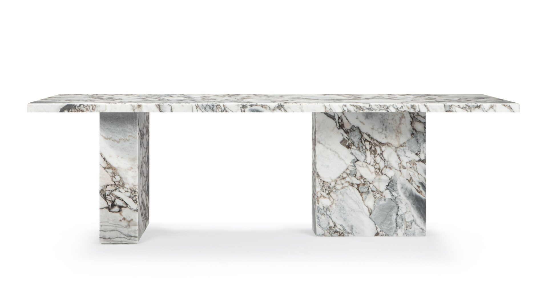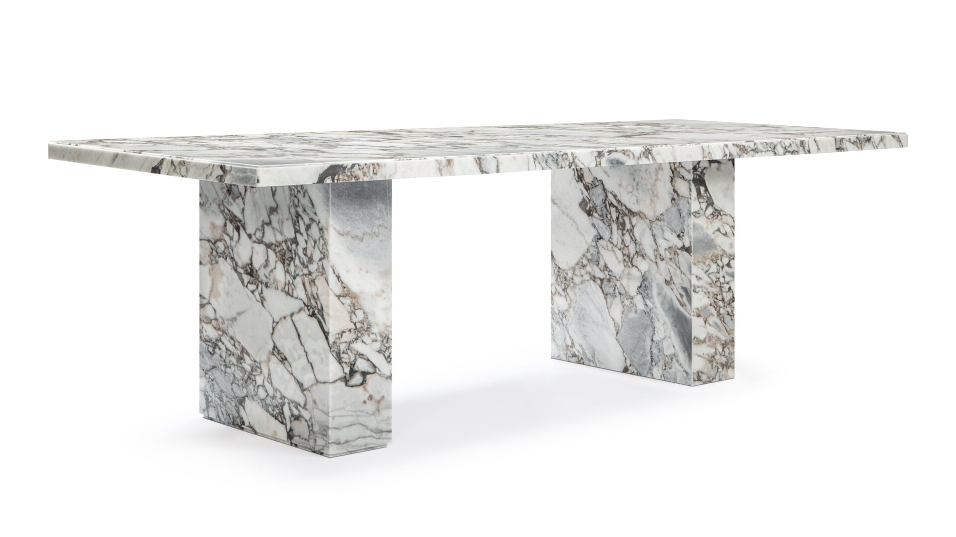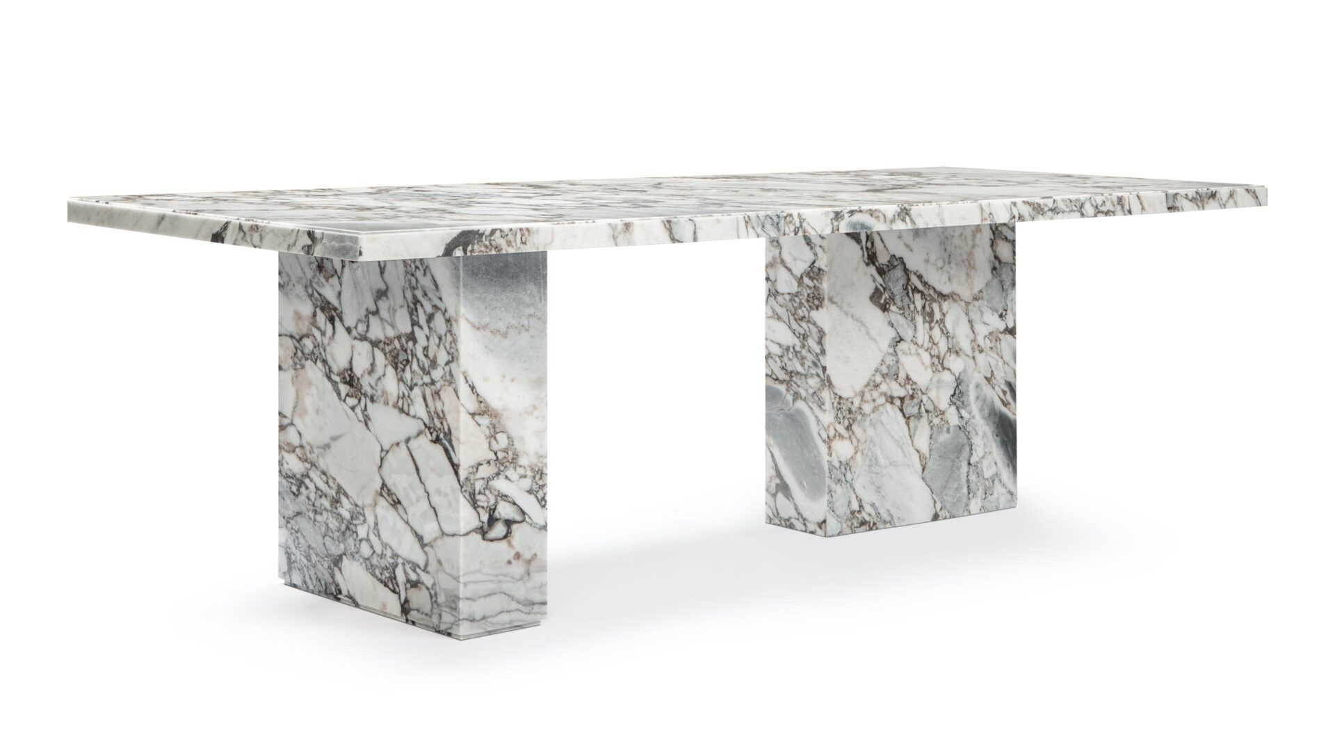 Elevate your dining experience with the Enzo Dining Table featuring a striking Modellato Marble top that spans 98 inches. Accommodating up to eight guests, its innovative dual base system effortlessly transitions between symmetry and asymmetry. For a touch of rustic refinement, explore the exquisite natural stone craftsmanship offering unique veining and textures, enhancing every mealtime setting.