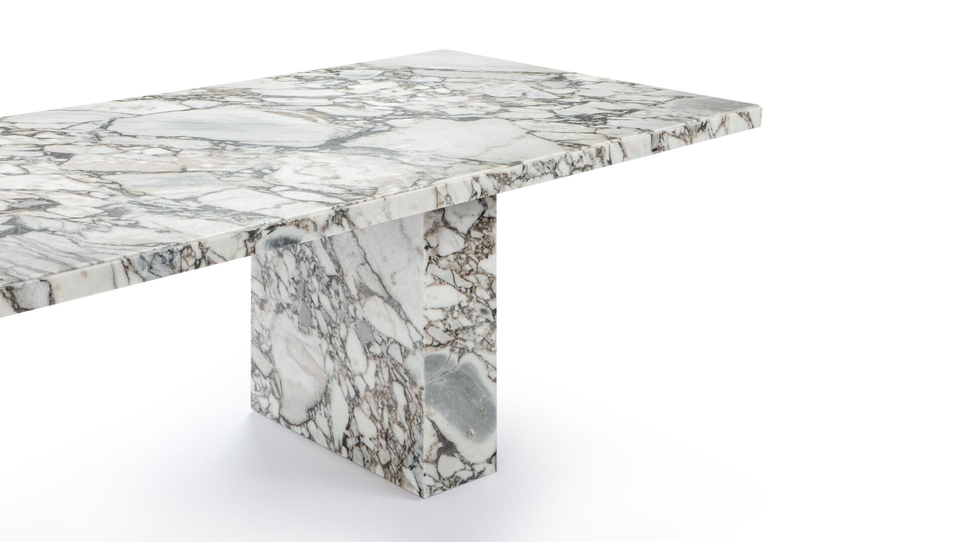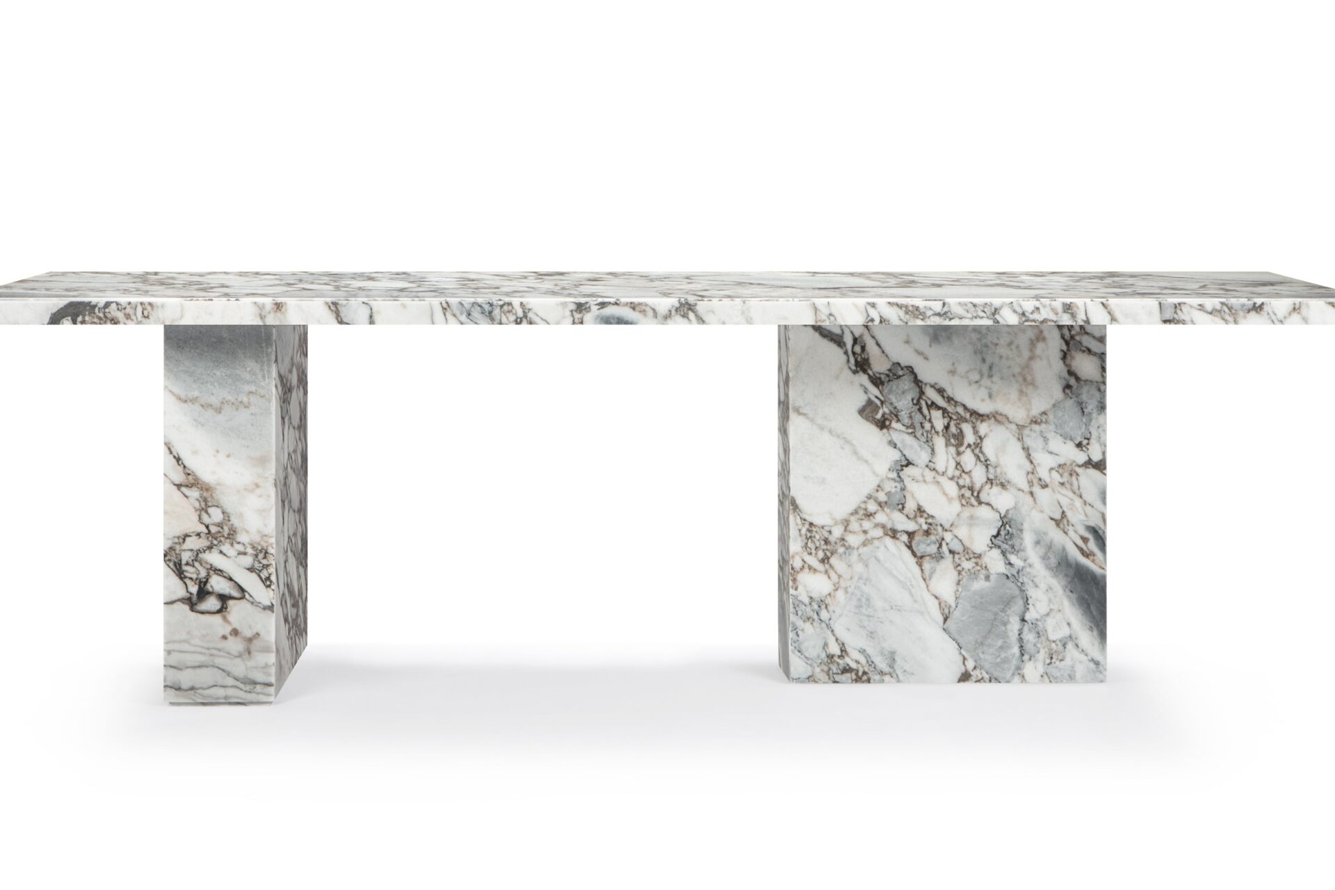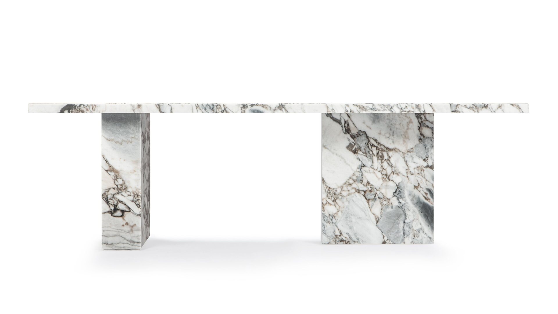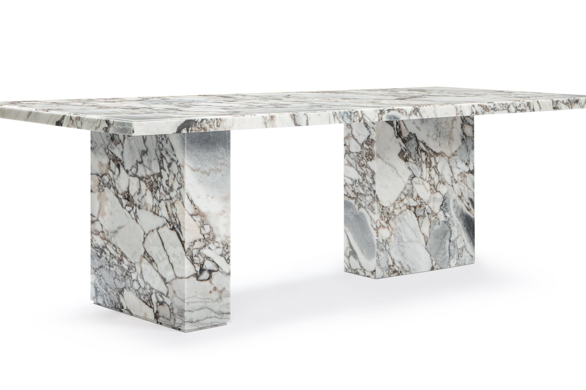 Elevate your dining experience with the Enzo Dining Table featuring a striking Modellato Marble top that spans 98 inches. Accommodating up to eight guests, its innovative dual base system effortlessly transitions between symmetry and asymmetry. For a touch of rustic refinement, explore the exquisite natural stone craftsmanship offering unique veining and textures, enhancing every mealtime setting.