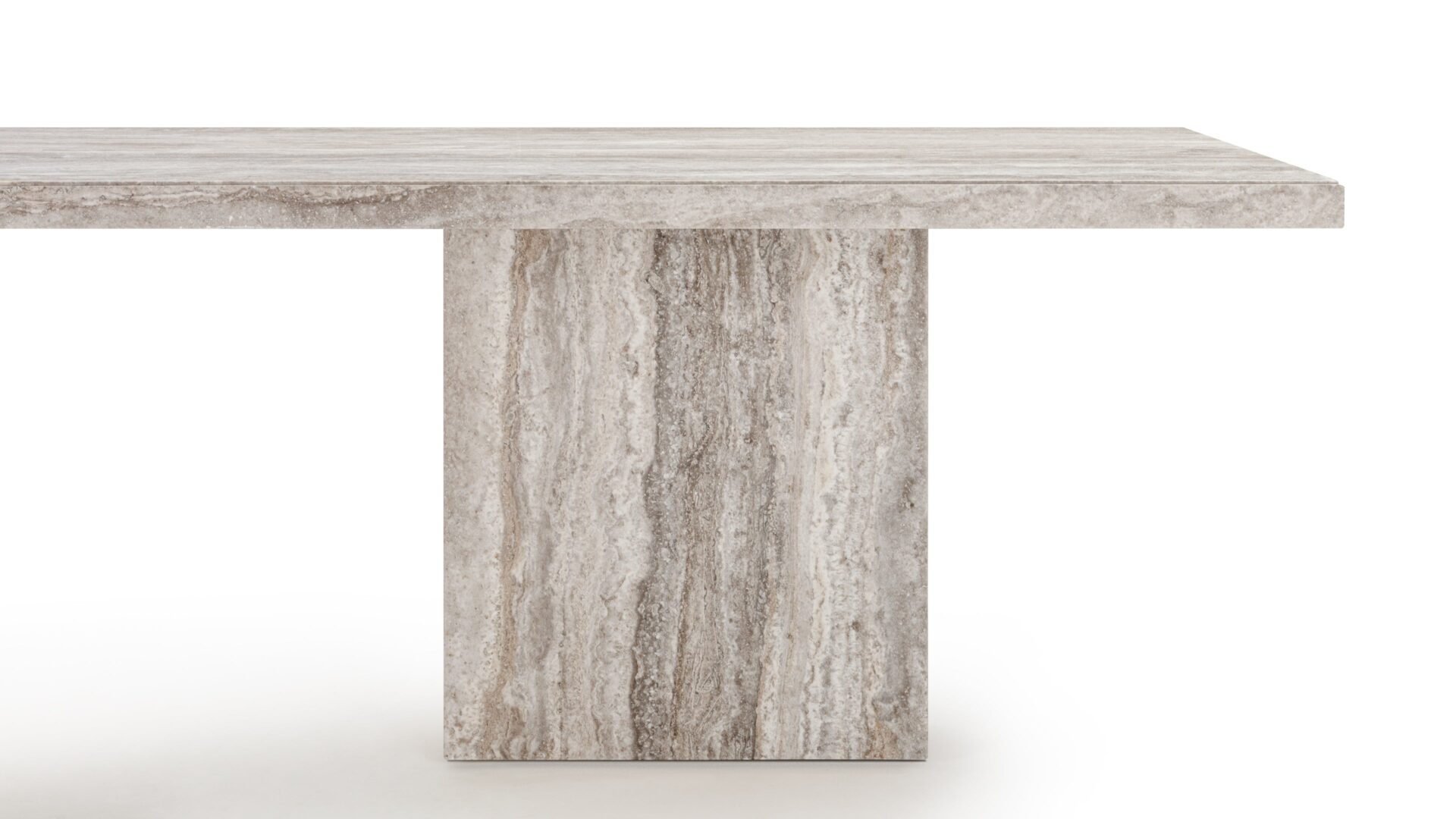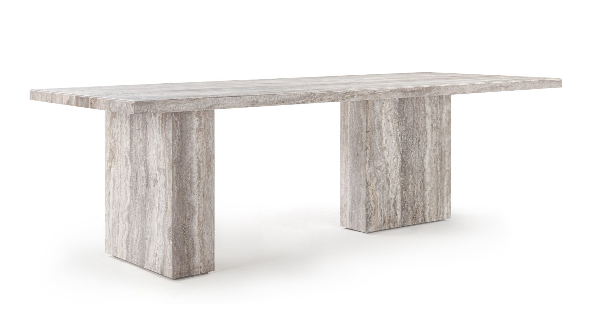 Elevate your dining experience with the Enzo Dining Table crafted from exquisite Silver Travertine. Its vast 98-inch tabletop hosts up to eight guests, ensuring memorable gatherings. The table's dual base system seamlessly transitions between symmetrical elegance and asymmetrical intrigue with a simple touch, making it a sculptural masterpiece. Explore the Cooper Dining Table's meticulous geometric precision and the rustic refinement of natural stone details for a sophisticated dining space transformation.
