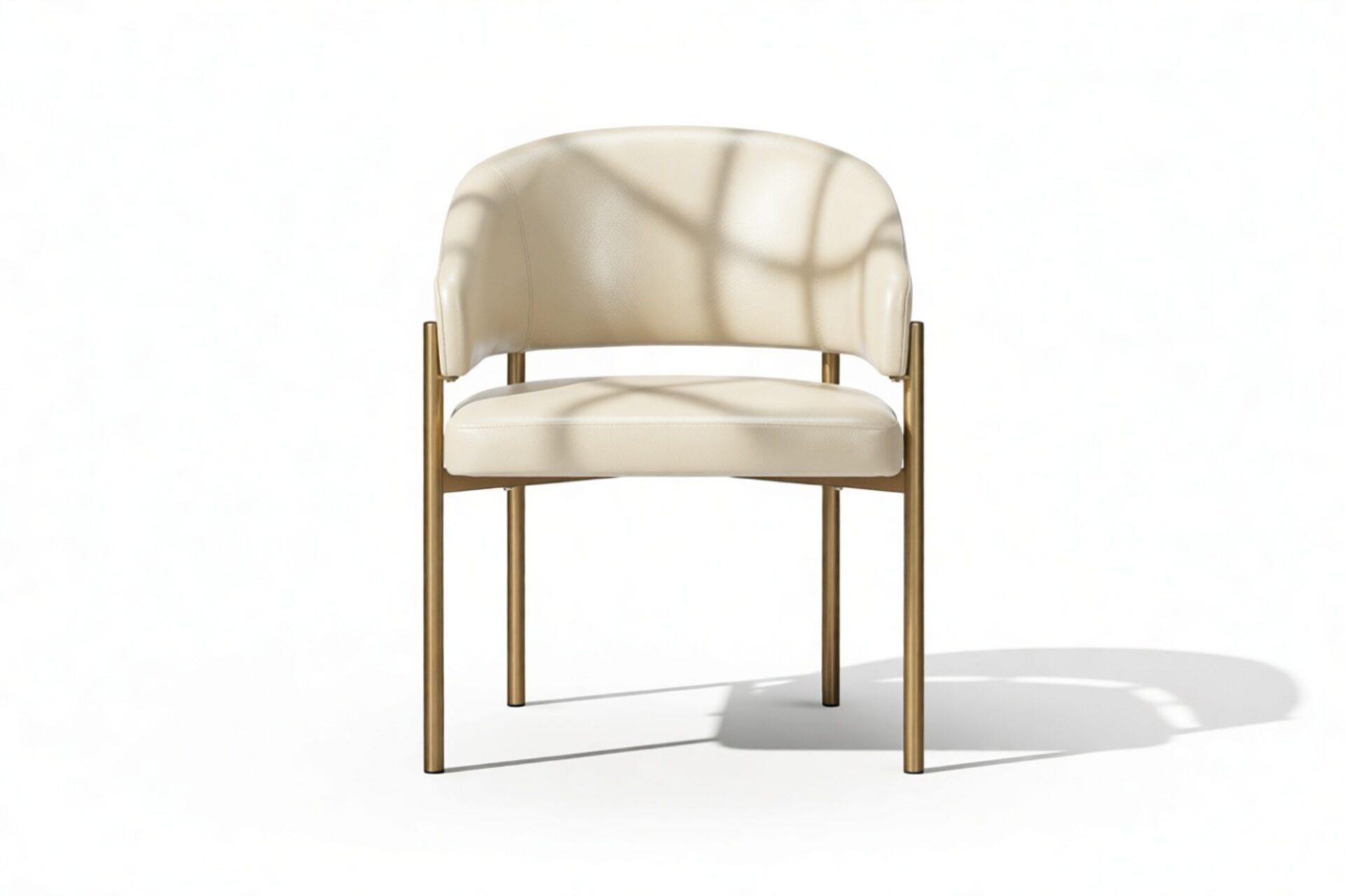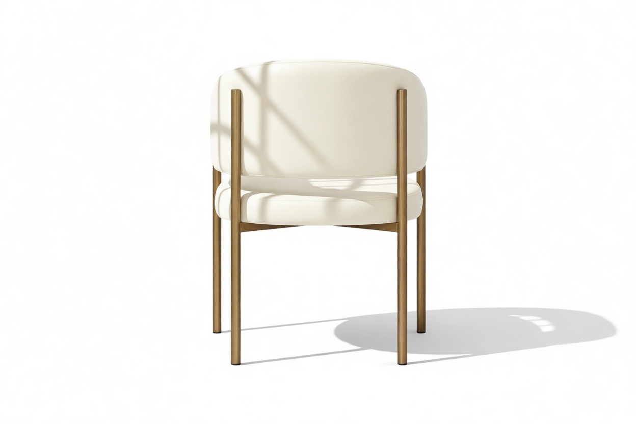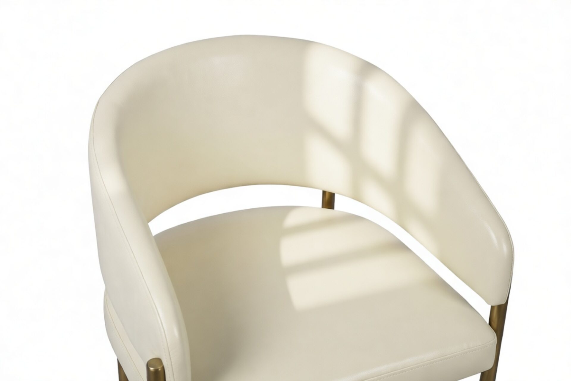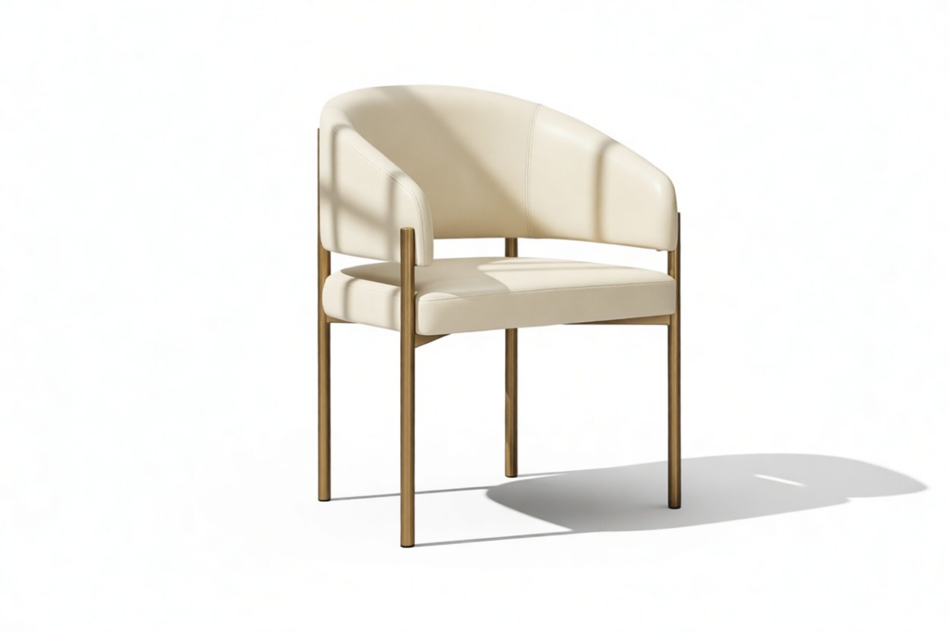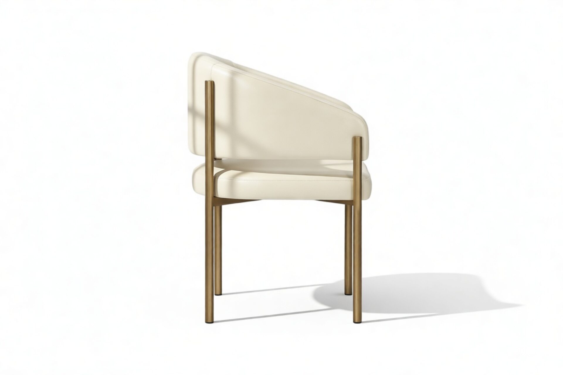 Elevate your dining experience with the exquisite Esther Dining Chair, a fusion of Italian flair, contemporary design, and superior comfort. Crafted with Eggshell Vegan Leather for an elegant touch, its brushed brass metal legs exude vintage charm. Indulge in luxurious comfort with Luxe Fabric upholstery, radiating opulence and style in every meal.