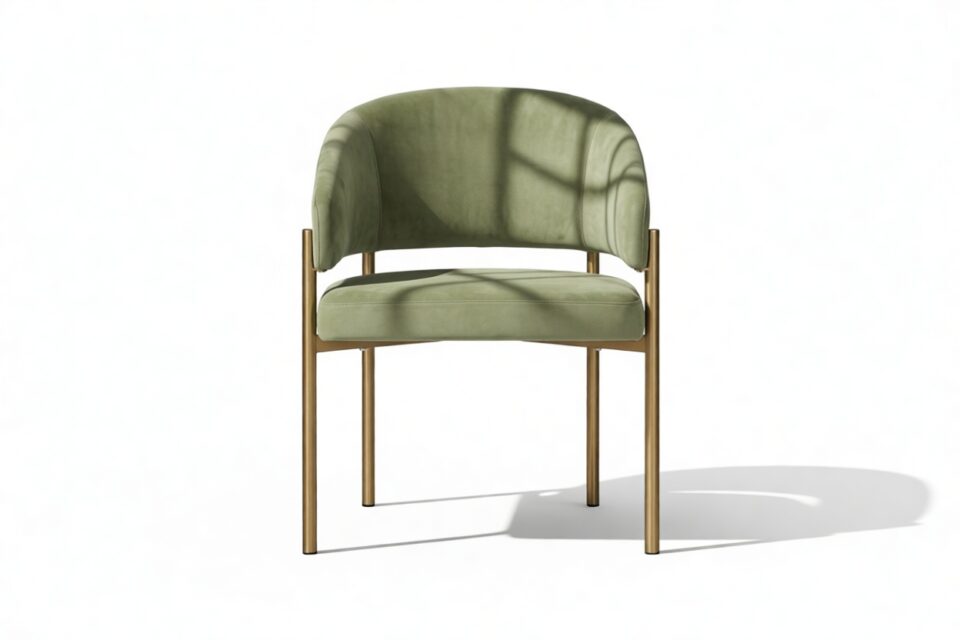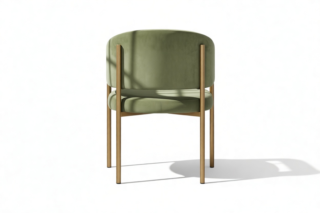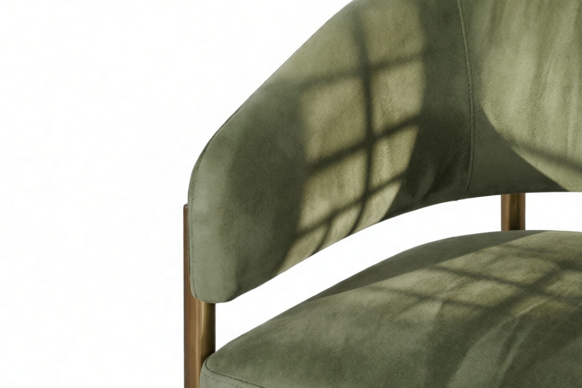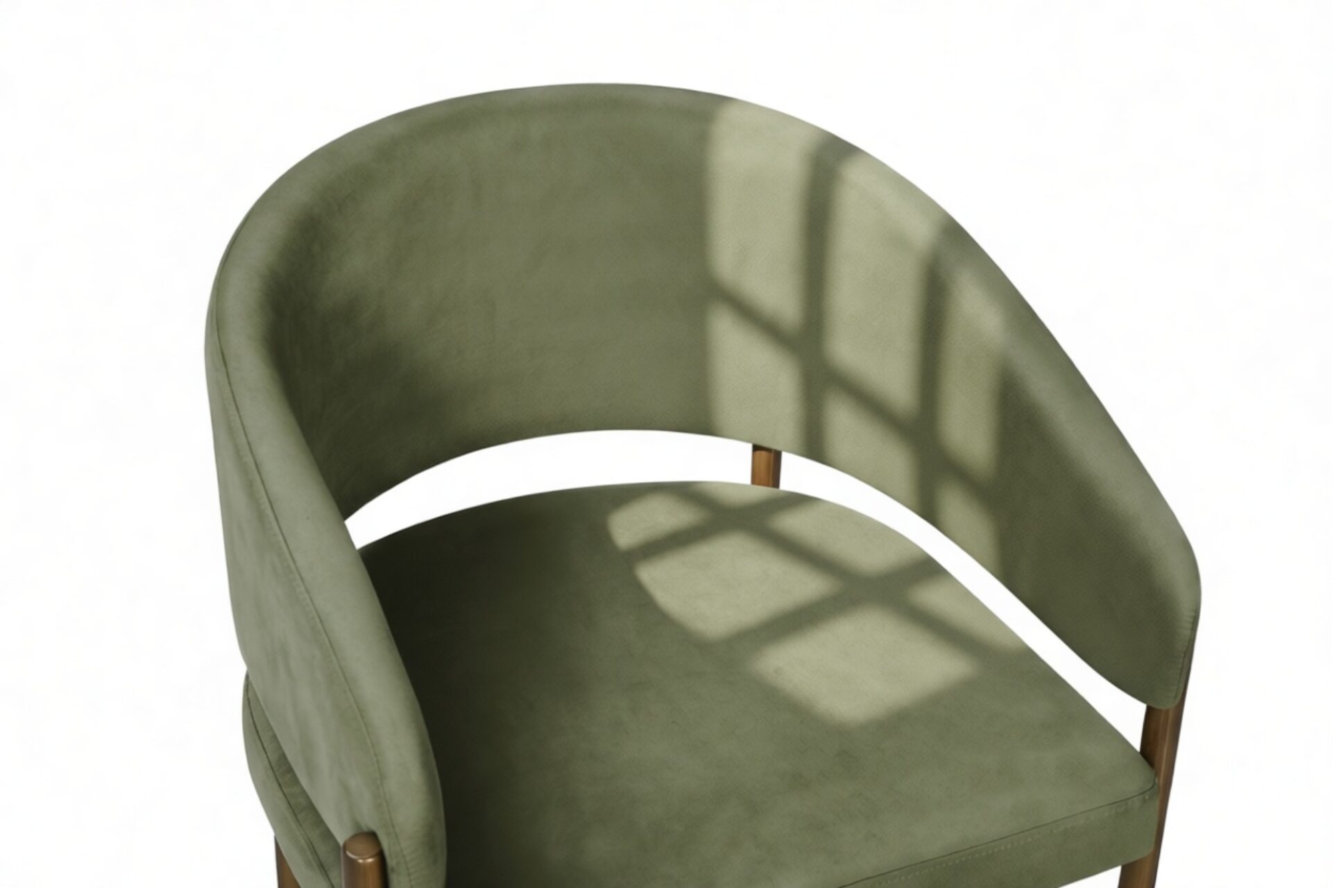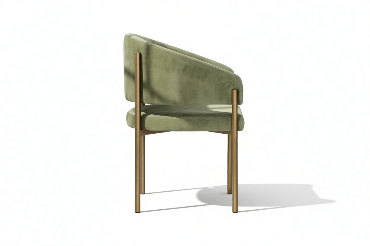 Experience dining in chic sophistication with the Esther Dining Chair in Sage Vegan Suede and Brushed Brass. This elegant piece seamlessly blends Italian flair with modern design, offering sumptuous comfort and durable luxury. With its exquisite faux suede upholstery and antique brass legs, this chair exudes opulence and style, perfect for elevating any dining space.