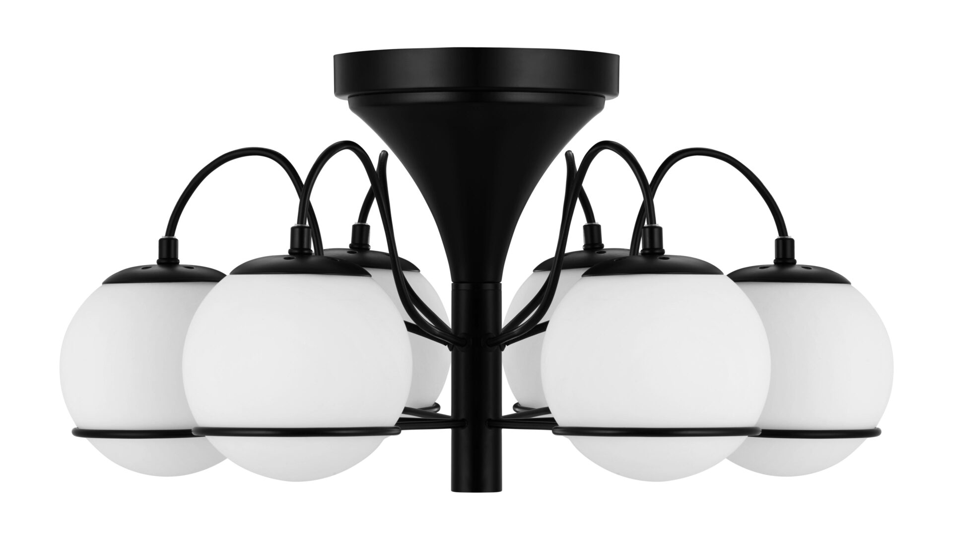 Fashioned from durable iron metal, this chandelier features a sleek matte black finish, complemented by delicate white glass globes that amplify its sophisticated, modern charm.