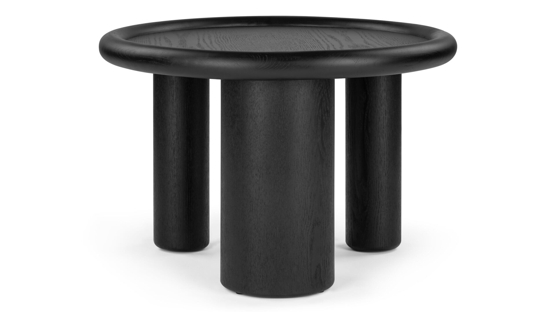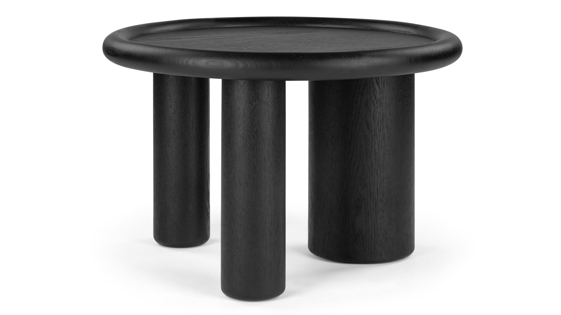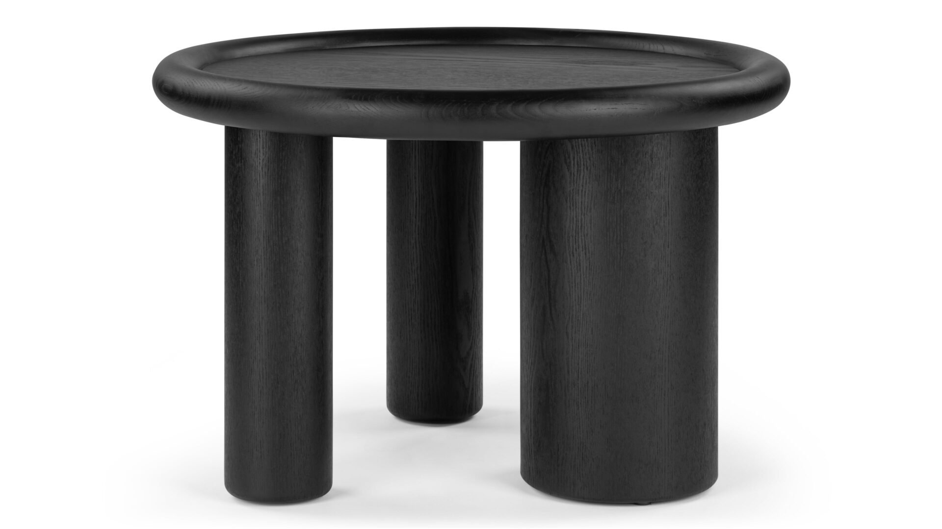 Elevate your space with the Farro Side Table, a sleek matte black piece with wood grain detailing for a sophisticated touch. Unique tubular legs add visual interest, while its chunky proportions and rounded shapes exude playful charm. This versatile table not only adds surface area but also enhances any room's style. Pair with the corresponding coffee table for a cohesive look.