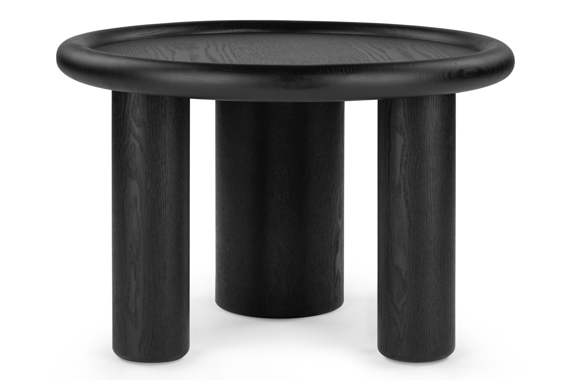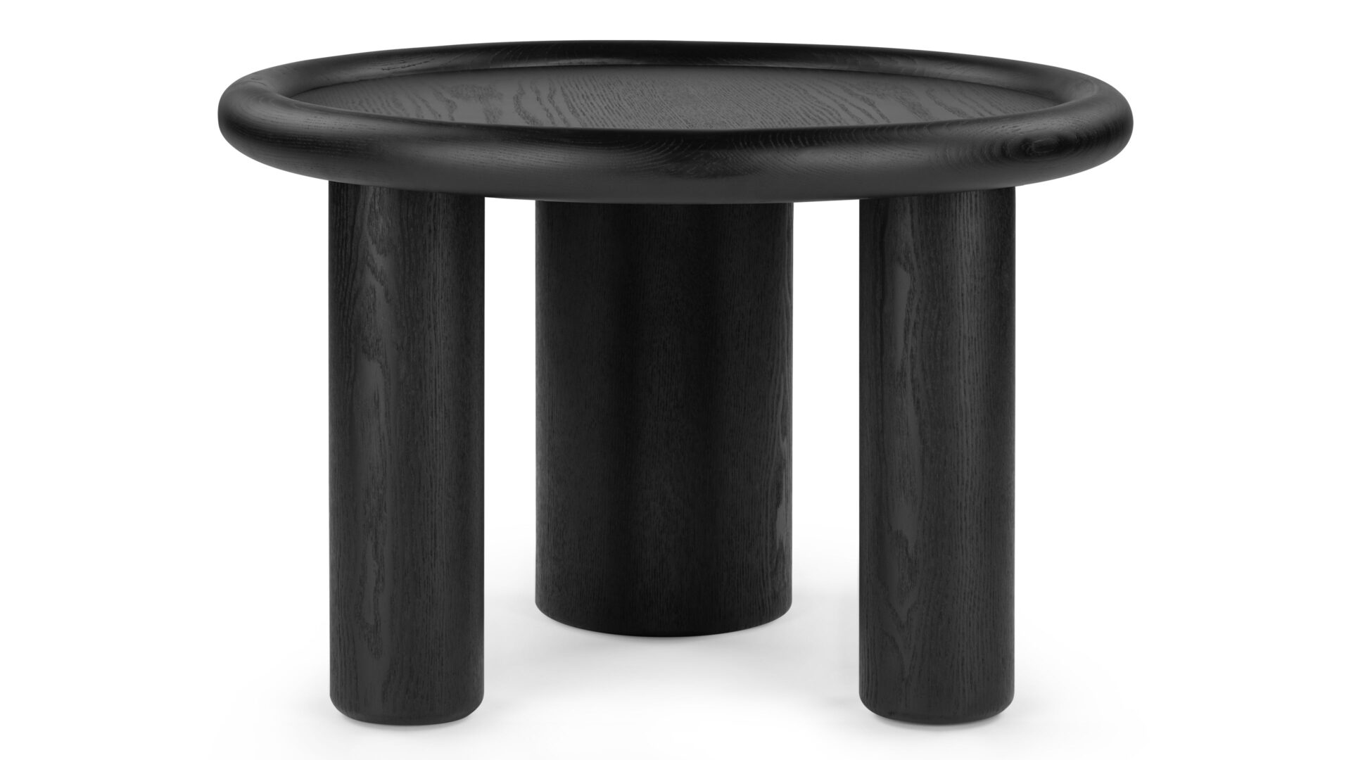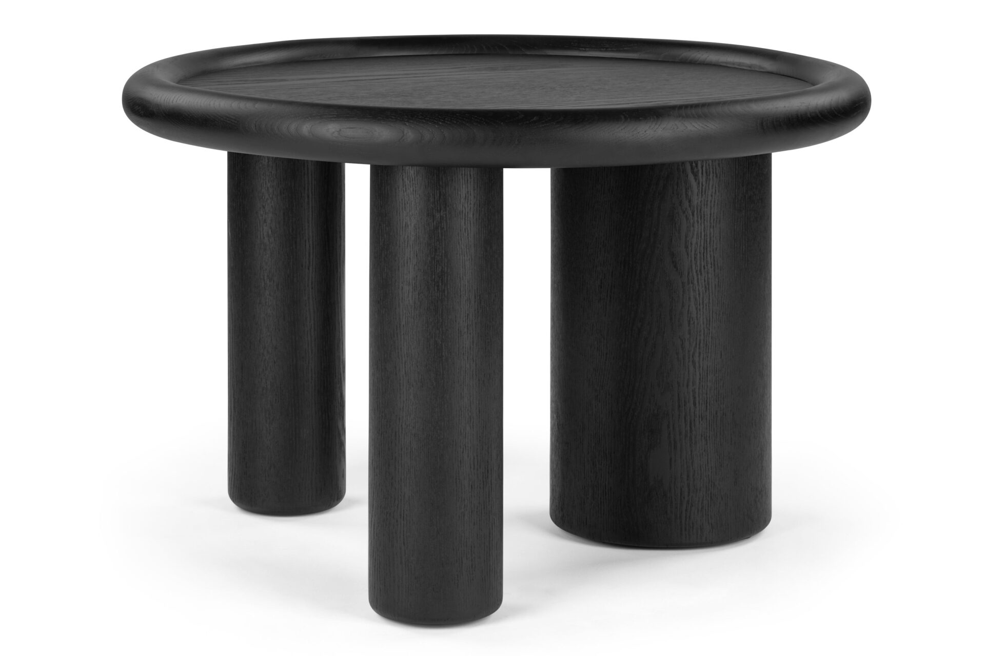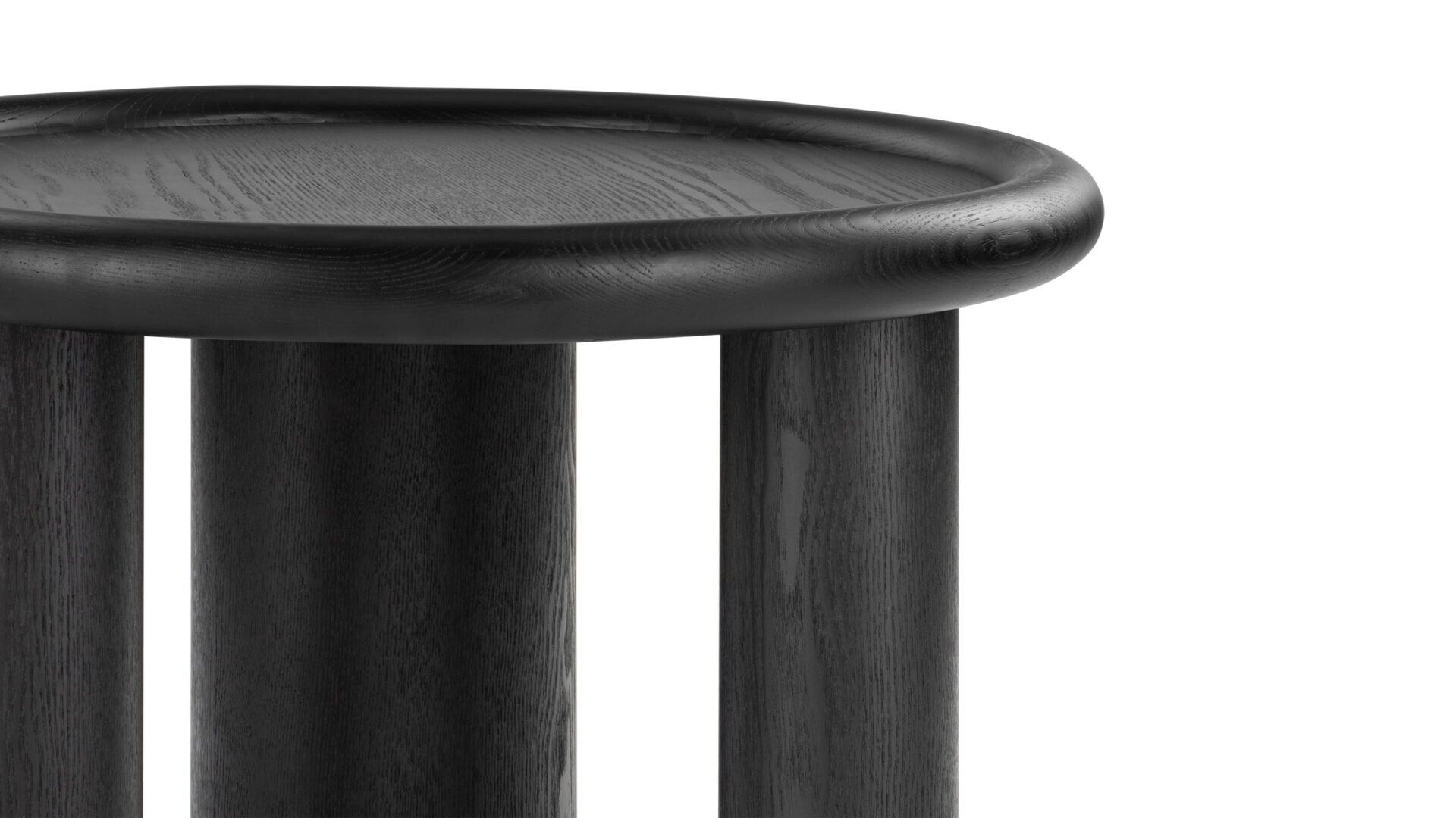 Experience the contemporary charm of the Farro Side Table, showcasing a sleek matte black finish accentuated by wood grain detailing for a striking and sophisticated look. The circular top boasts a refined rounded lip, while the table is supported by uniquely sized tubular legs, featuring one leg wider than the rest. Embrace the playful aesthetics of its chunky proportions and rounded shapes that offer a touch of visual softness to your space. This versatile side table not only serves a functional purpose by providing extra surface area, but also elevates the style quotient of any room. For a cohesive and visually appealing ambiance, consider pairing it with the corresponding coffee table.