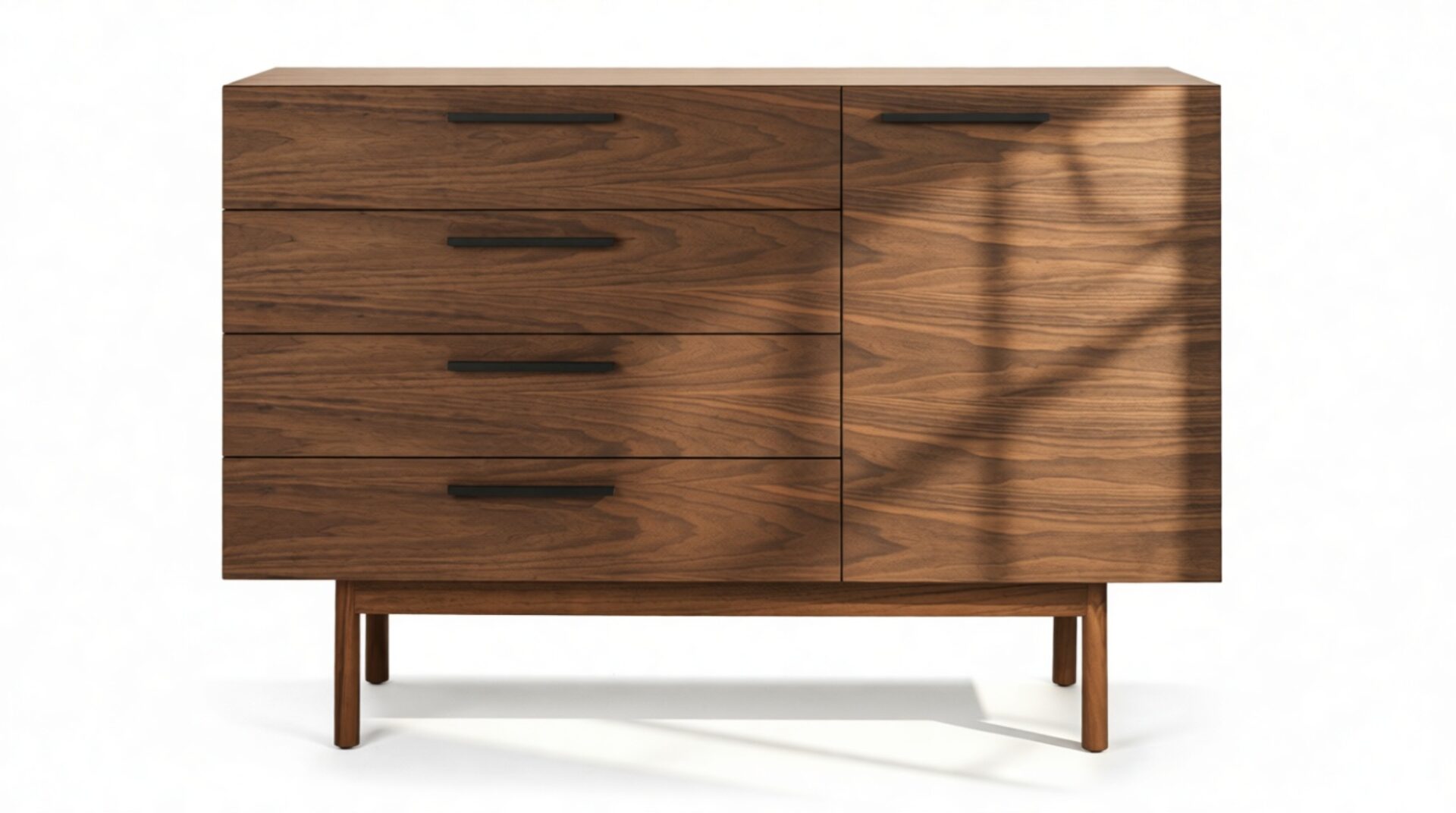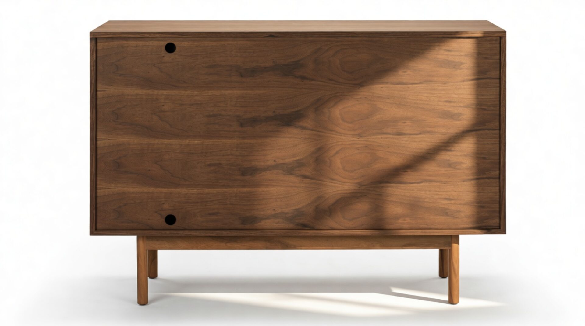 Enhance your space with the elegant credenza showcasing a stunning walnut veneer and sturdy solid walnut wood legs, uniquely angled and tapered for a modern touch. This enduring piece is designed to complement both casual and formal settings for years to come.