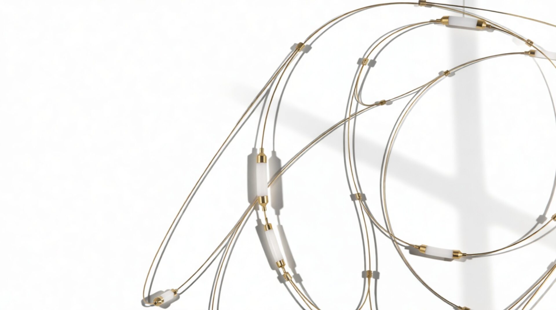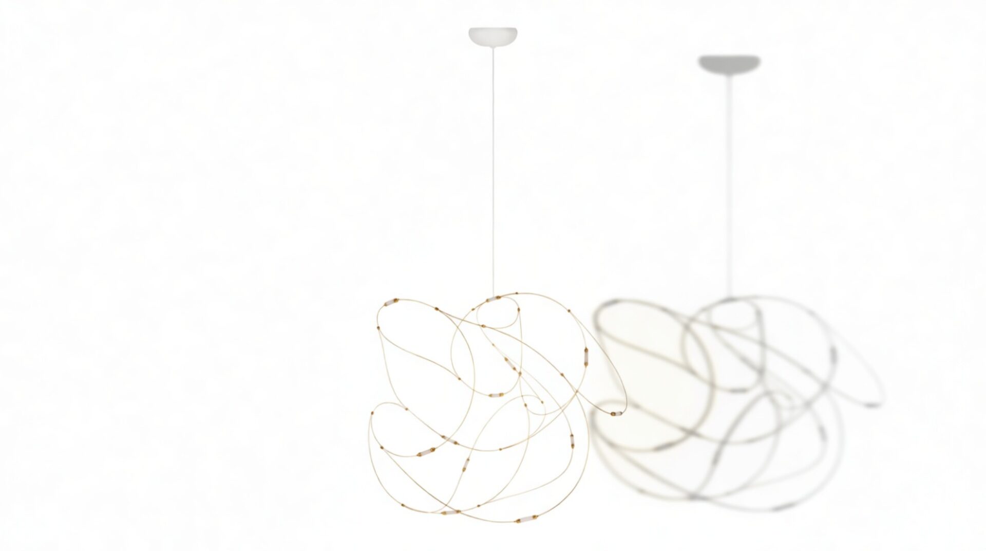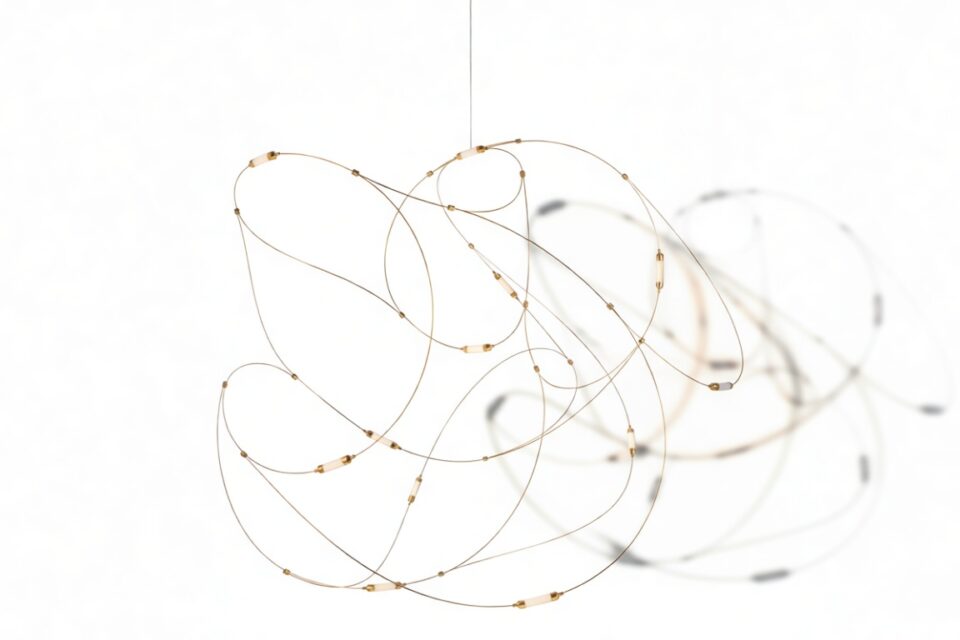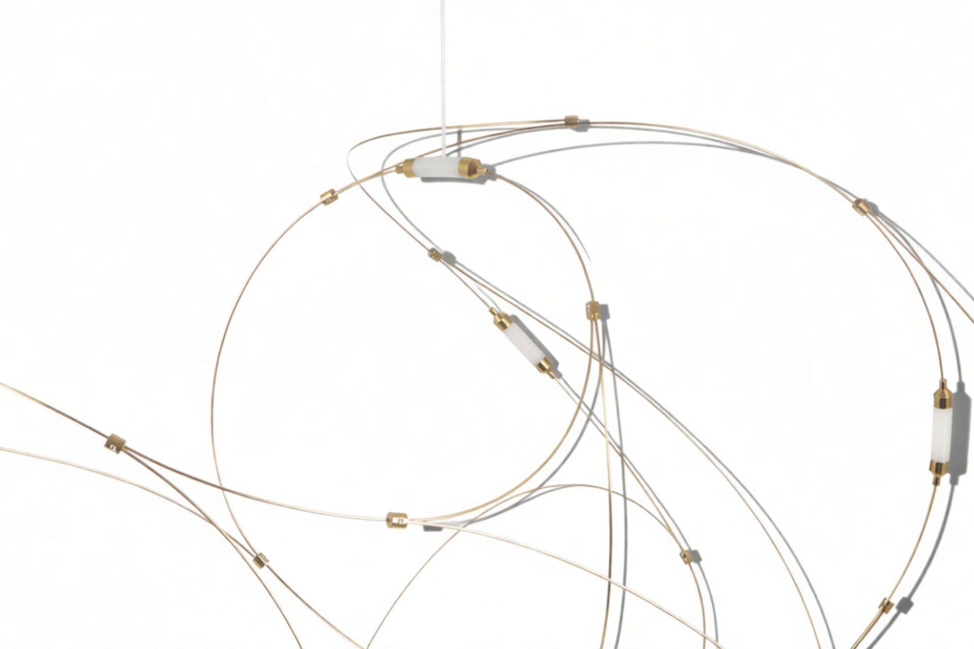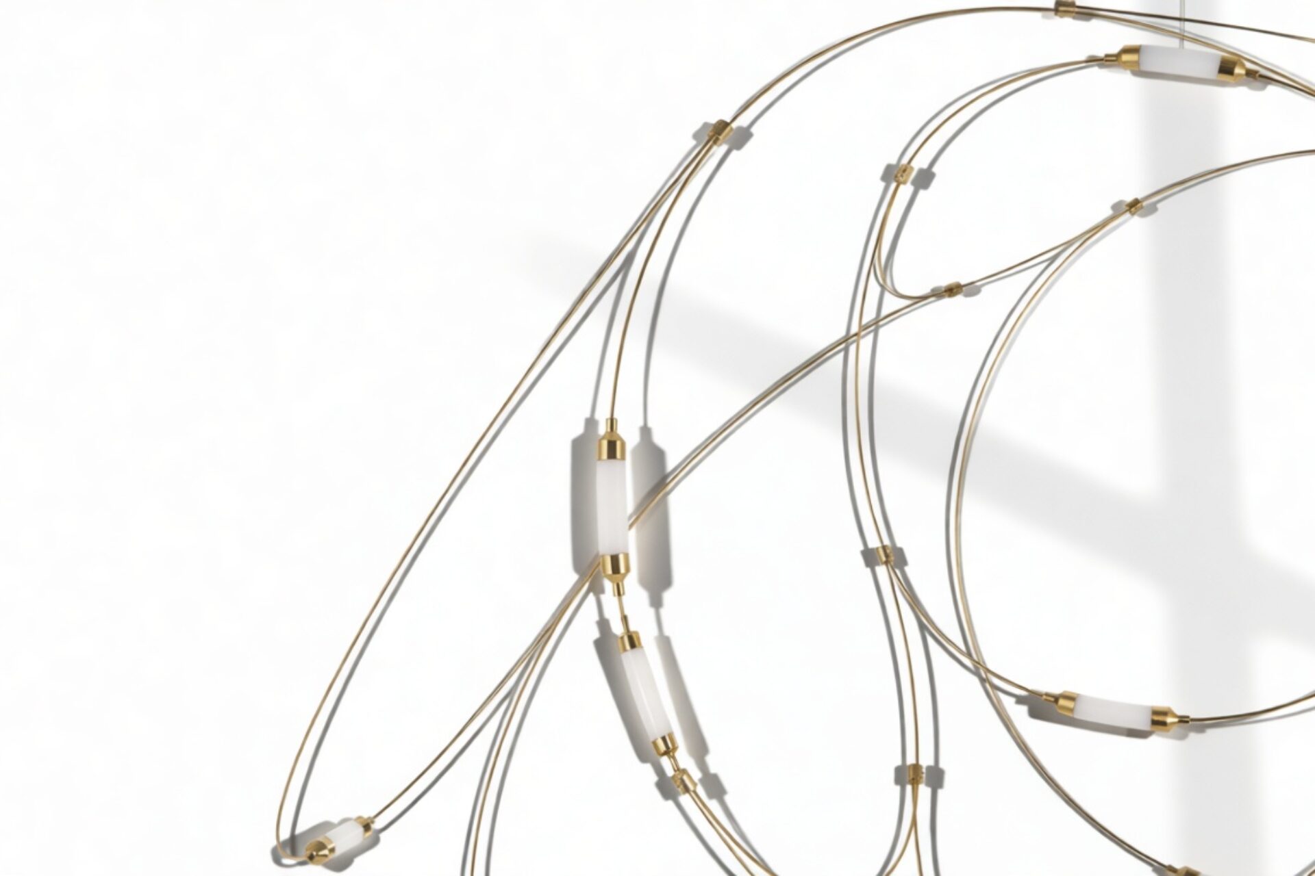 Crafted from brass wire, this chandelier is embellished with delicate LEDs that mimic twinkling light, creating a gentle and enchanting radiance. Its sleek design, inspired by the cosmos, makes it an eye-catching addition to modern settings, enriching the atmosphere with a subtle yet powerful aesthetic.