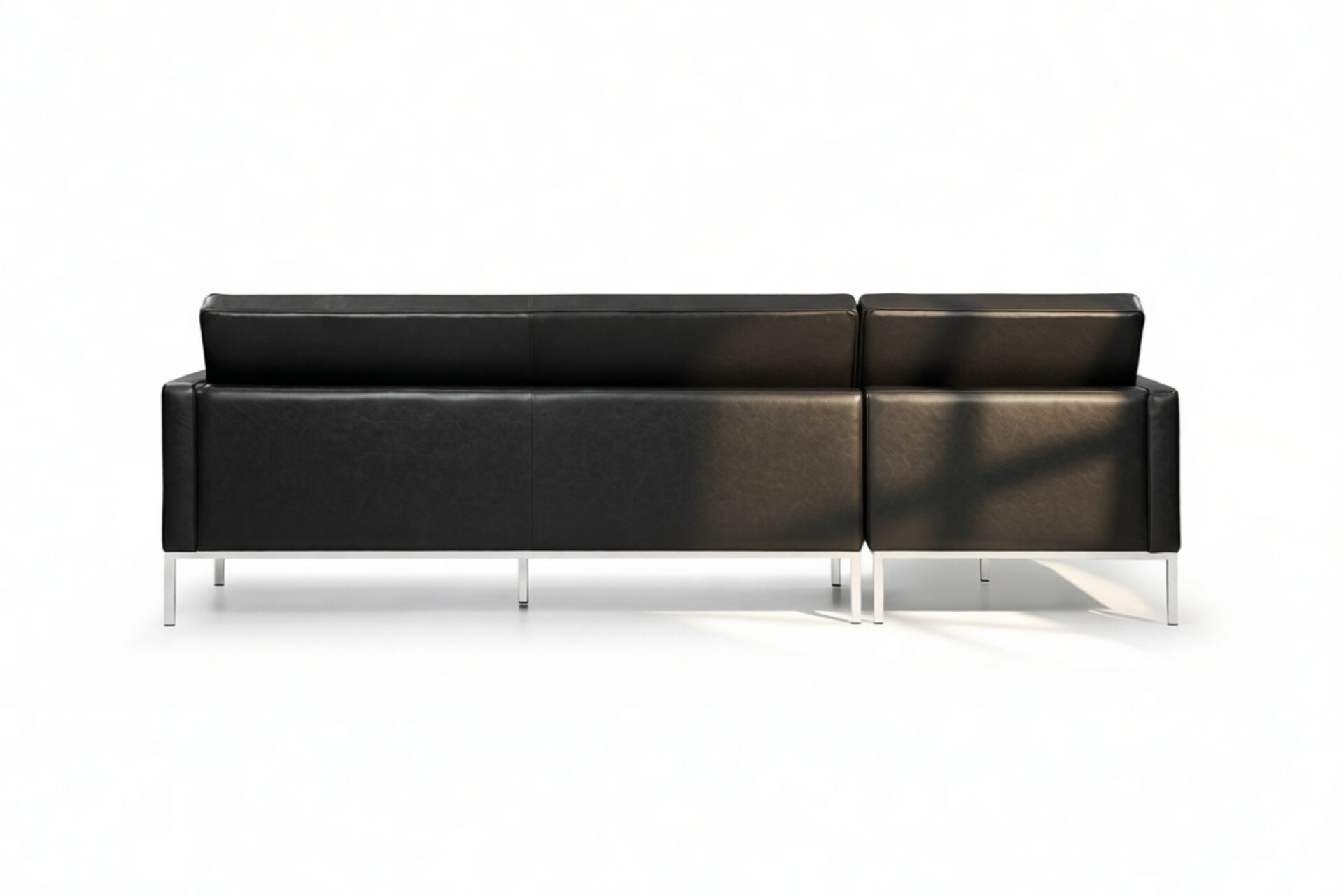 Elevate your space with the enduring charm and effortless elegance of the iconic XYZ three-seater sofa in Midnight Black Premium Leather. Showcasing a classic contemporary style, this timeless masterpiece of modernist design flawlessly combines form and function. Crafted to embody mid-20th-century modernism, it seamlessly transitions between modern living rooms and professional office environments, symbolizing design sophistication at its best.