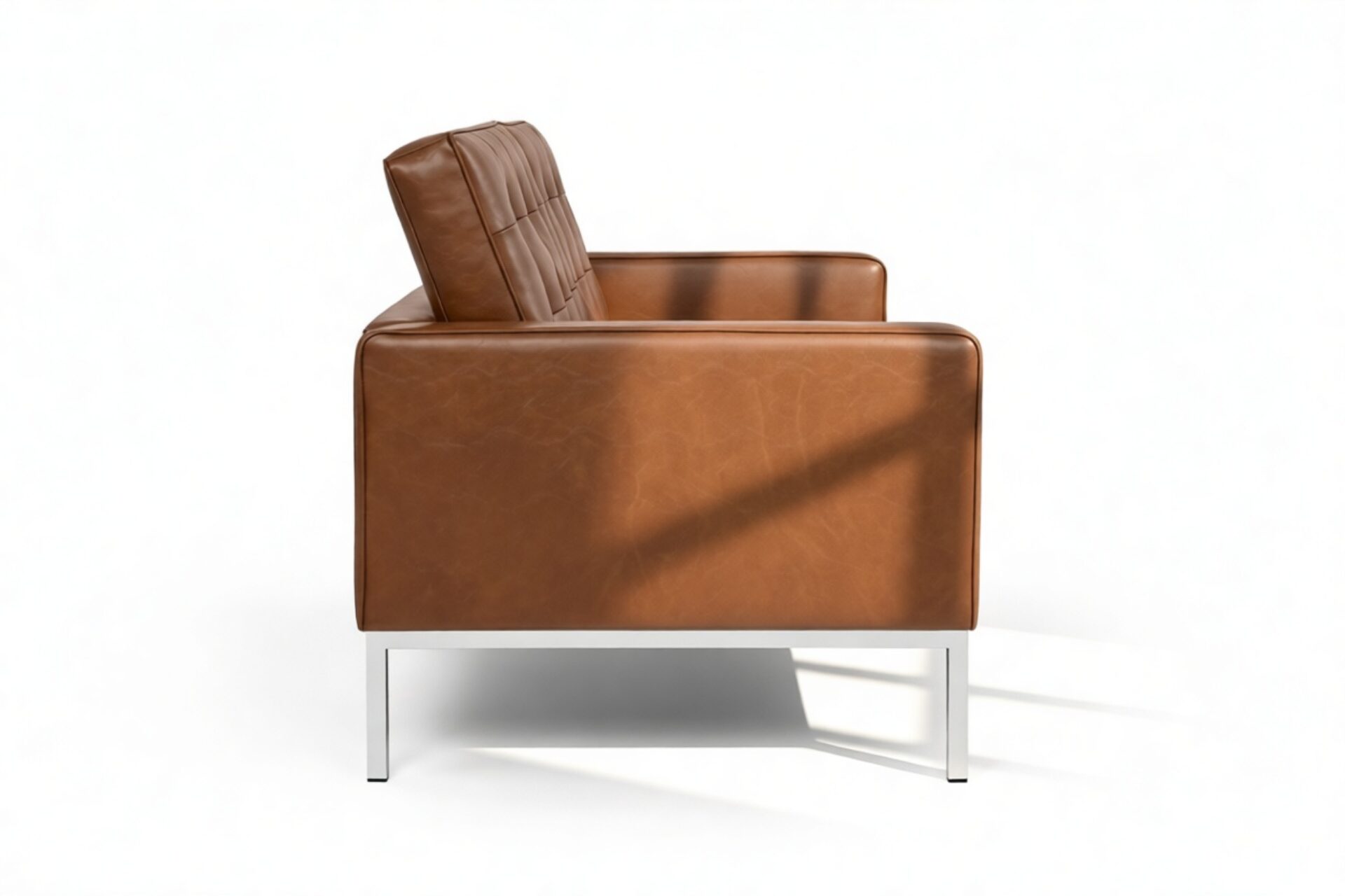 Elevate your space with the timeless appeal of the iconic Florence Two Seater Sofa in Tan Premium Leather. Boasting charm and effortless elegance, this beloved piece is a sought-after seating option for both stylish residences and commercial settings. Meticulously crafted to capture the spirit of mid-20th-century modernism, the Florence Sofa seamlessly fuses form and function with its classic contemporary style. Experience the essence of mid-20th-century modernism with the Florence Sofa in Tan Premium Leather, showcasing clean lines and meticulous attention to detail. Effortlessly blending a minimalist aesthetic with a refined design approach, the Florence Sofa advances beyond fundamental concepts, making it a versatile option for diverse settings.