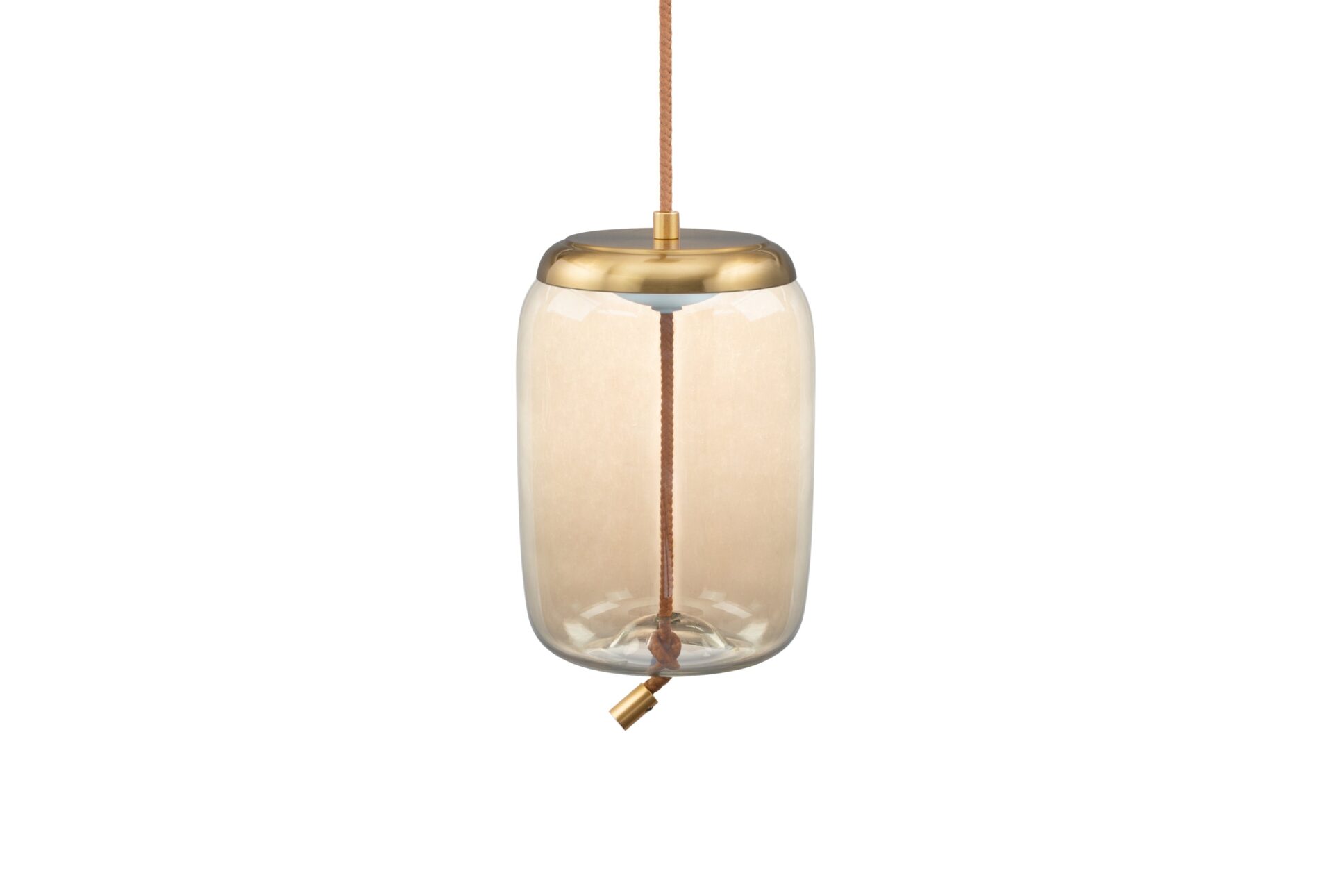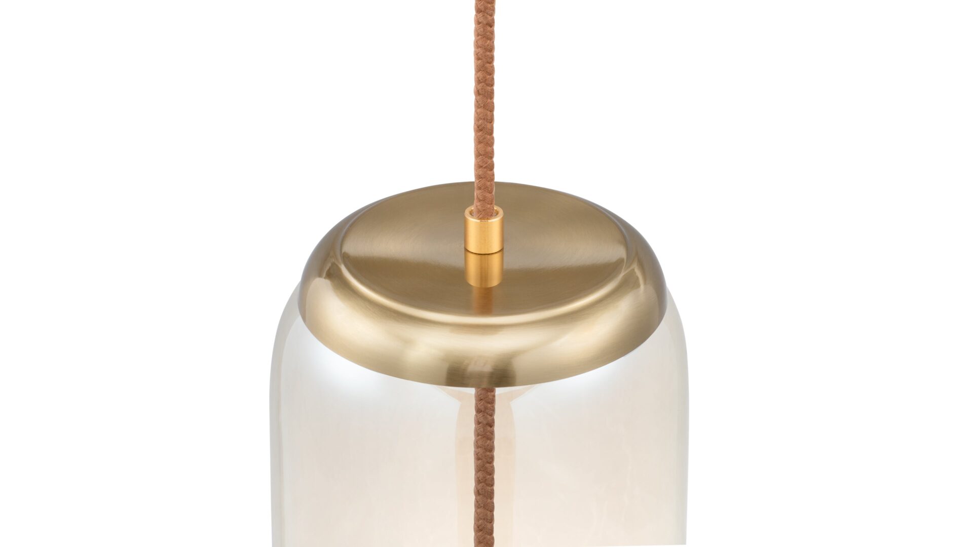 Illuminate your space with the exquisite Geneva Pendant. Embodying a fusion of traditional glass craftsmanship and contemporary design elements, this eye-catching lighting fixture features glass with a subtle amber tint that casts a warm and welcoming ambiance. The energy-efficient LED light source is complemented by iron fittings in a brass finish, gracefully curving over the pendant to elegantly direct light downwards, imbuing an air of refinement. Suspended from a unique burnt orange rope accented by a sleek metal stopper, the Geneva Pendant makes a striking focal point in any room. With its assorted rounded shapes, this pendant offers versatility – be it as a standalone statement or blended with other styles for an eclectic flair.