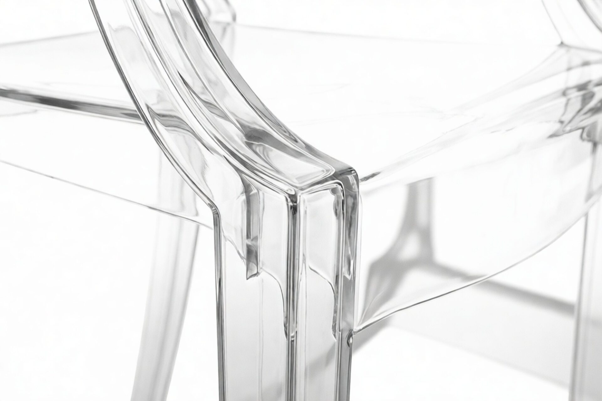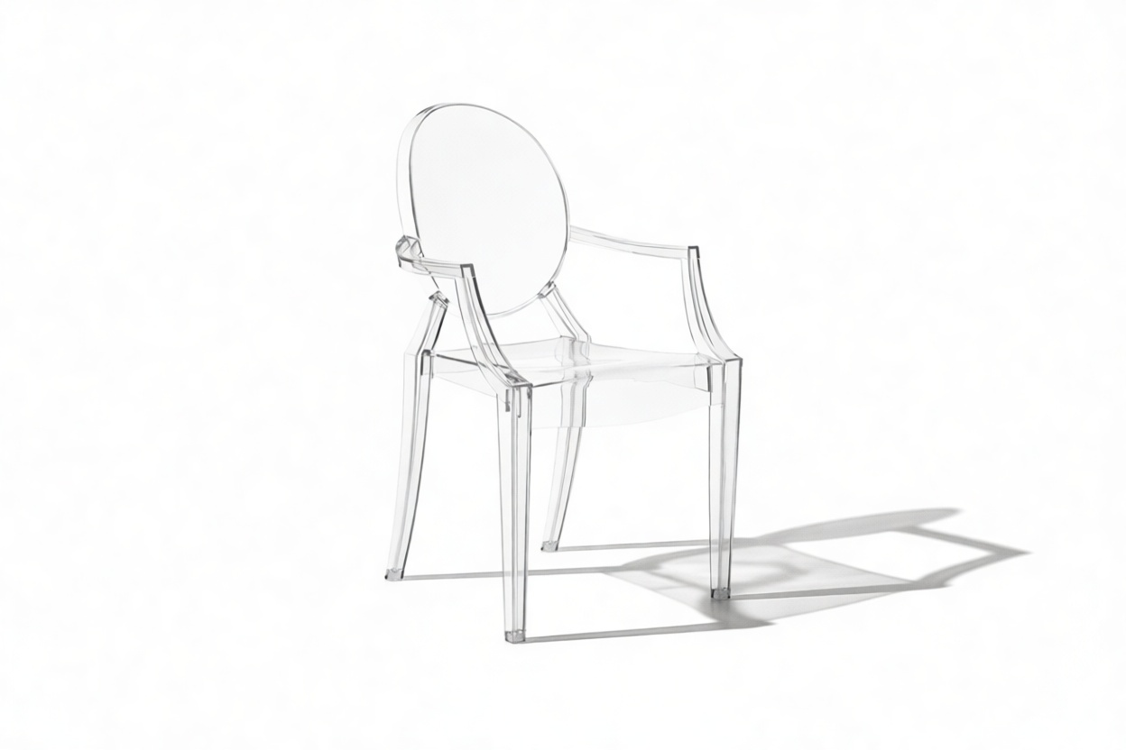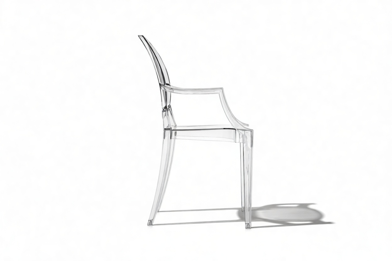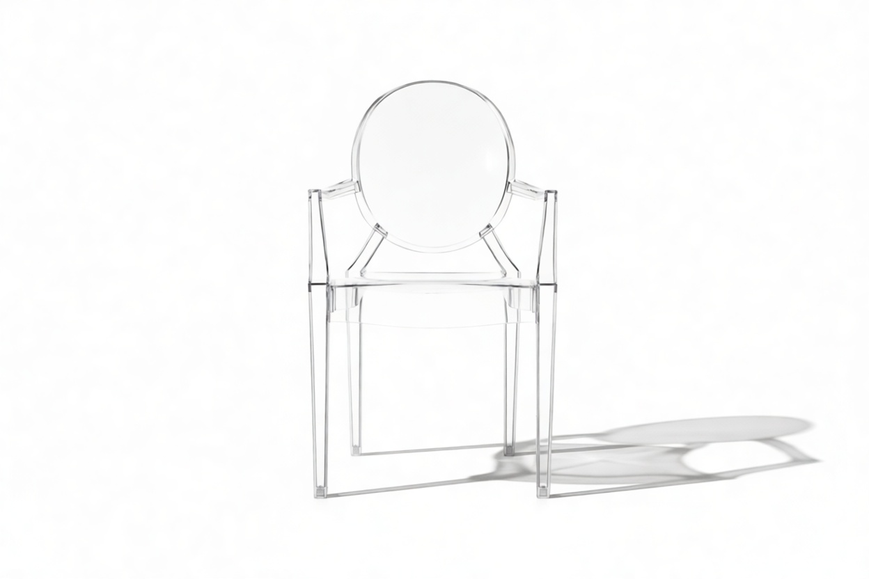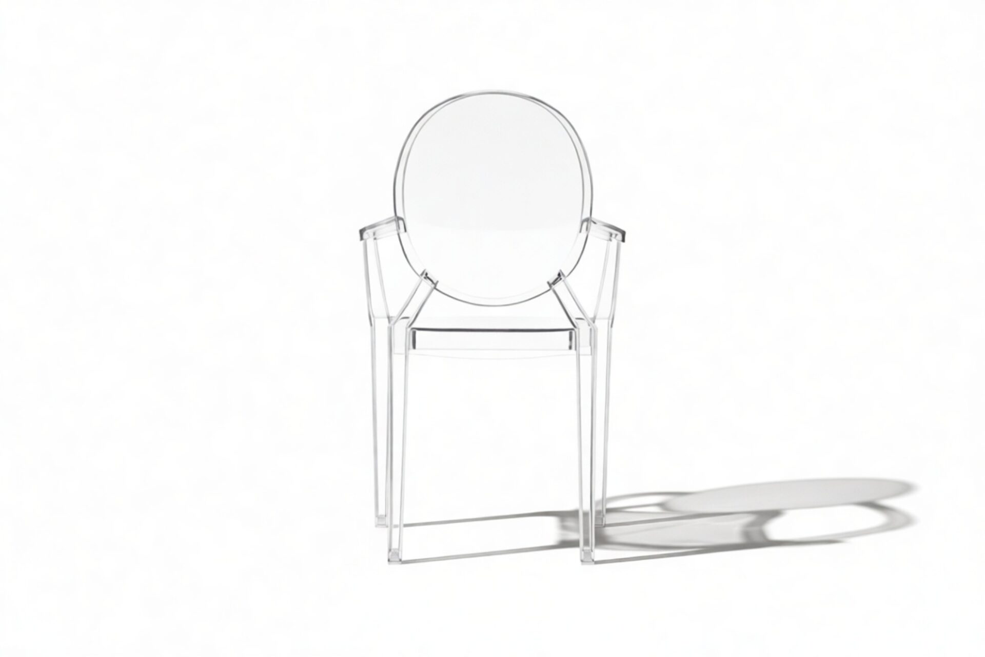 Experience the Ghost Chair, a striking reinterpretation of Louis XVI's iconic armchair. Crafted from resilient polycarbonate, it elegantly blends historical sophistication with contemporary flair. Witness the convergence of rich history and innovative design in this scratch-resistant piece that creates an illusion of weightlessness. Perfect for engaging conversations, it symbolizes opulence and grandeur, igniting dialogues on art, history, and modern aesthetics while achieving a technological milestone with its transparent appearance.