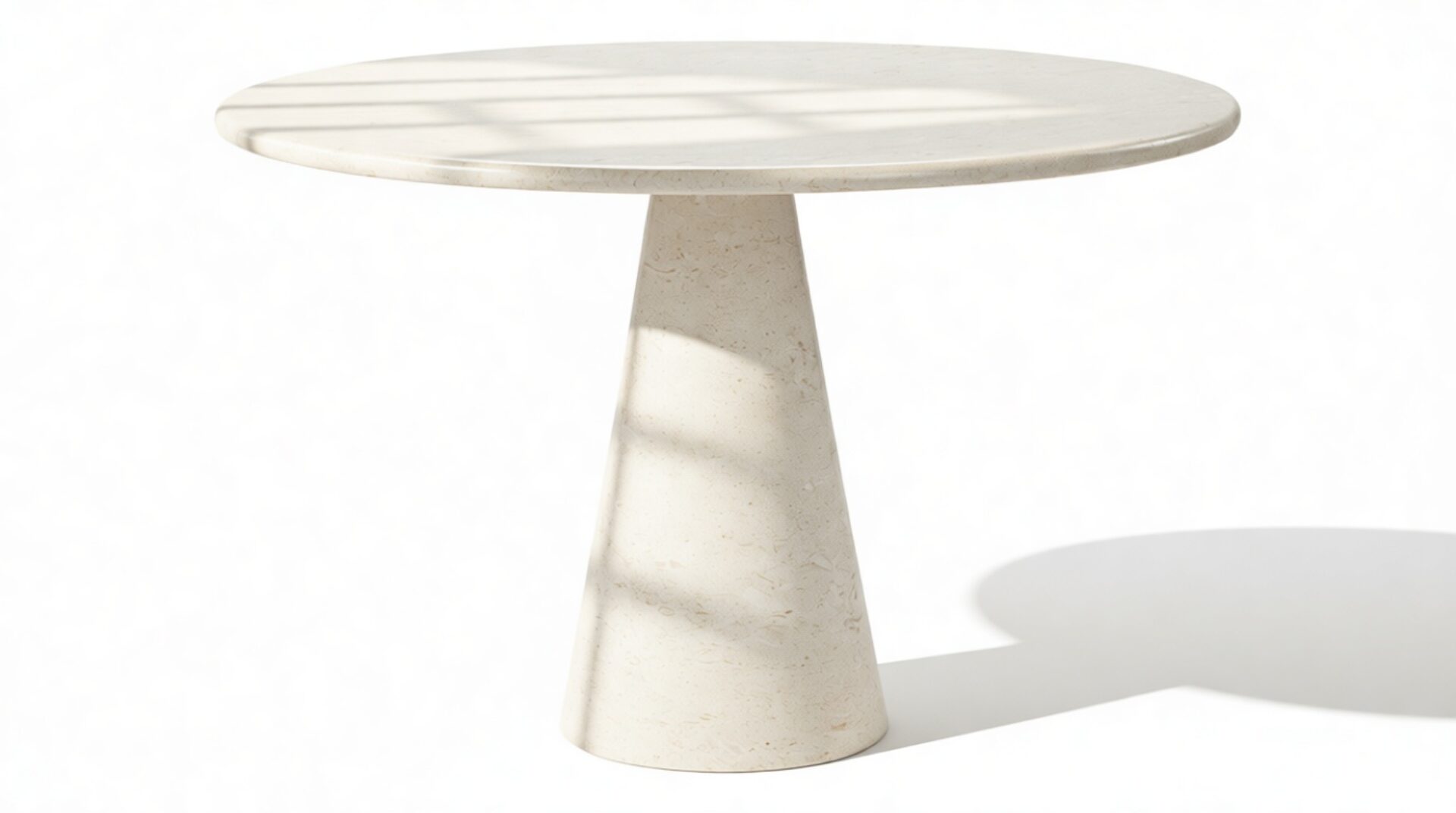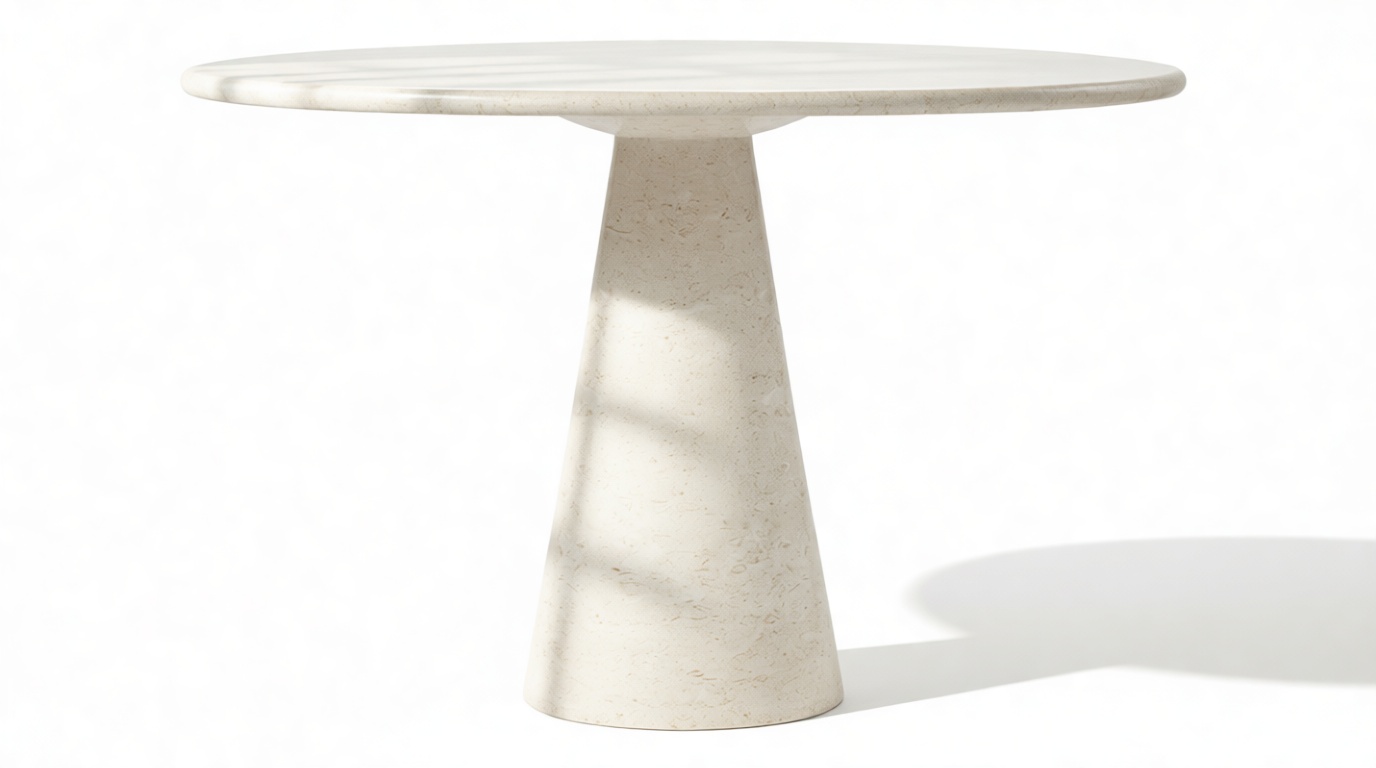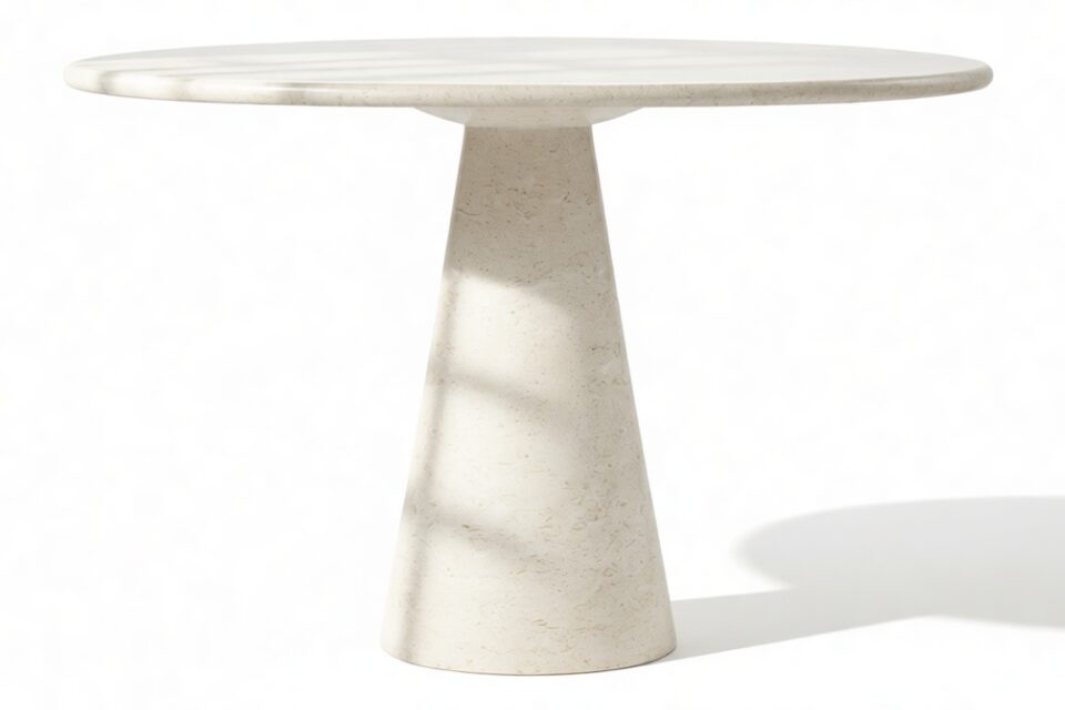 The meticulously crafted conical pedestal base offers stability and artistic allure with its precise construction. Its sleek lines and tapered design elegantly match the circular tabletop, creating a harmonious visual balance that embodies modern sophistication.