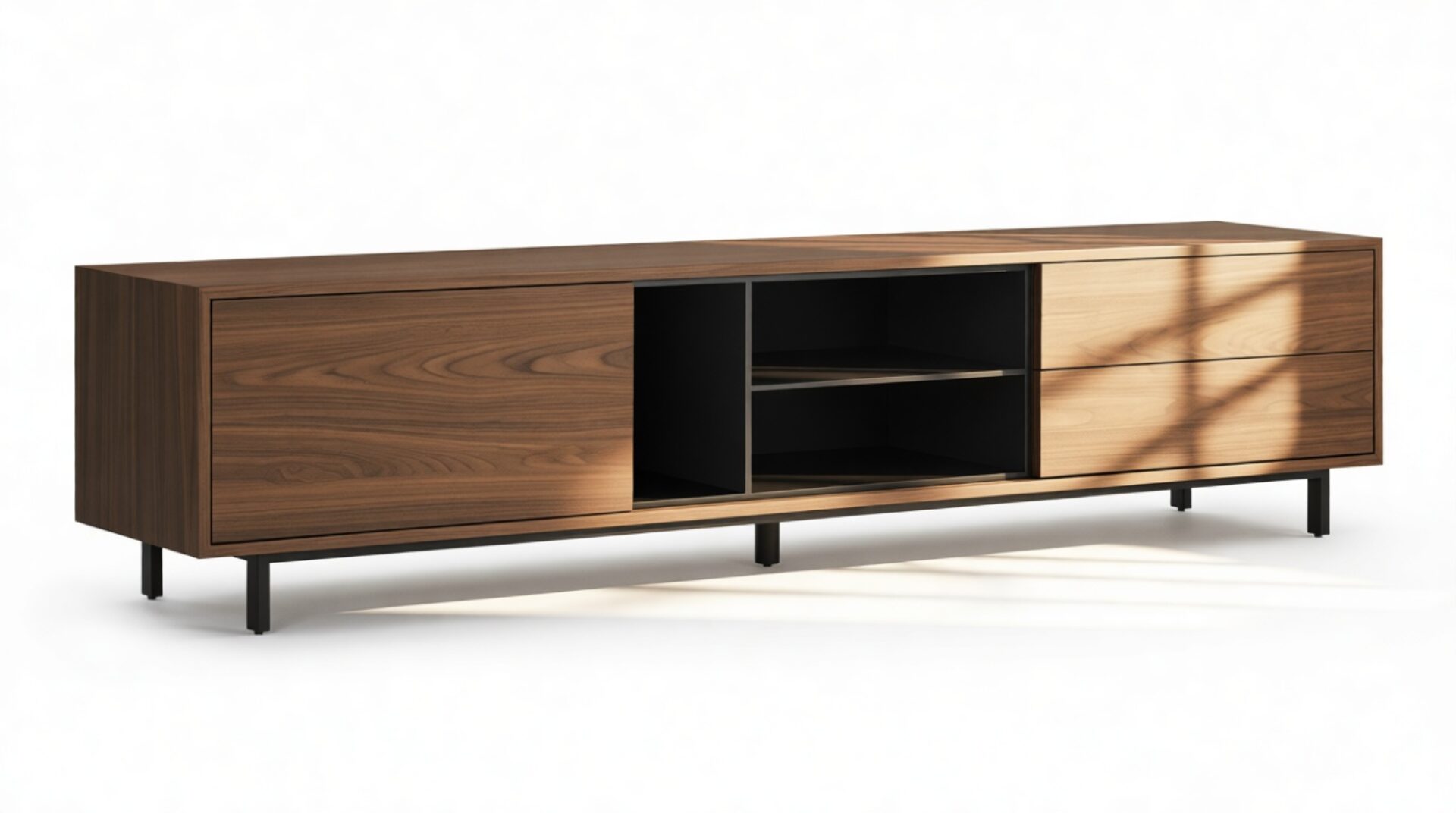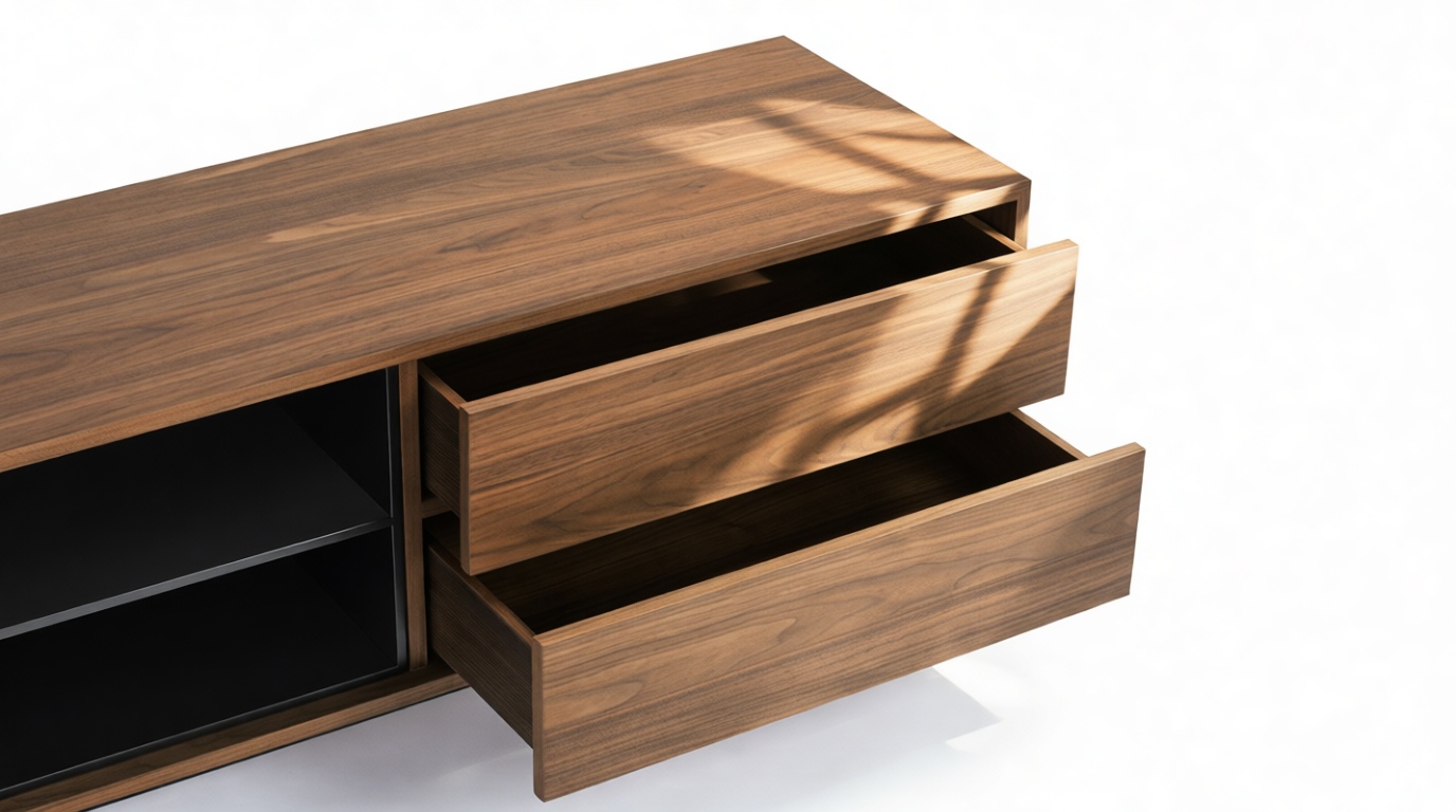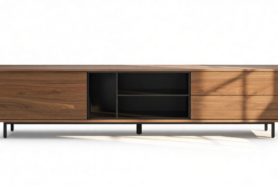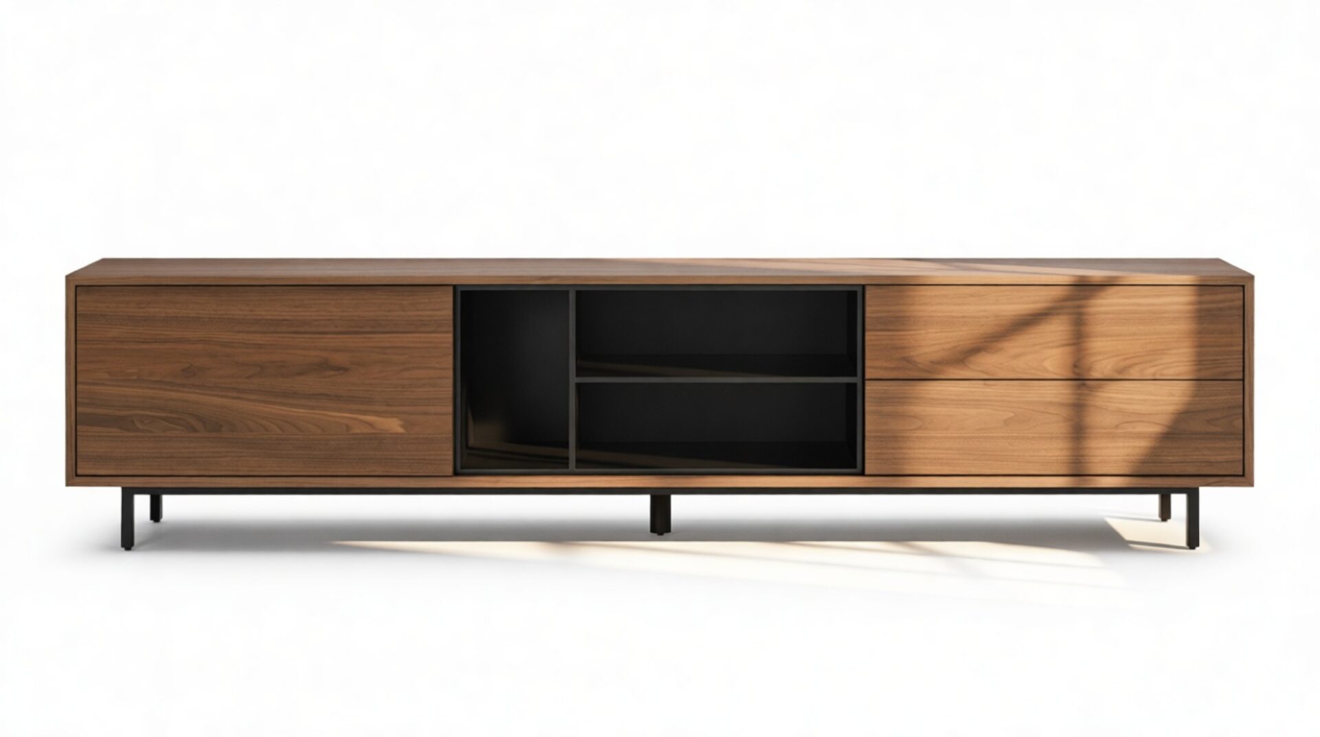 Elevate your space with the Heian Media Console's modern style and functional design. The rich walnut finish exudes warmth and elegance, while matte black shelves add sophistication to displayed items. With two drawers and a cupboard, this console offers practical storage solutions, blending utility with chic aesthetics. Perfect for minimalist and modern interiors, enjoy sophisticated organization beneath your TV.