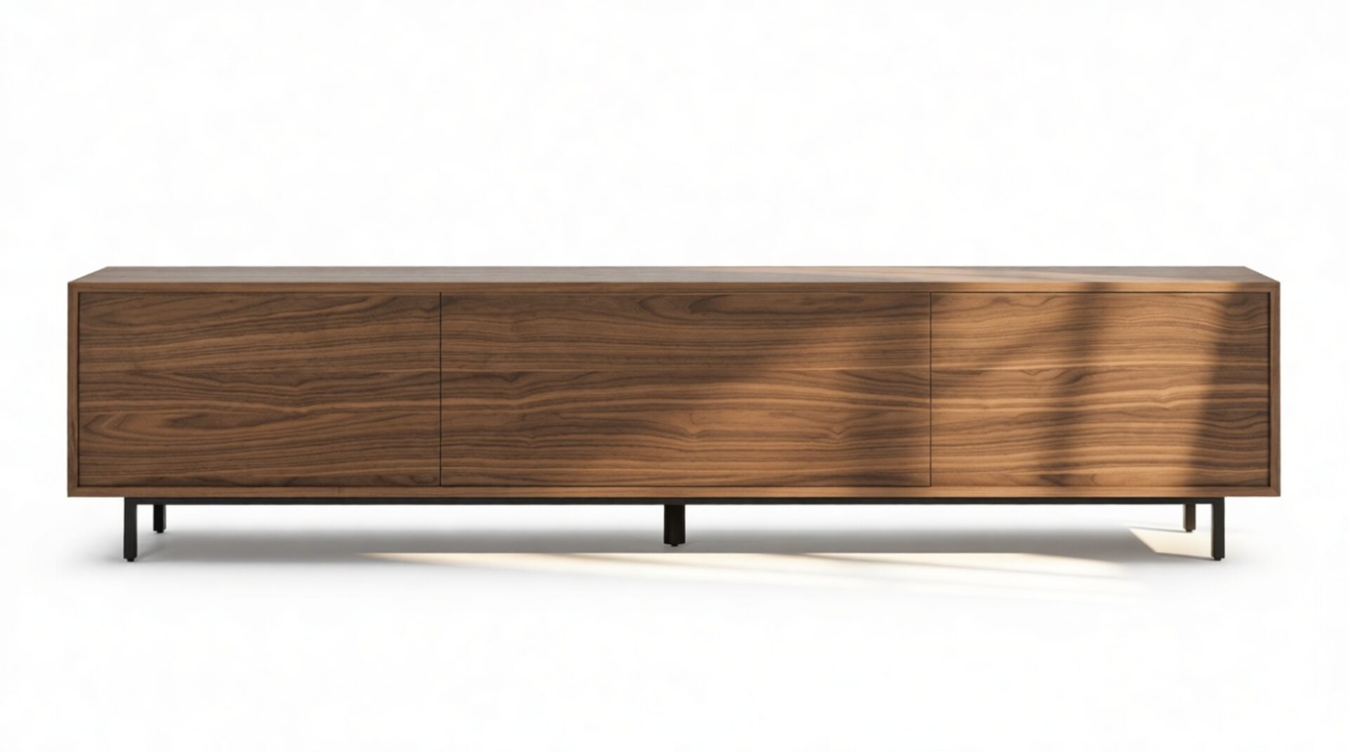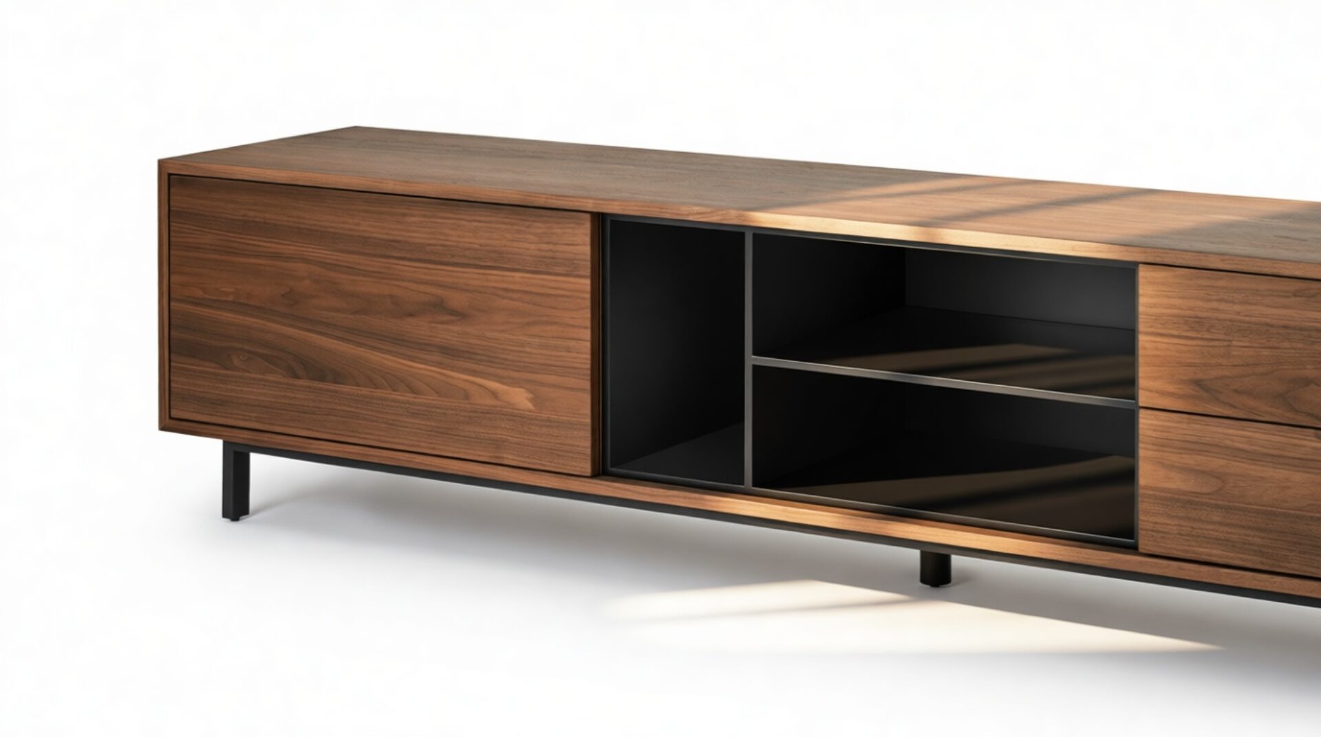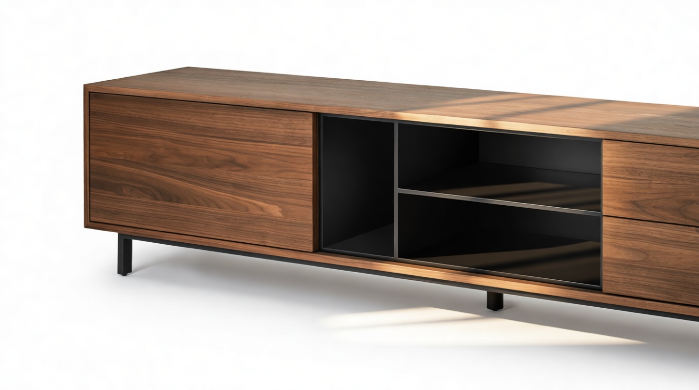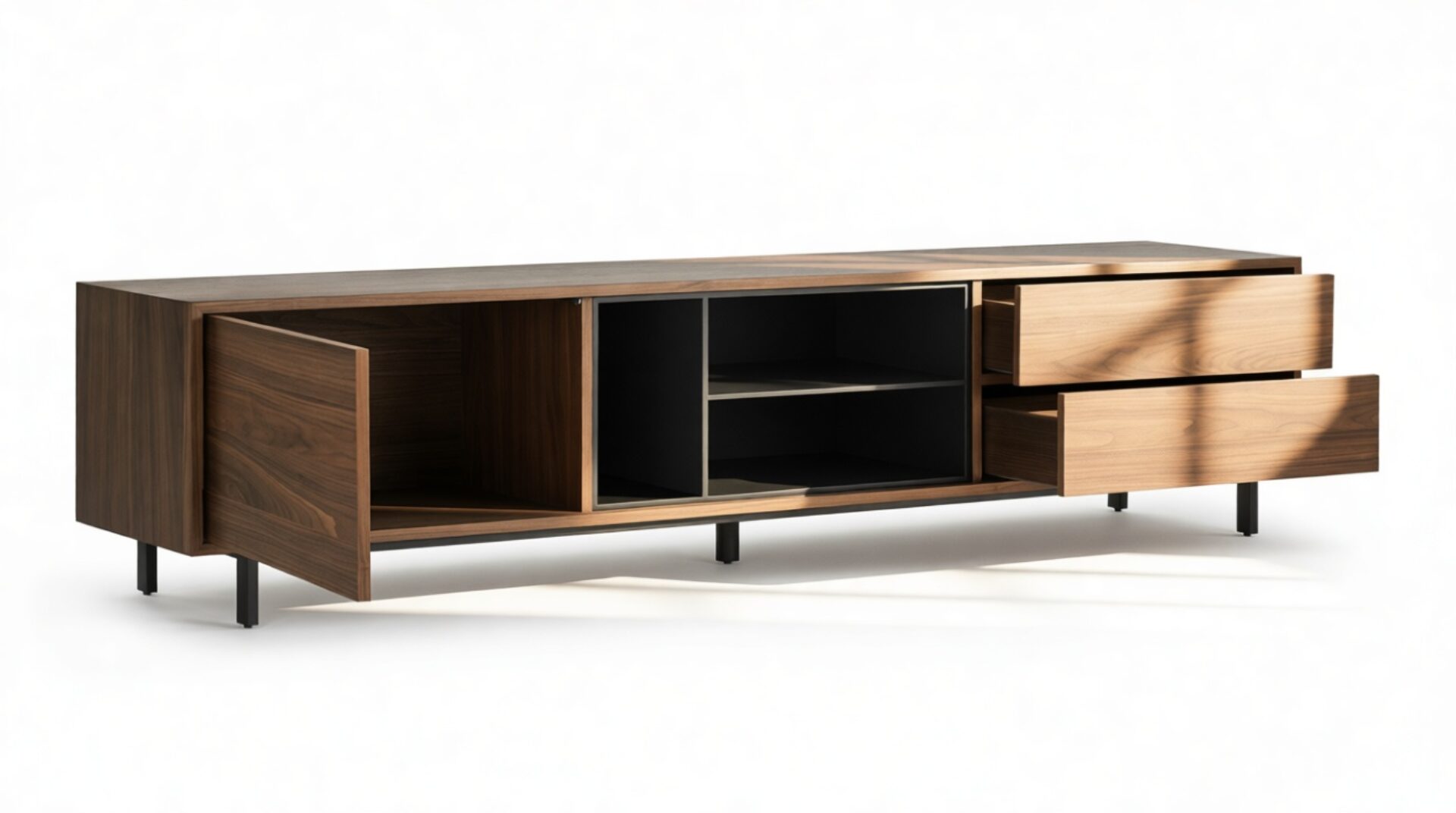 Elevate your space with the Heian Media Console's modern style and functional design. The rich walnut finish exudes warmth and elegance, while matte black shelves add sophistication to displayed items. With two drawers and a cupboard, this console offers practical storage solutions, blending utility with chic aesthetics. Perfect for minimalist and modern interiors, enjoy sophisticated organization beneath your TV.