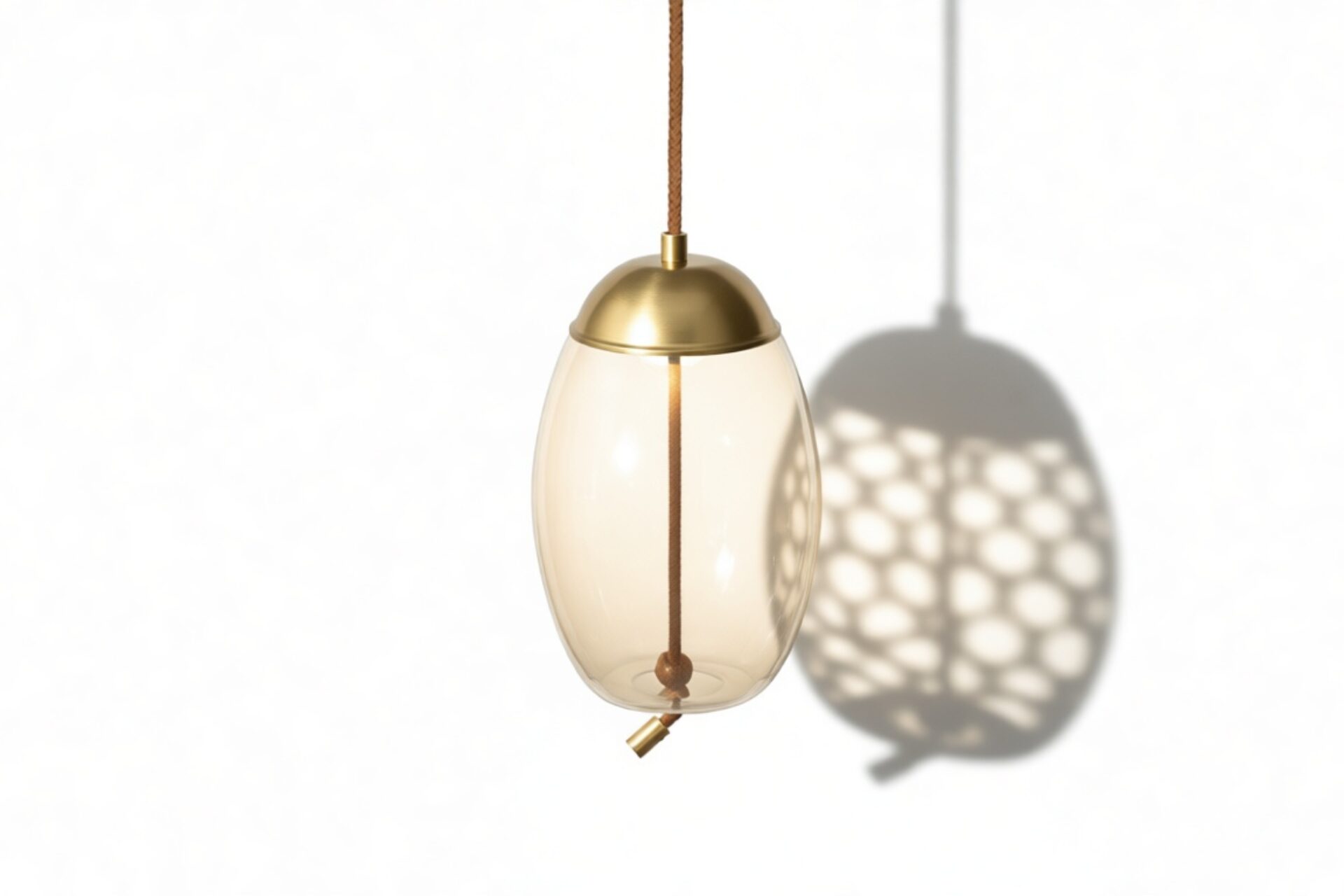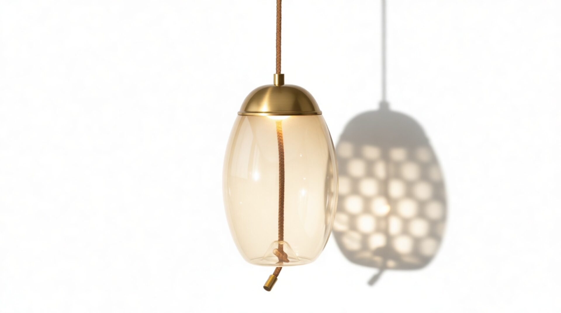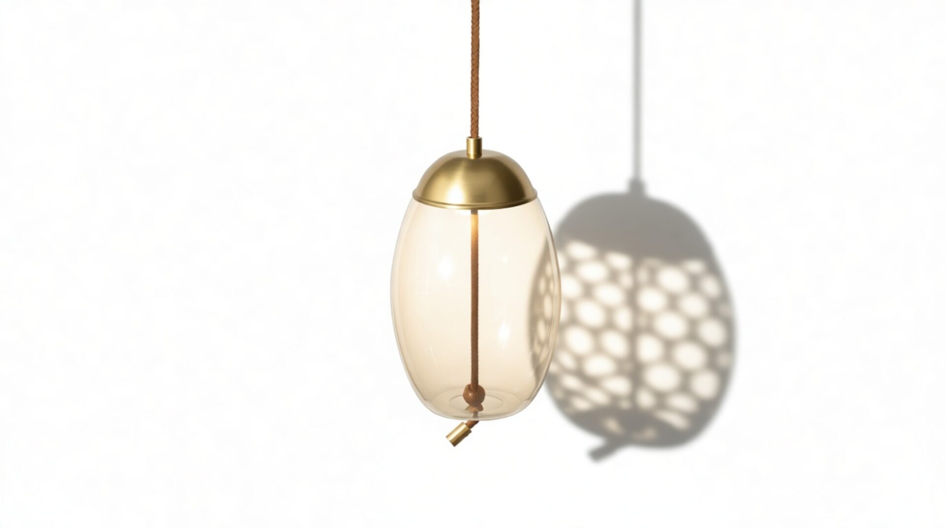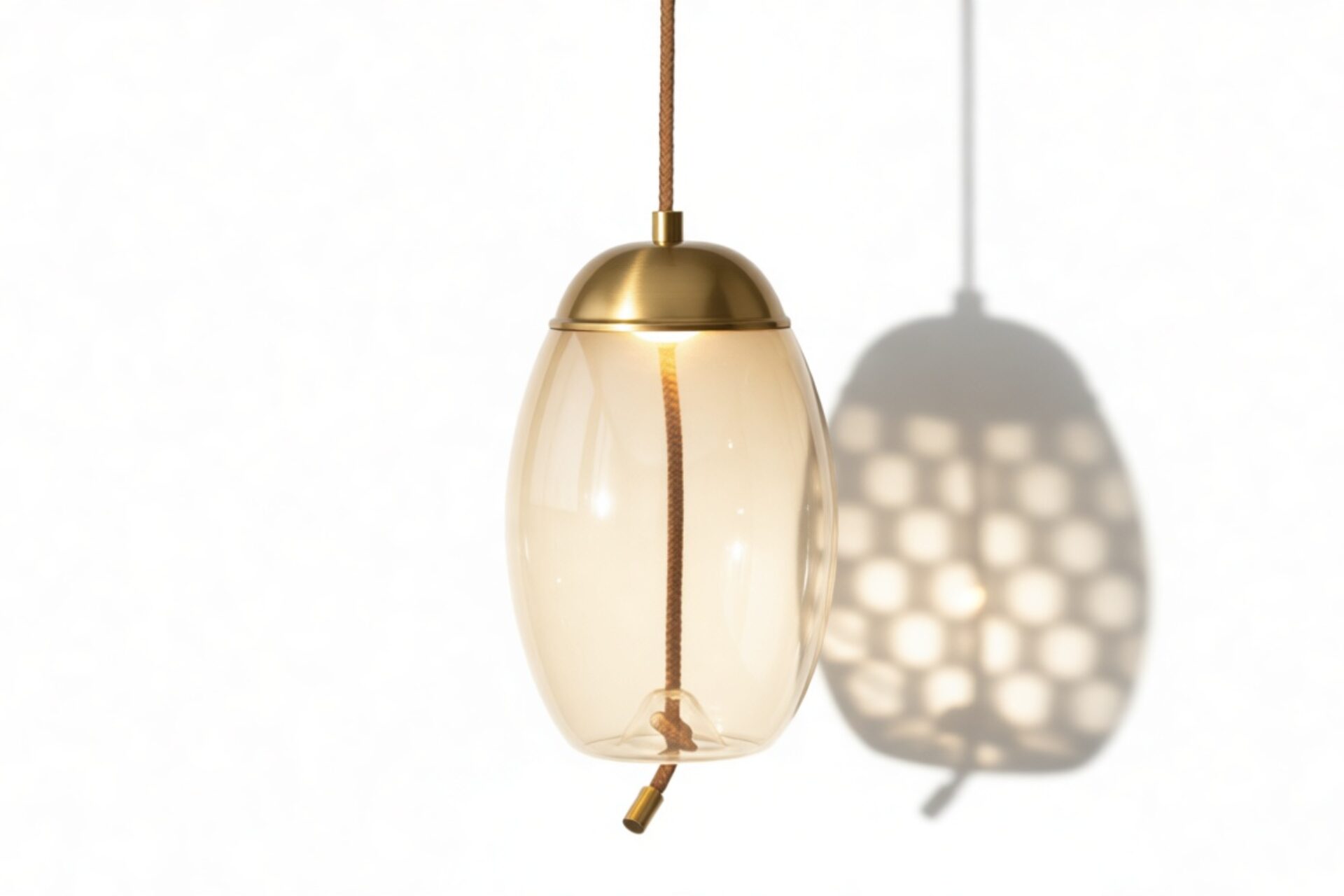 Discover our exquisite pendant, meticulously assembled with premium materials like the gentle amber-colored glass, resilient iron fittings with a brass finish, and distinctive rope detailing for enhanced texture.