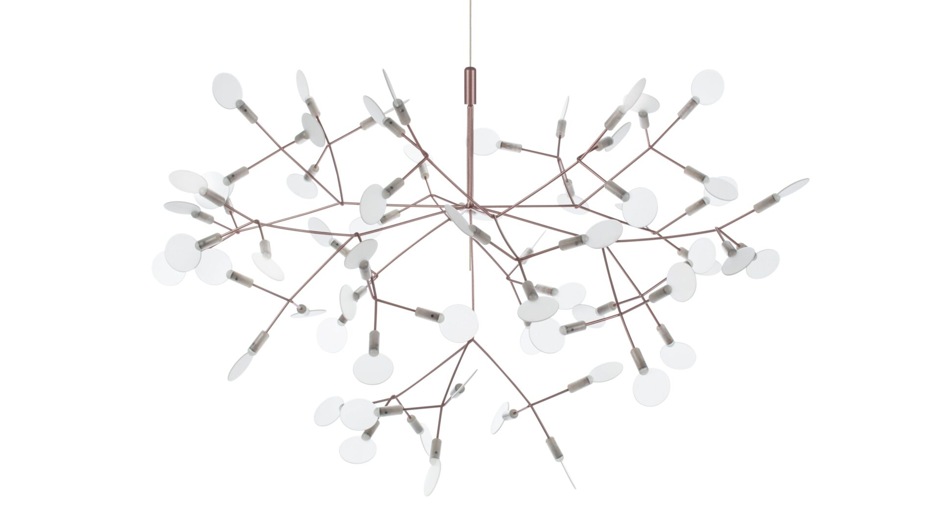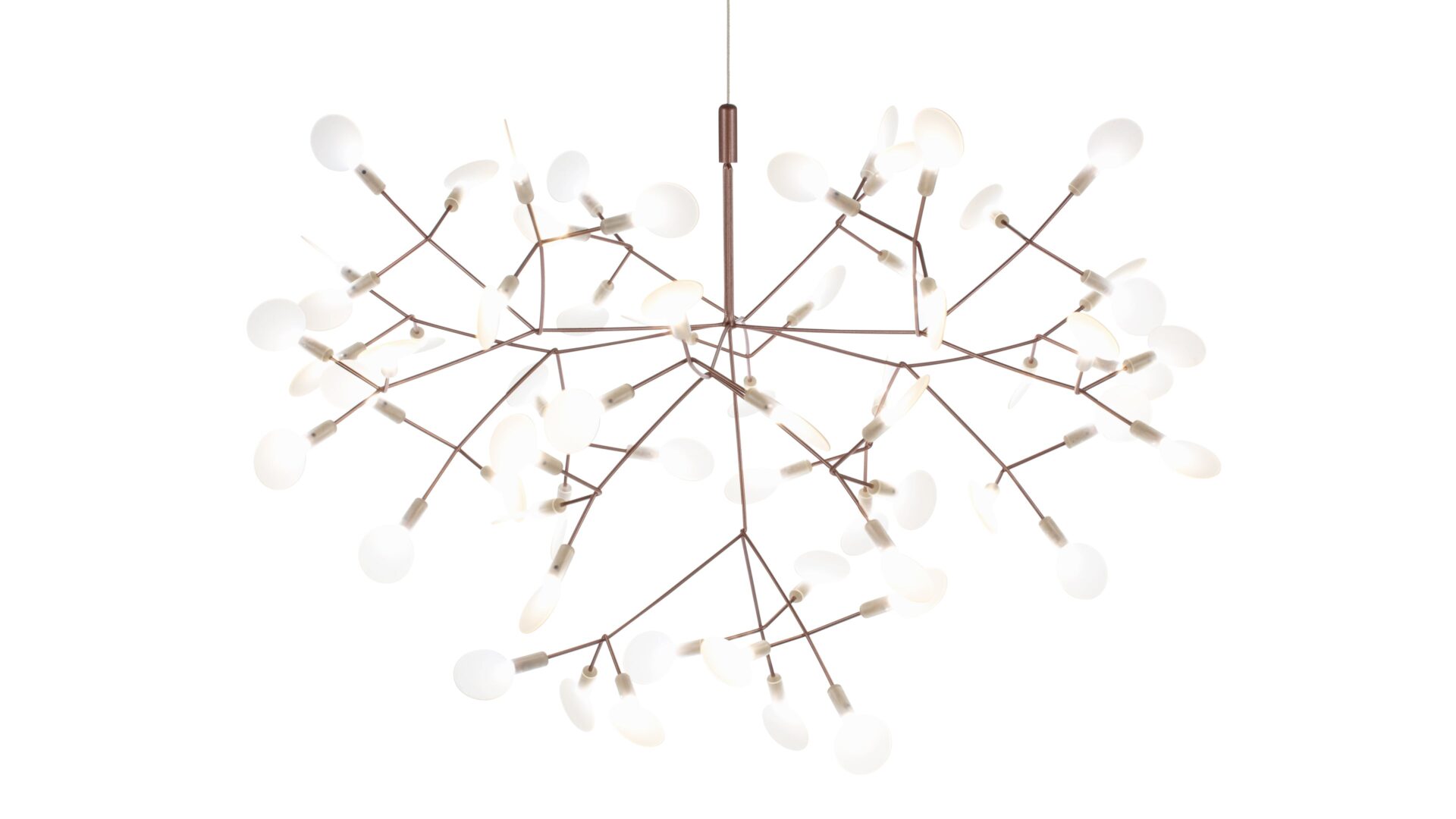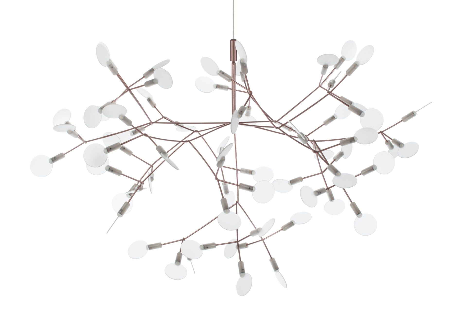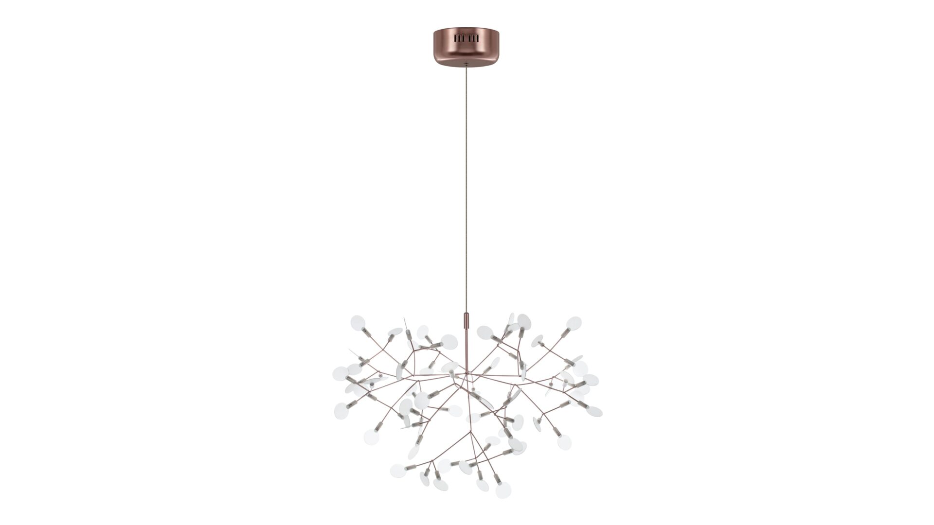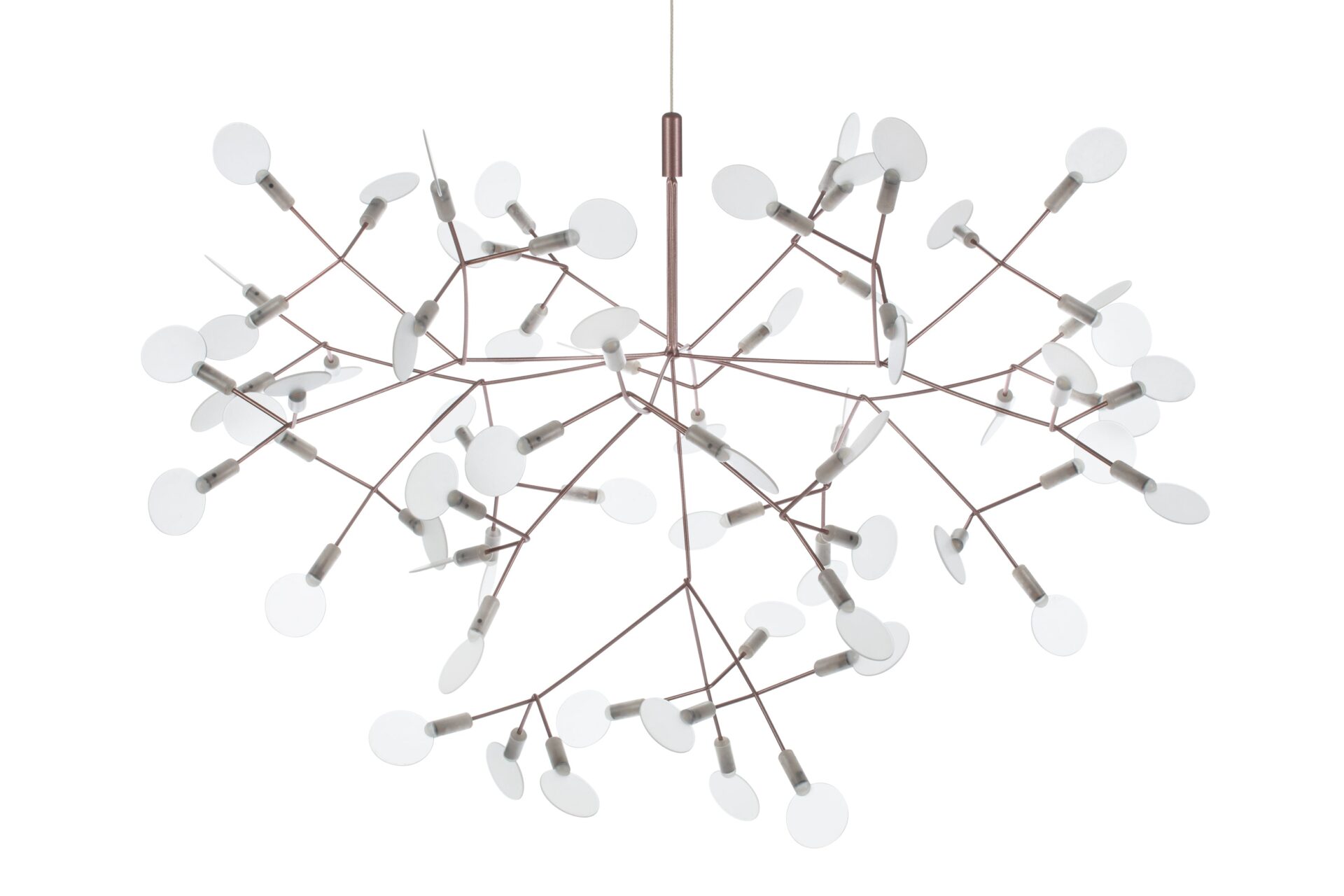 The Heracleum III Chandelier is a remarkable contemporary lighting fixture that draws inspiration from the organic beauty of nature. Its intricate design, evoking the delicate branches or dandelion seed heads, is skillfully crafted from stainless steel with a luxurious copper finish. Attached to slim, outward-reaching rods are small acrylic shades that gently diffuse the warm glow emitted by the integrated LED bulbs. Suspended elegantly by a slender wire or cable, it exudes a floating, sculptural quality that elevates modern interiors.