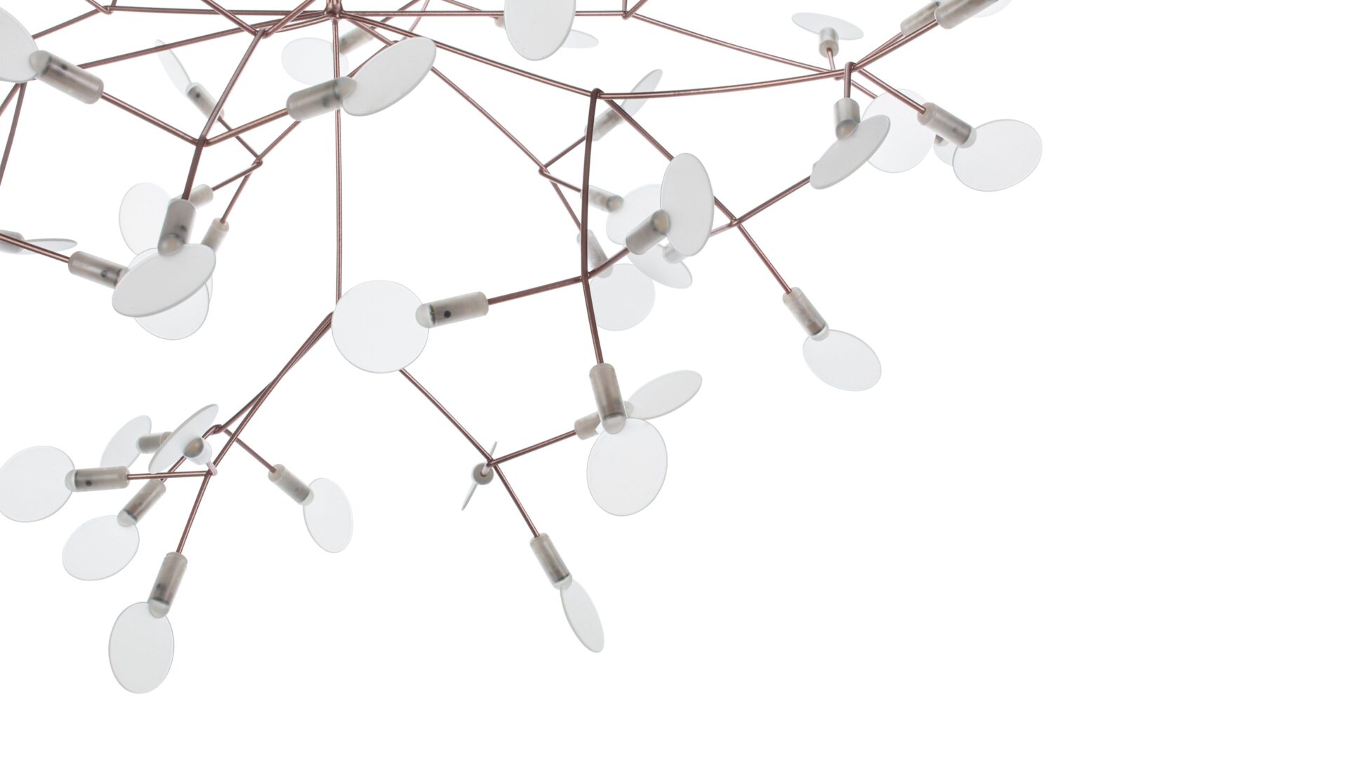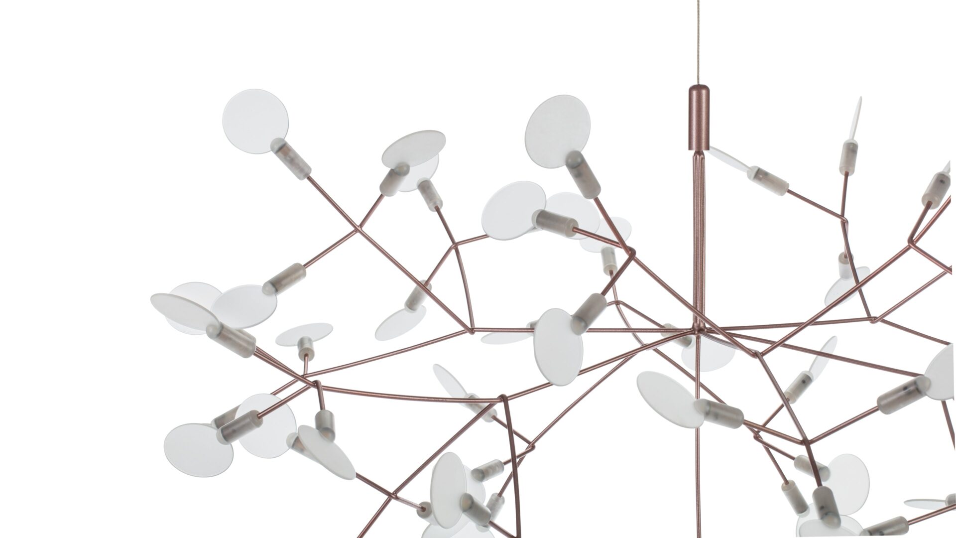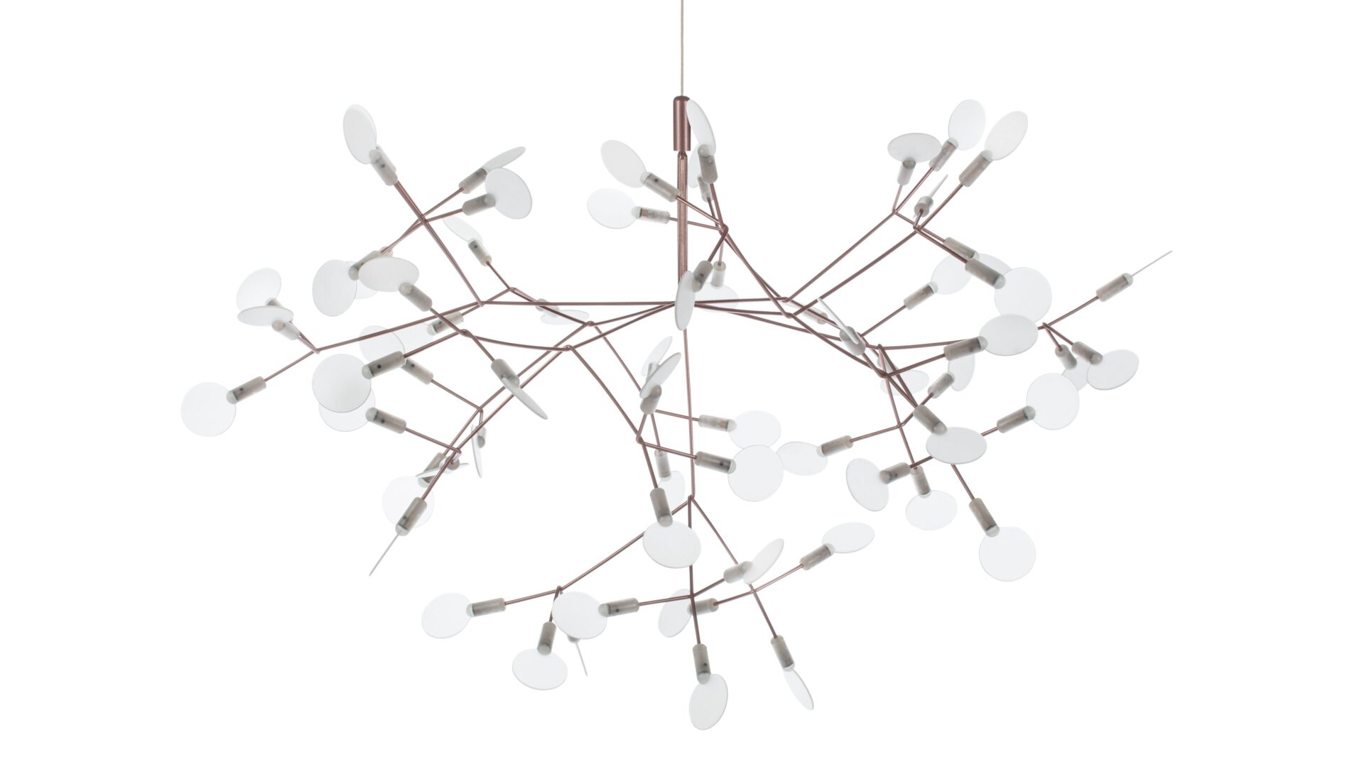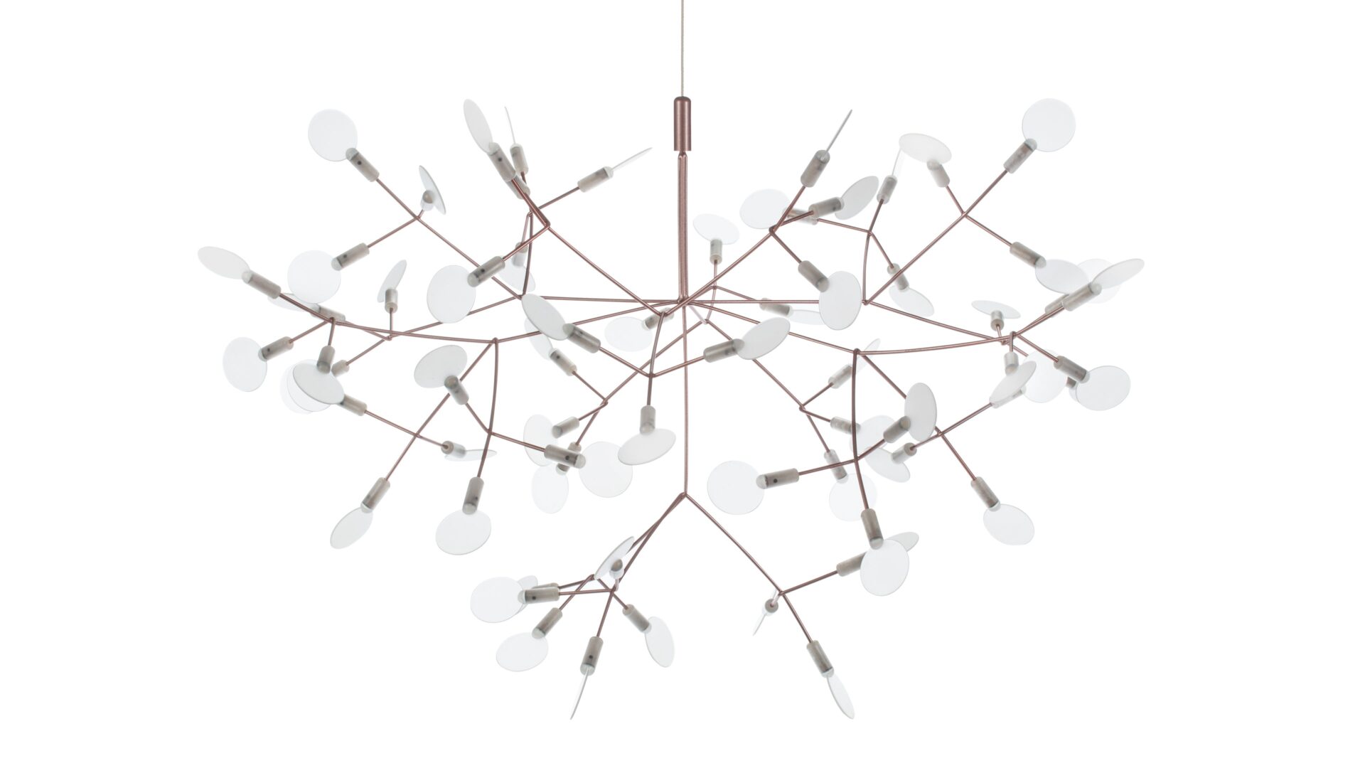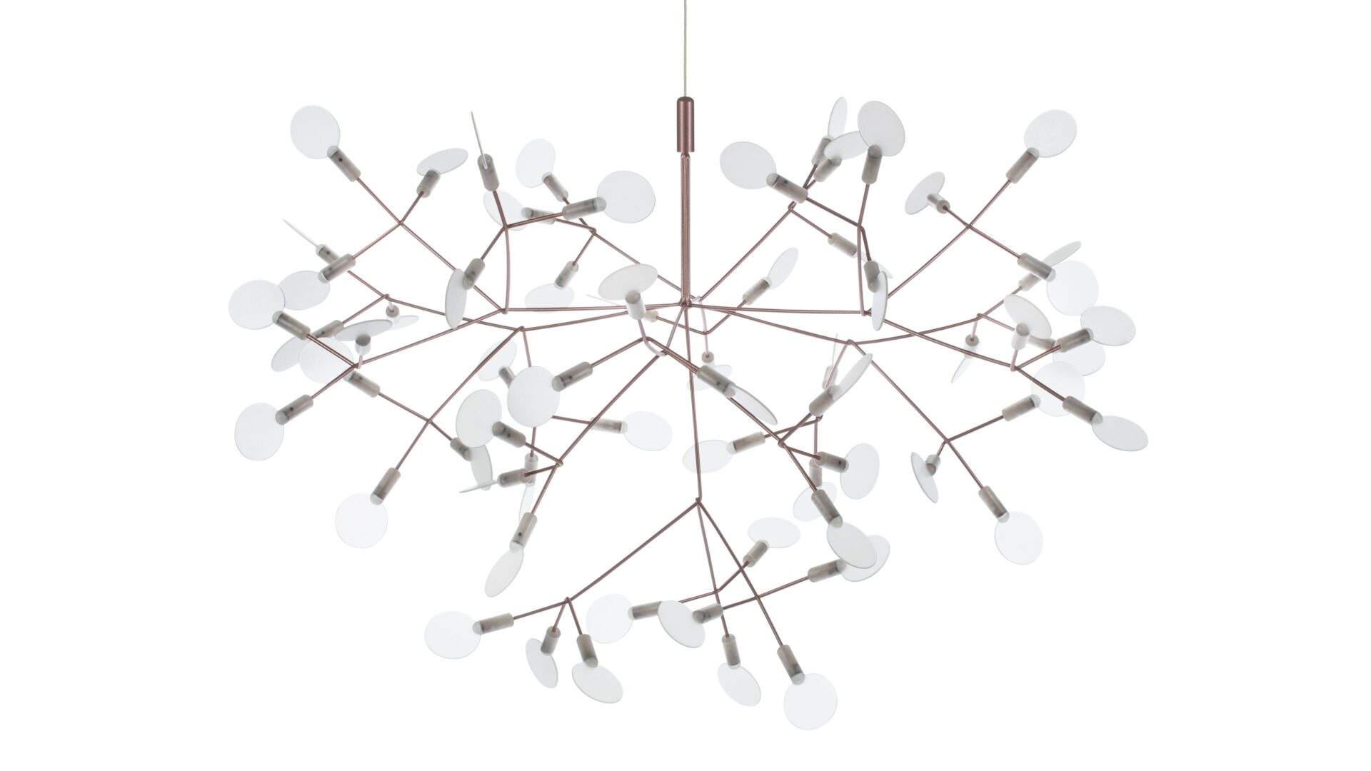 The Heracleum III Chandelier is a remarkable contemporary lighting fixture that draws inspiration from the organic beauty of nature. Its intricate design, evoking the delicate branches or dandelion seed heads, is skillfully crafted from stainless steel with a luxurious copper finish. Attached to slim, outward-reaching rods are small acrylic shades that gently diffuse the warm glow emitted by the integrated LED bulbs. Suspended elegantly by a slender wire or cable, it exudes a floating, sculptural quality that elevates modern interiors.
