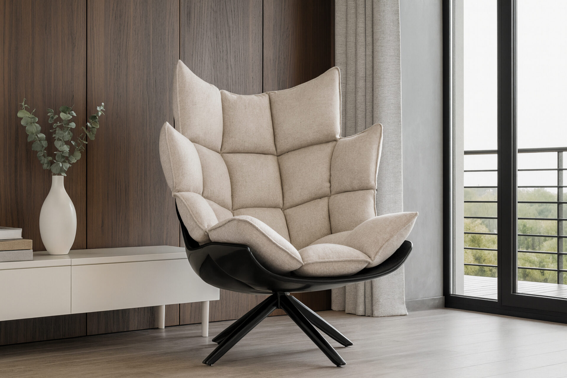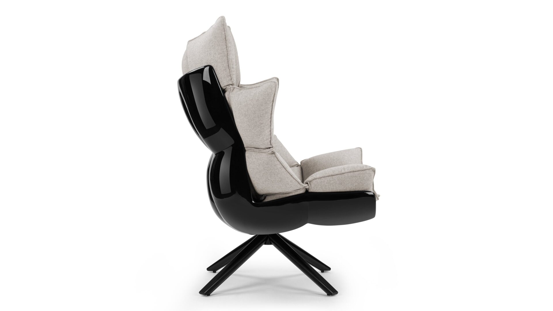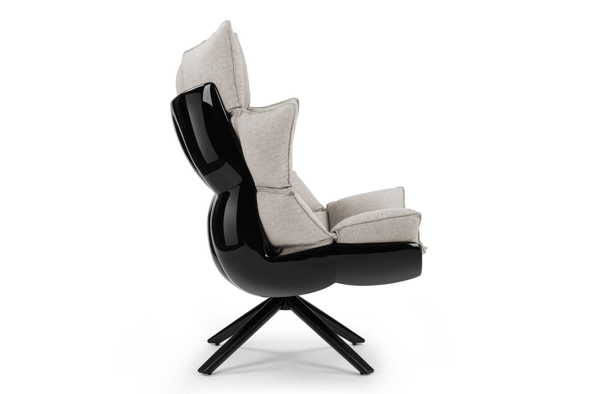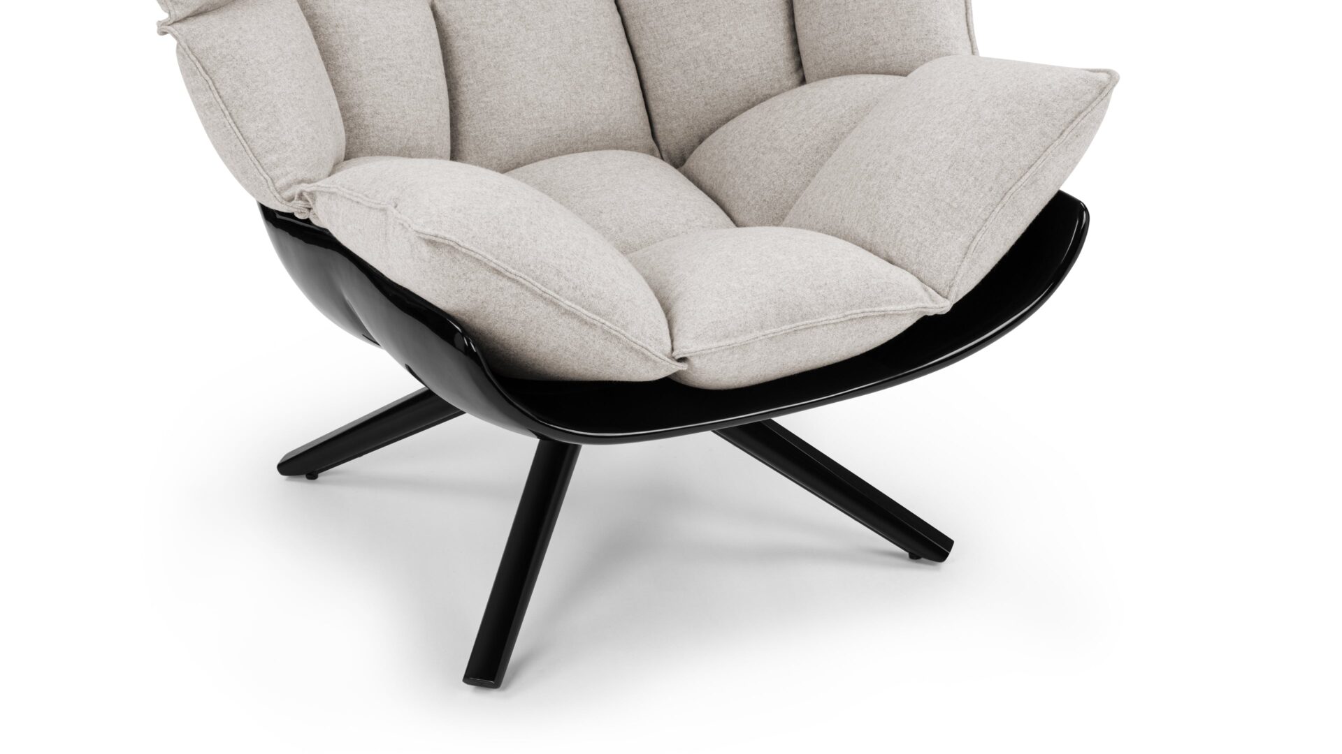 Experience the sophisticated charm of the Husk Lounge Chair, showcasing a contemporary design with its striking splayed legs and softly rounded edges. The cozy cocooning shape and inviting warm grey tones make it the perfect piece for unwinding in style.