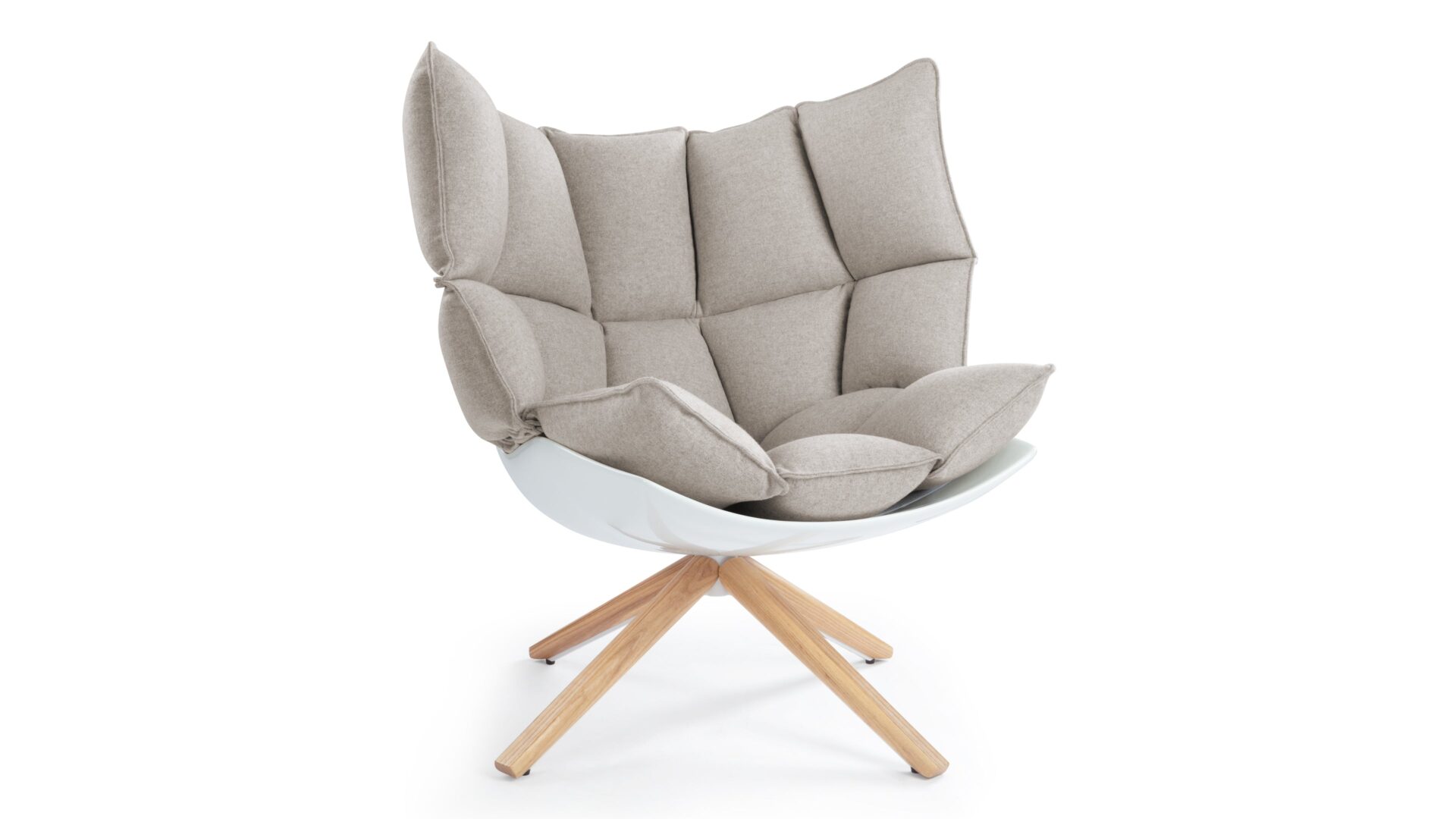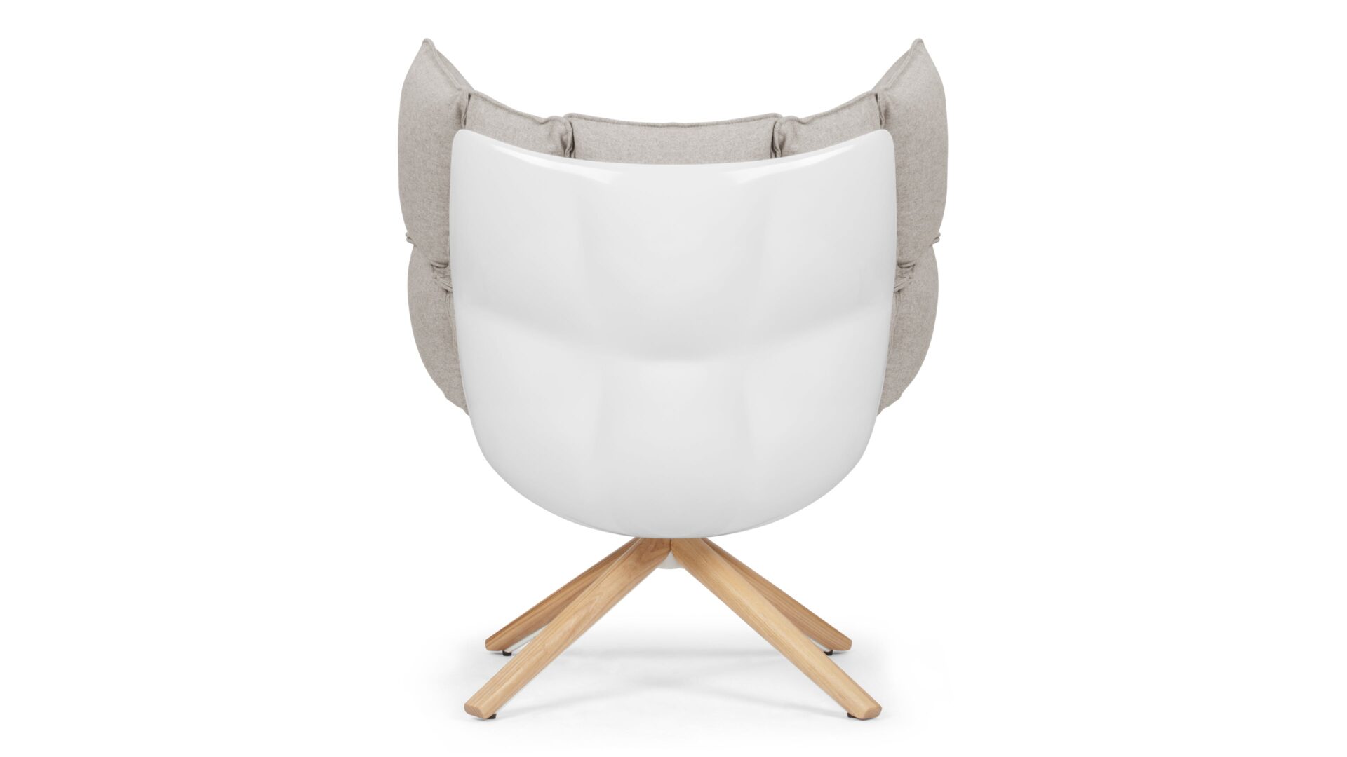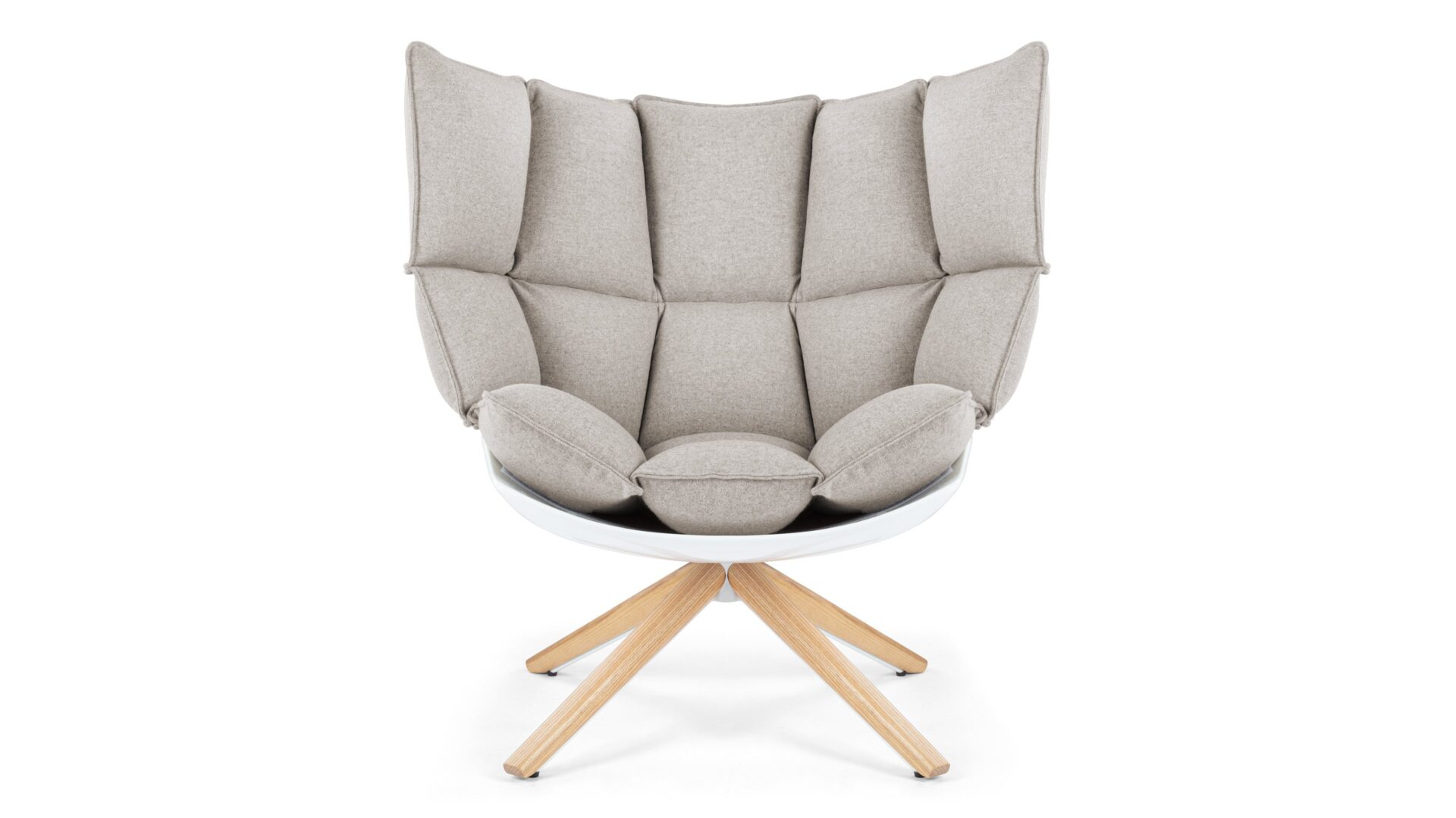 Experience the sophisticated charm of the Husk Lounge Chair, showcasing a contemporary design with its striking splayed legs and softly rounded edges. The cozy cocooning shape and inviting warm grey tones make it the perfect piece for unwinding in style.