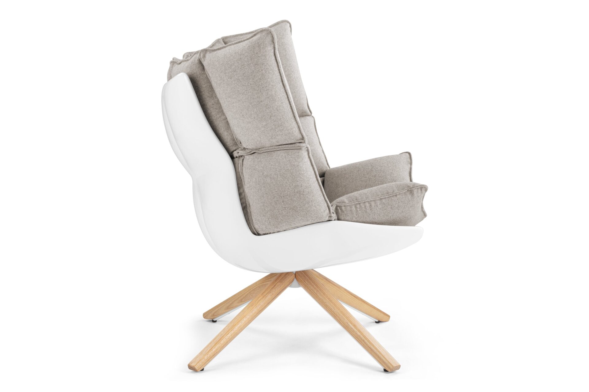 Experience the unique design of the Husk Lounge Chair that blends comfort with modern elegance seamlessly. Its warm, mid-tone grey wool upholstery and padded foam compartments create a cozy cocoon-like sensation, enhanced by precise stitch-work. The chair's ergonomically molded fibreglass shell offers optimal support, while the splayed leg base adds a contemporary touch. Choose between regular or high-back options for adaptable comfort. Its softened edges and stylish design make it a versatile piece perfect for reading, lounging, or unwinding in style.