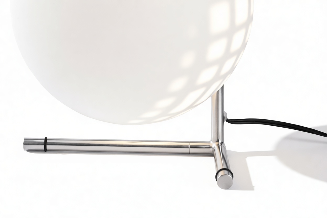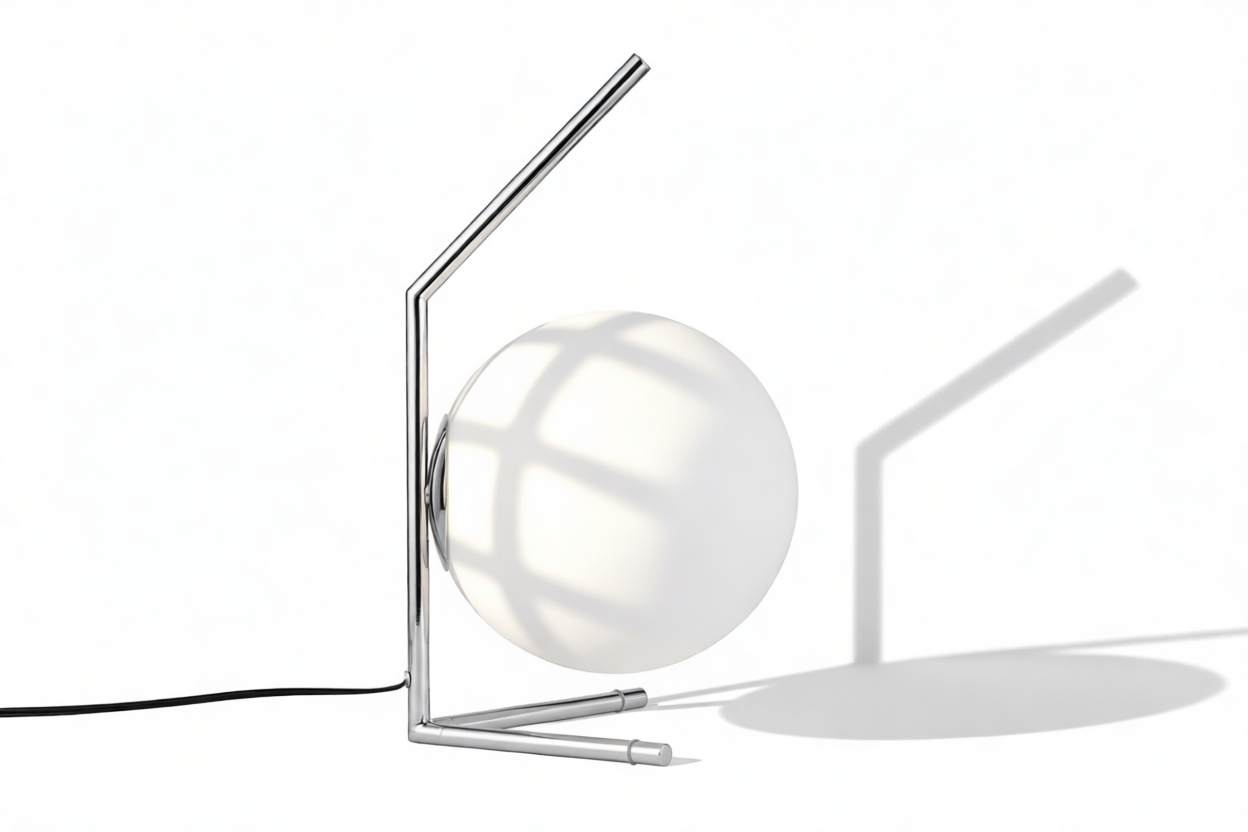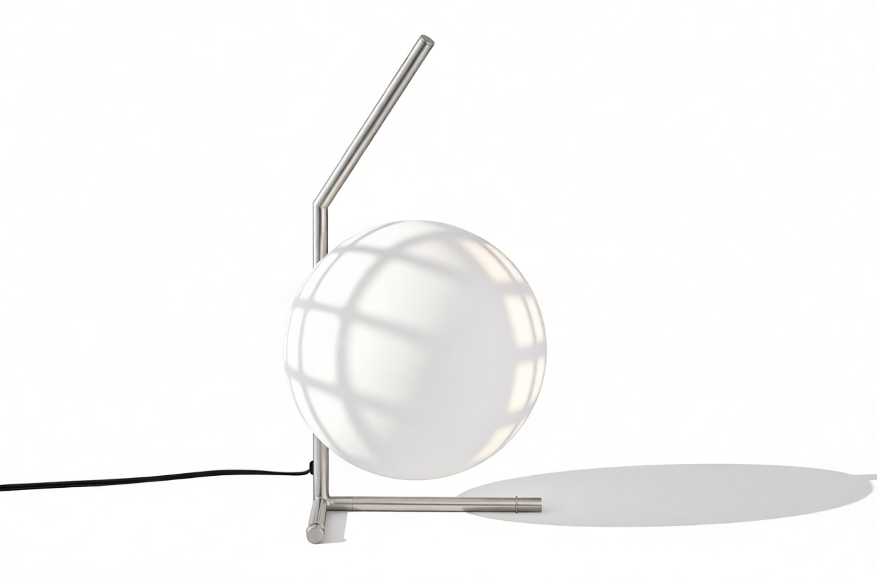 Impeccably constructed with a steel frame and offered in brushed brass, chrome, and black finishes, this modern design is complemented by a striking blown-glass opal diffuser, elegantly poised at the tip of the slim stem. The IC Table Lamp is expertly engineered to provide gentle illumination, producing an ambient lighting effect that is chic and inviting.