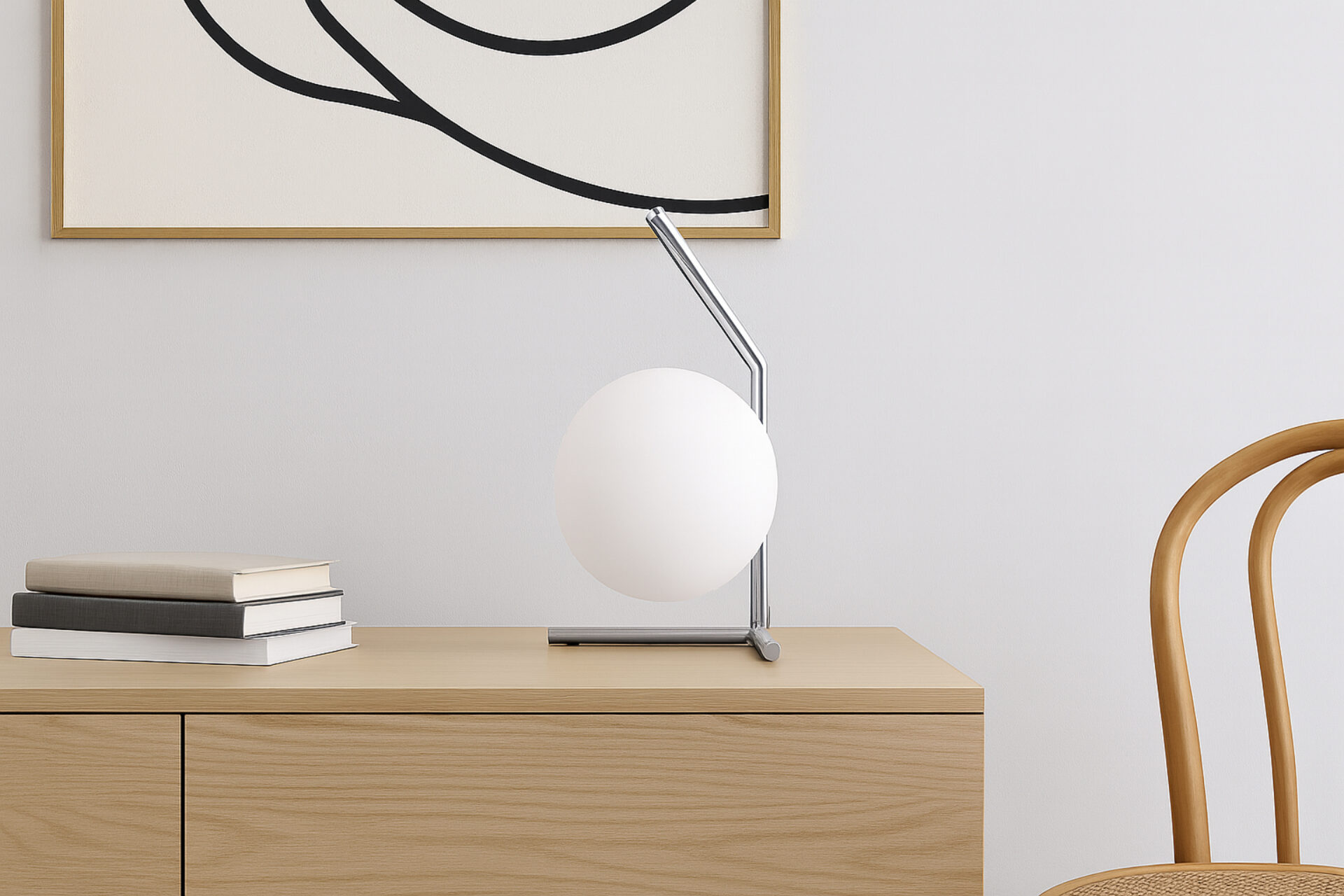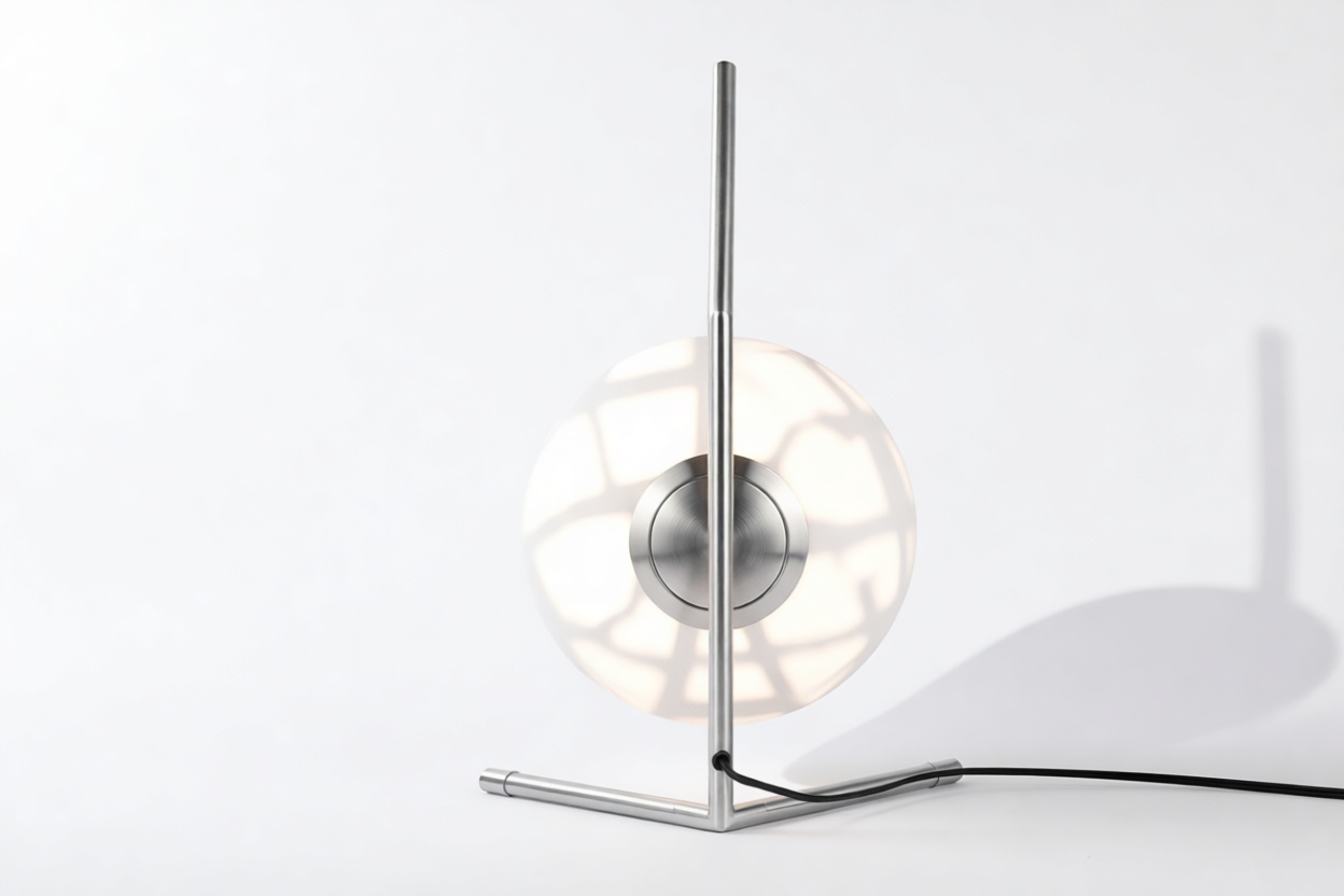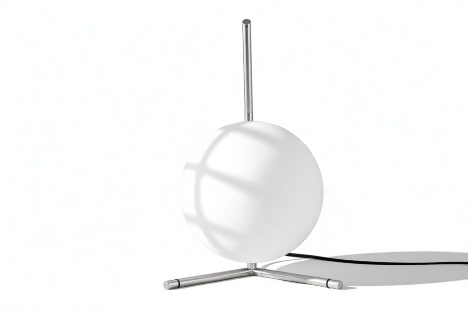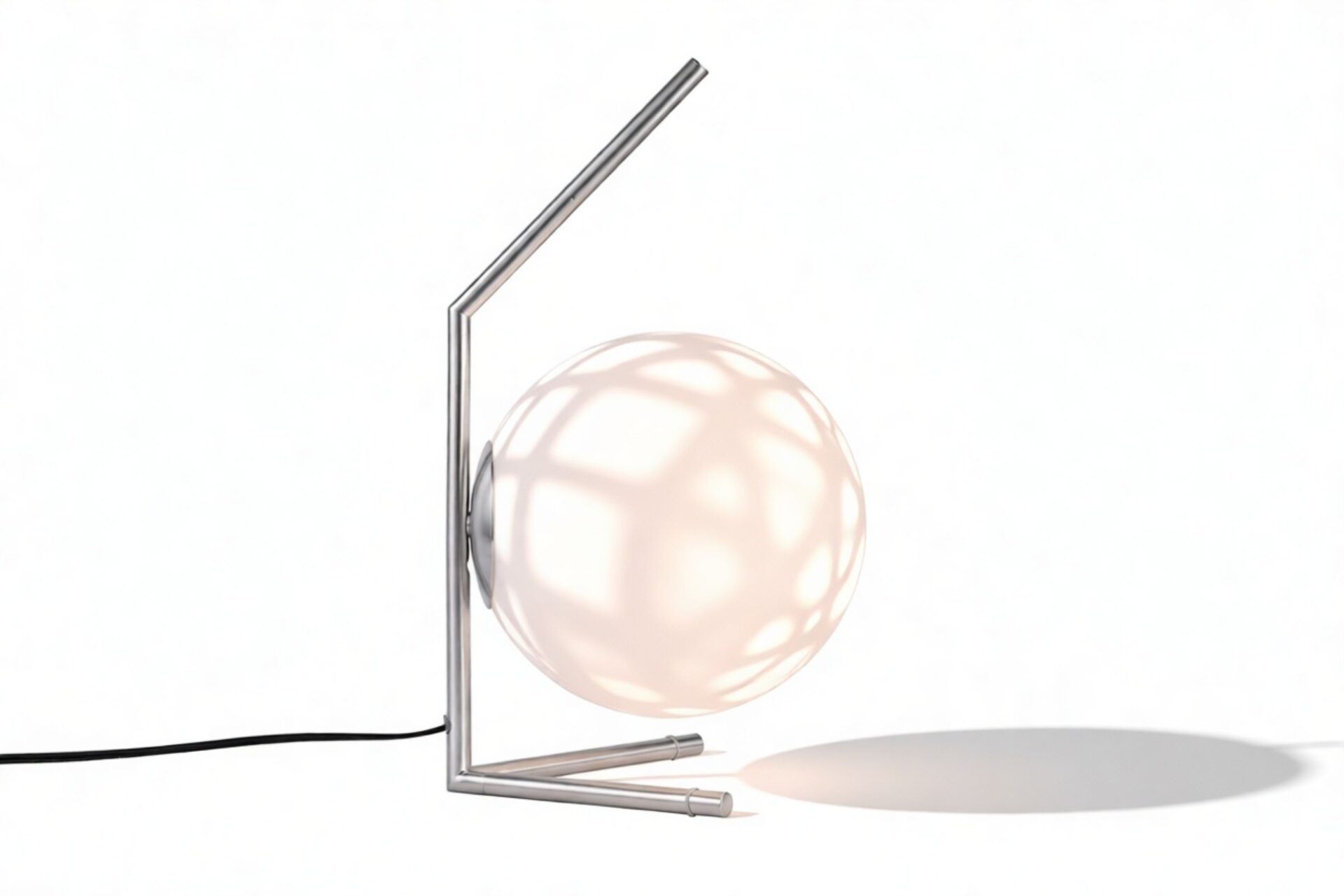 Impeccably constructed with a steel frame and offered in brushed brass, chrome, and black finishes, this modern design is complemented by a striking blown-glass opal diffuser, elegantly poised at the tip of the slim stem. The IC Table Lamp is expertly engineered to provide gentle illumination, producing an ambient lighting effect that is chic and inviting.