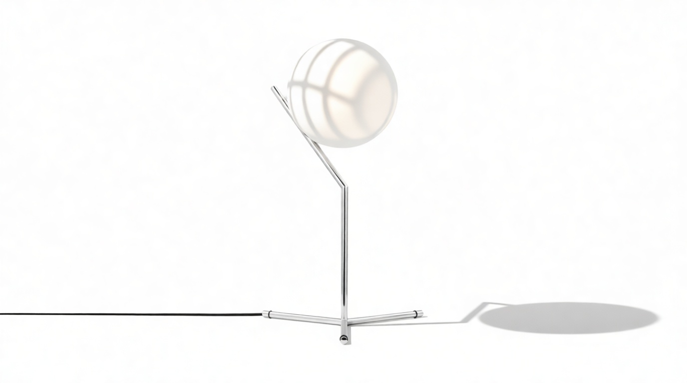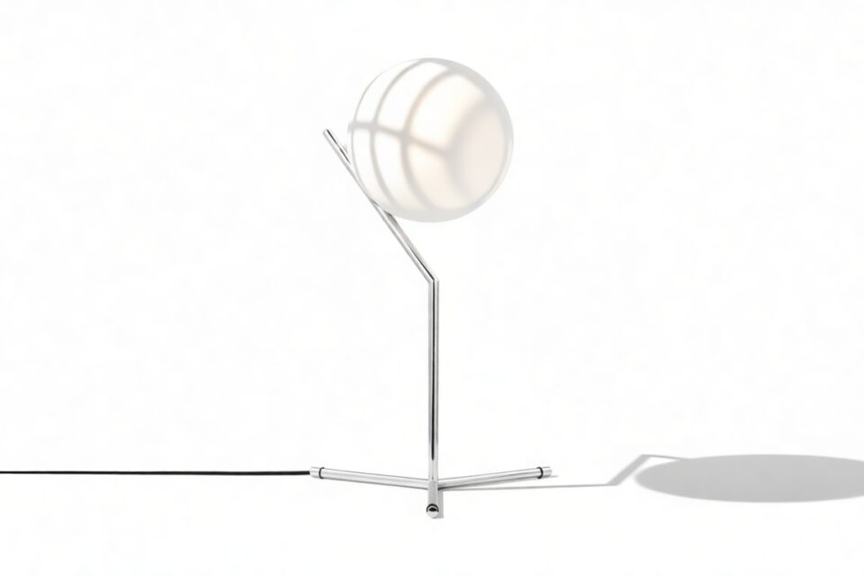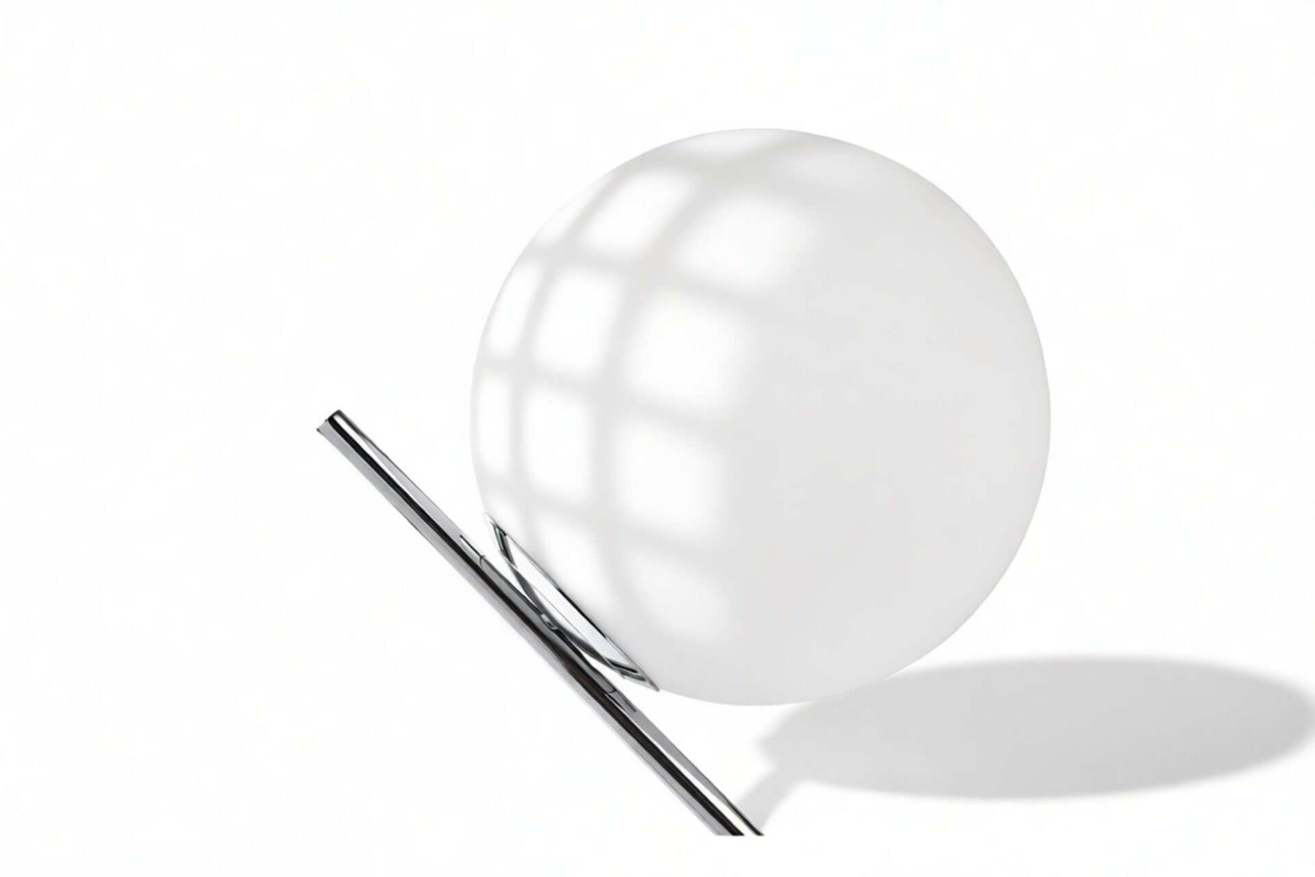 Meticulously constructed with a steel frame and offered in brushed brass, chrome, and black finishes, this modern design features a striking blown-glass opal diffuser, elegantly perched on the end of the slim stem. The IC Table Lamp is meticulously created to emit a gentle illumination, providing an ambient lighting option that is fashionable and atmospheric.