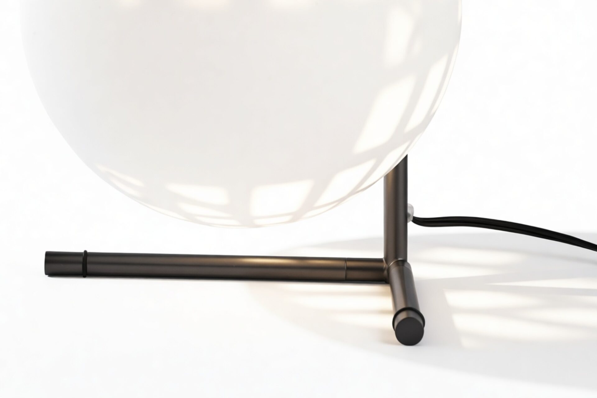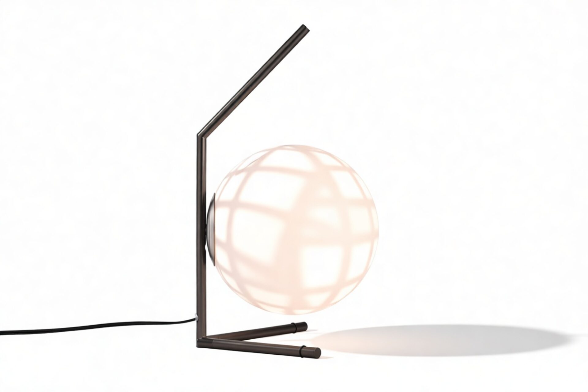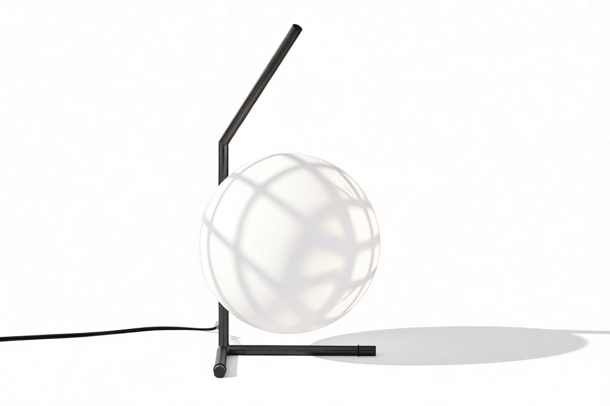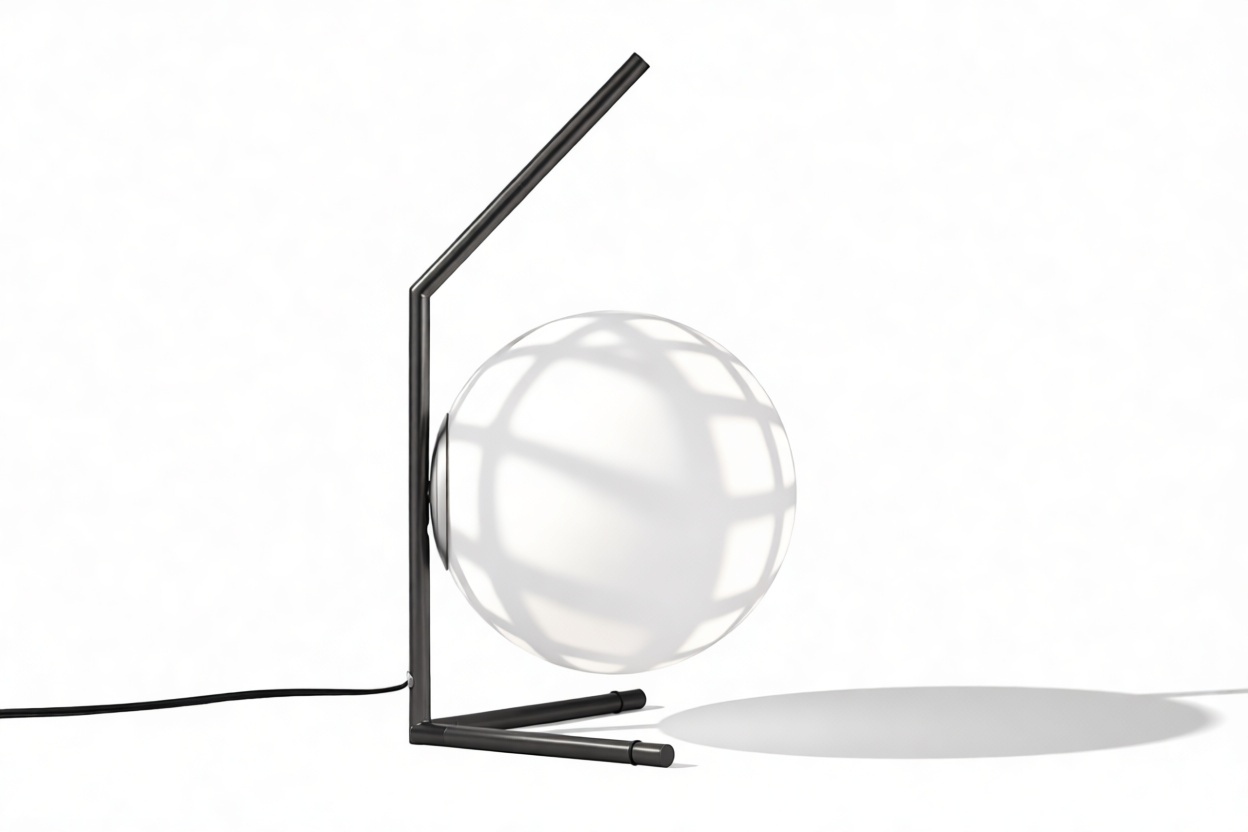 Meticulously constructed with a steel frame and offered in brushed brass, chrome, and black finishes, this modern design features a striking blown-glass opal diffuser, elegantly perched on the end of the slim stem. The IC Table Lamp is meticulously created to emit a gentle illumination, providing an ambient lighting option that is fashionable and atmospheric.