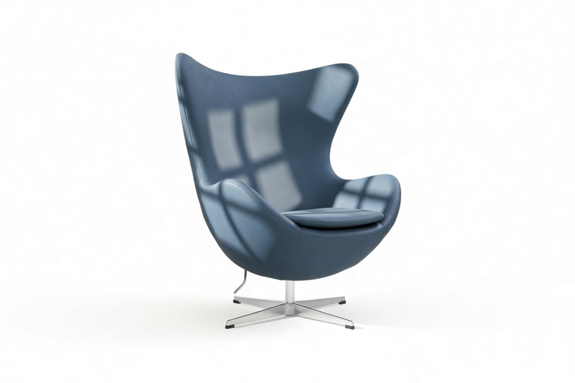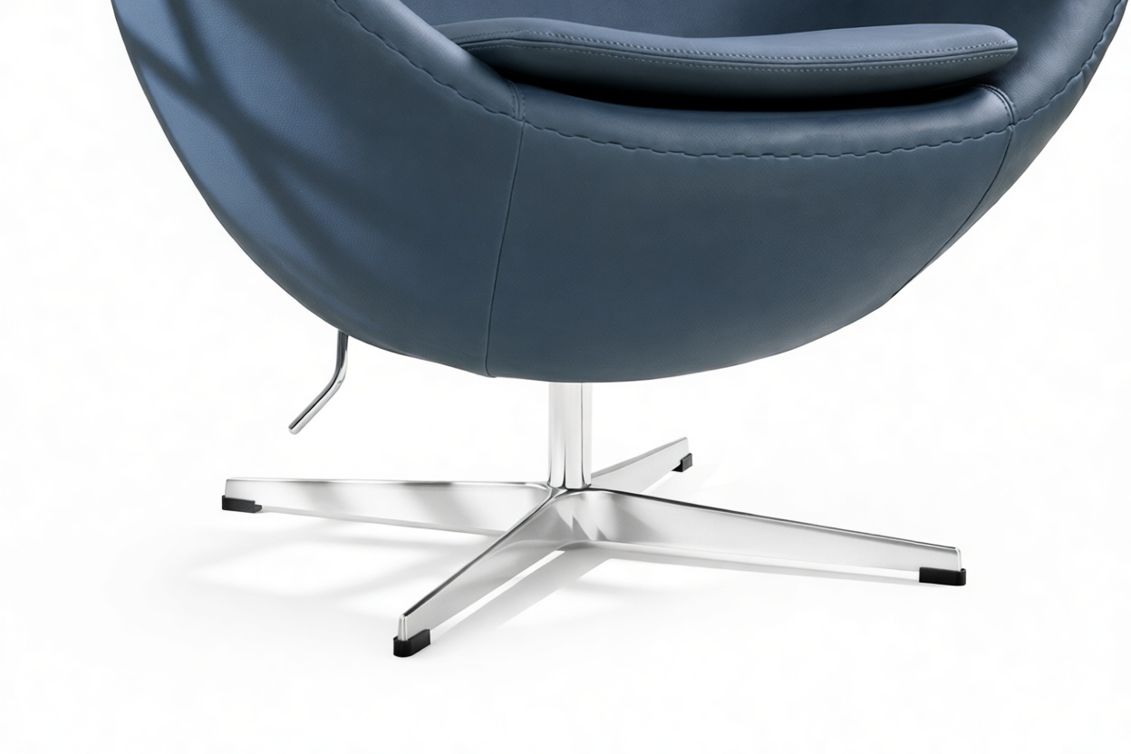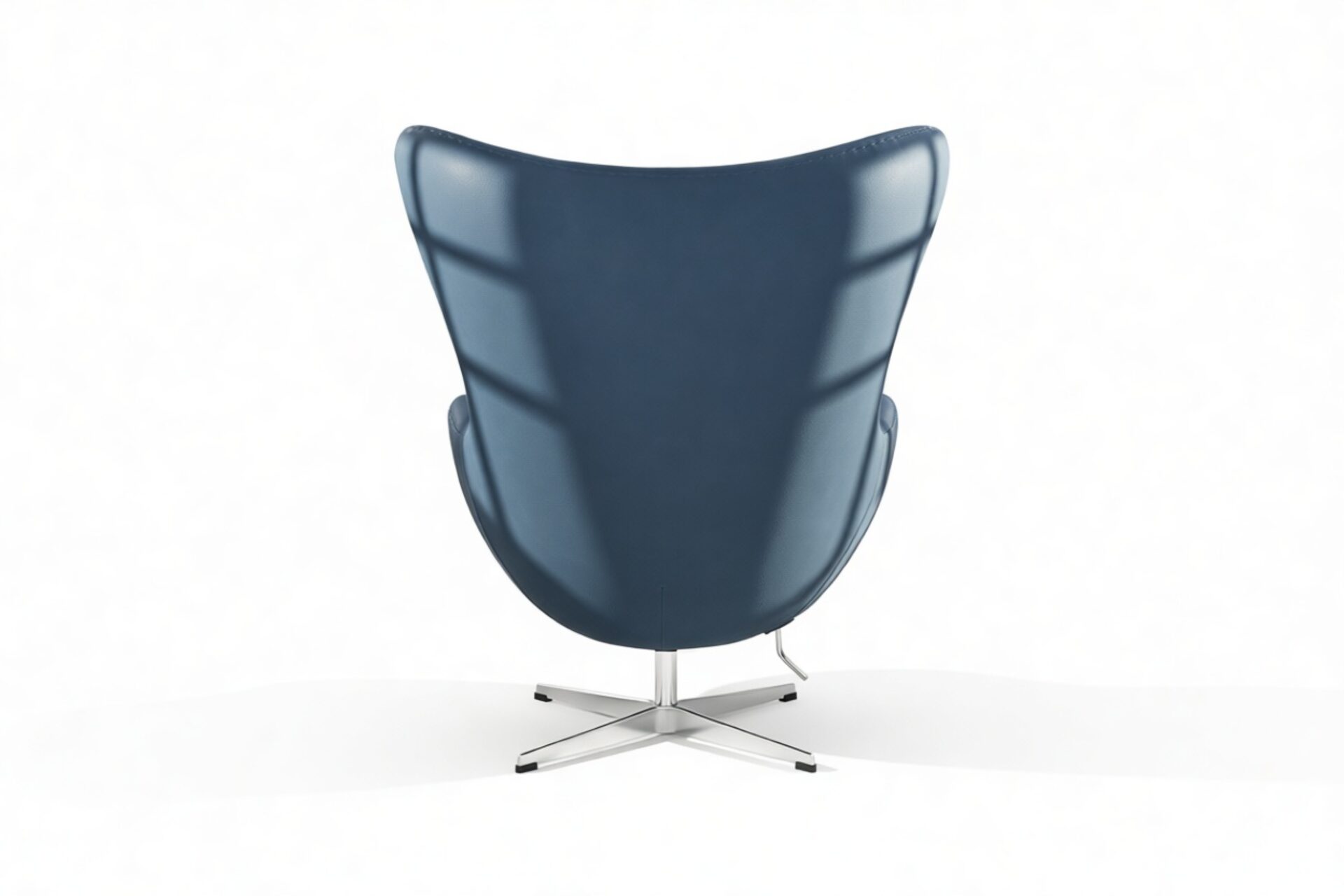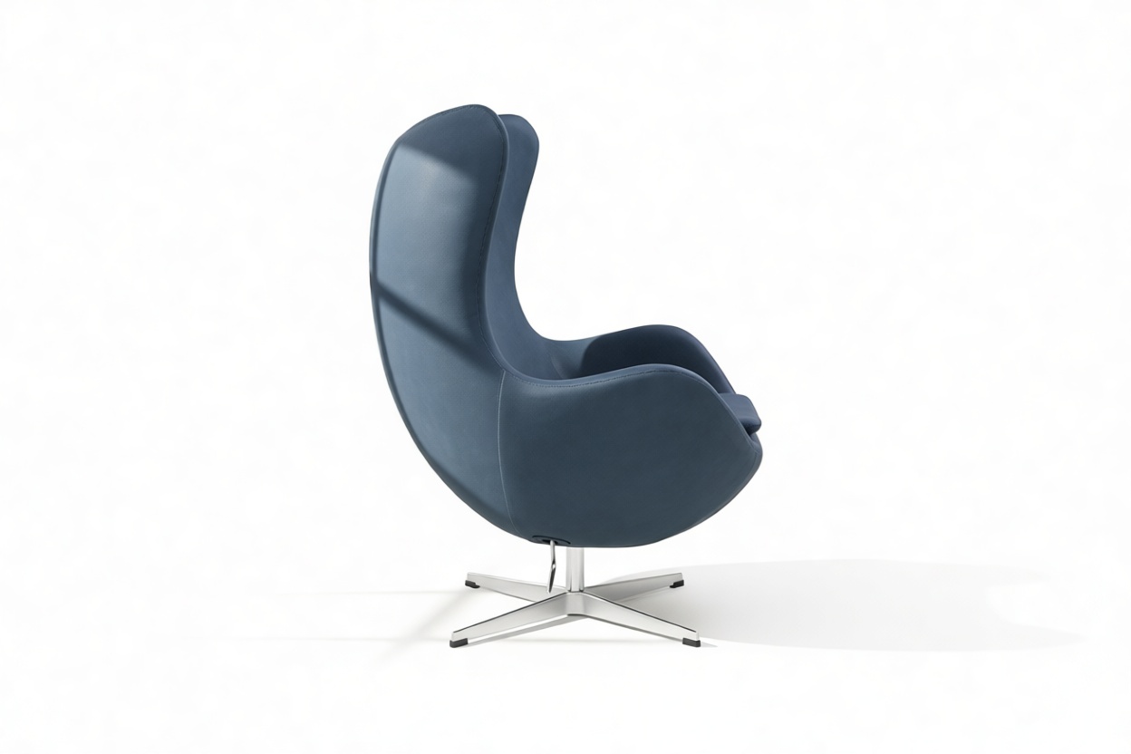 Indulge in the timeless charm of the signature Egg chair, a revered icon inspired by the vibrant aesthetics of the 1950s. Featuring a sturdy metal base for smooth swiveling, its elegantly contoured frame and seat in Vintage Blue Vegan Leather offer luxurious comfort while embodying both form and function, creating an enduring symbol of sophistication. The modern wing chair stands as a symbol of prestige, boasting an iconic design and unmatched ergonomic shape in Vintage Blue Vegan Leather. This distinguished piece seamlessly blends style and comfort, making it a staple in elegant homes and offices worldwide. The celebrated Jacobsen Chair in Vintage Blue Vegan Leather exudes unparalleled luxury with exceptional craftsmanship, hand-stitched details, and premium materials, ensuring durability and timeless elegance for generations to cherish.